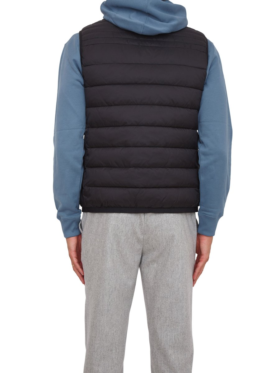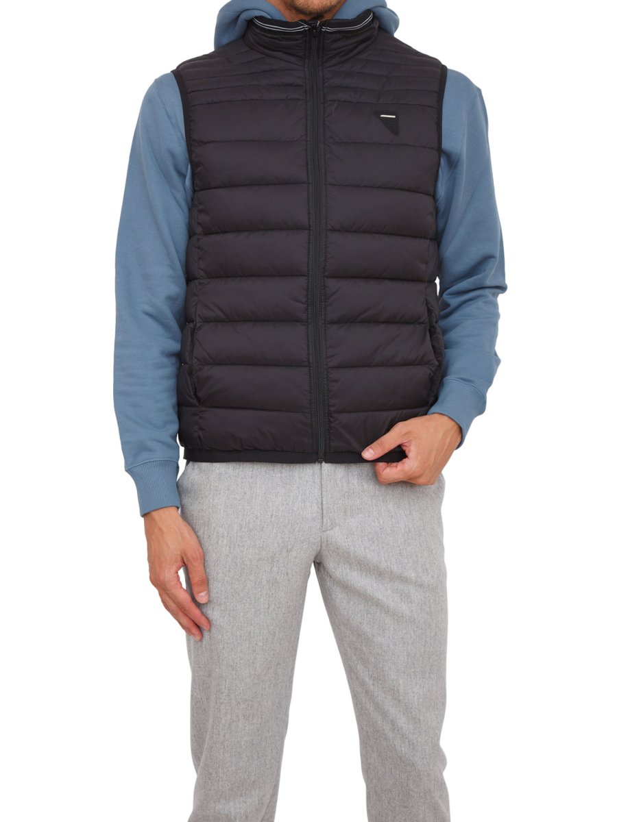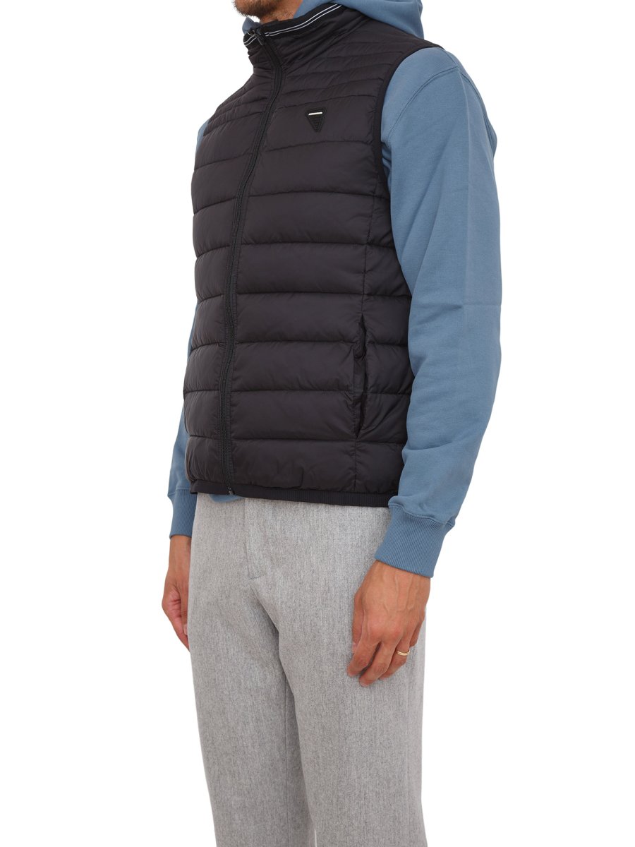 Giubbotto smanicato Antony Morato con vestibilità slim, calda imbottitura eco Sorona® Aura e chiusura con zip. Completa il capo una placchetta logata gommata lato cuore ed un nastro in contrasto colore applicato sul collo.