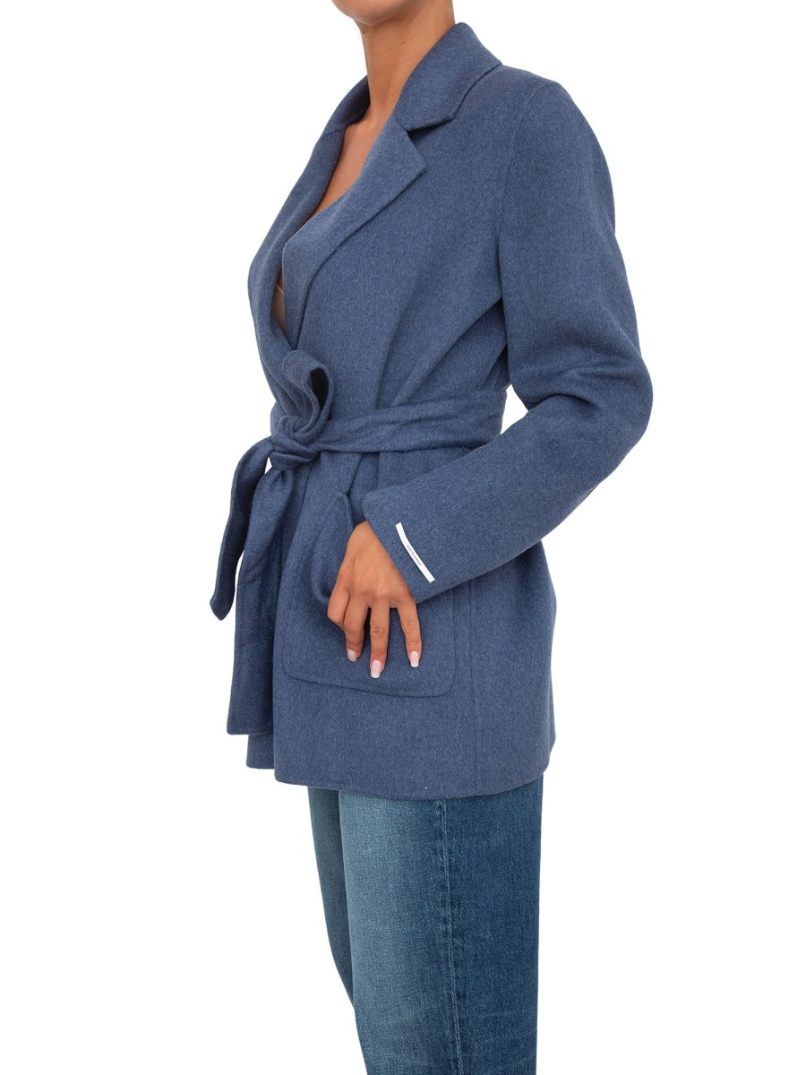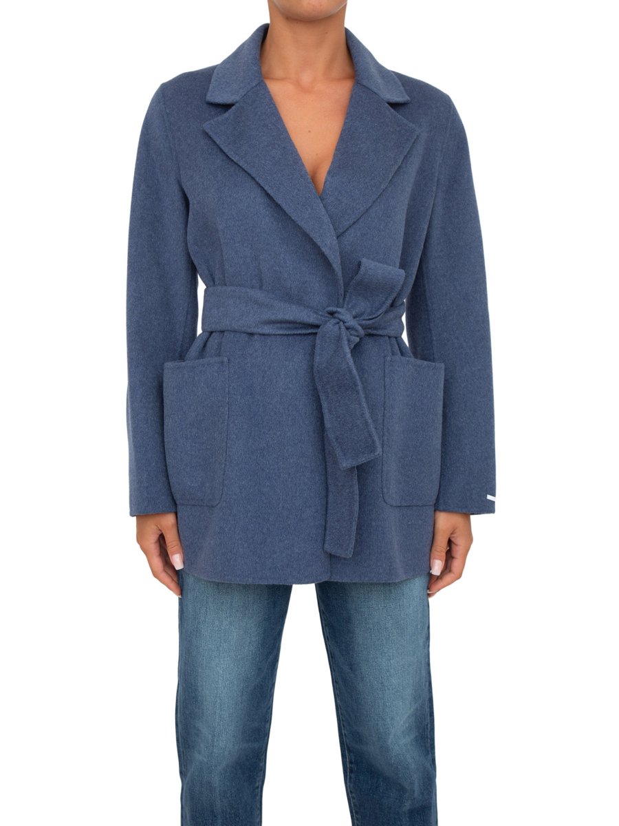 Cappotto Marella realizzato in misto lana, linea dritta. Collo a rever, maniche lunghe. Chiusura con cintura coordinata, tasche applicate. Sfoderato.