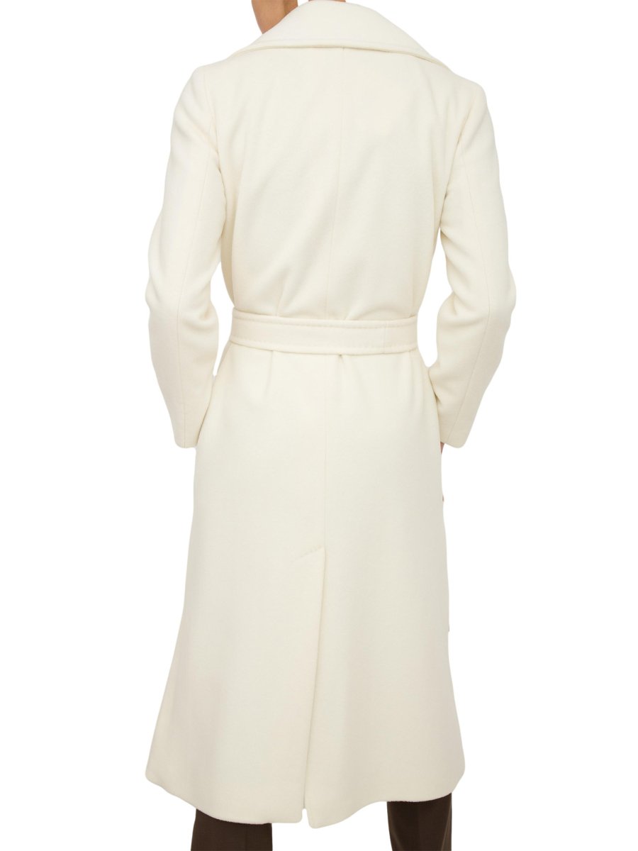 Cappotto lungo in lana, linea dritta. Collo a rever, maniche lunghe. Chiusura a doppiopetto, tasche a filetto. Spacco centrale sul retro. Foderato. Cintura coordinata.