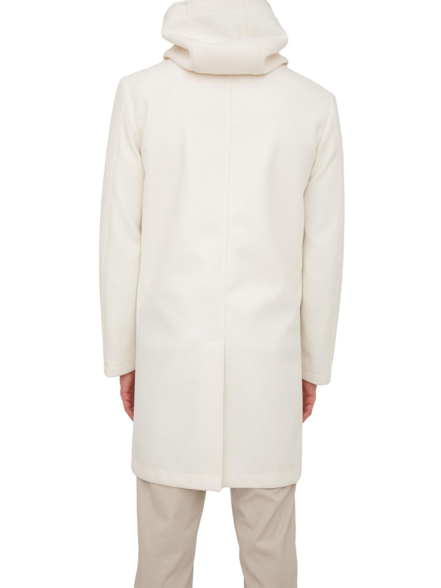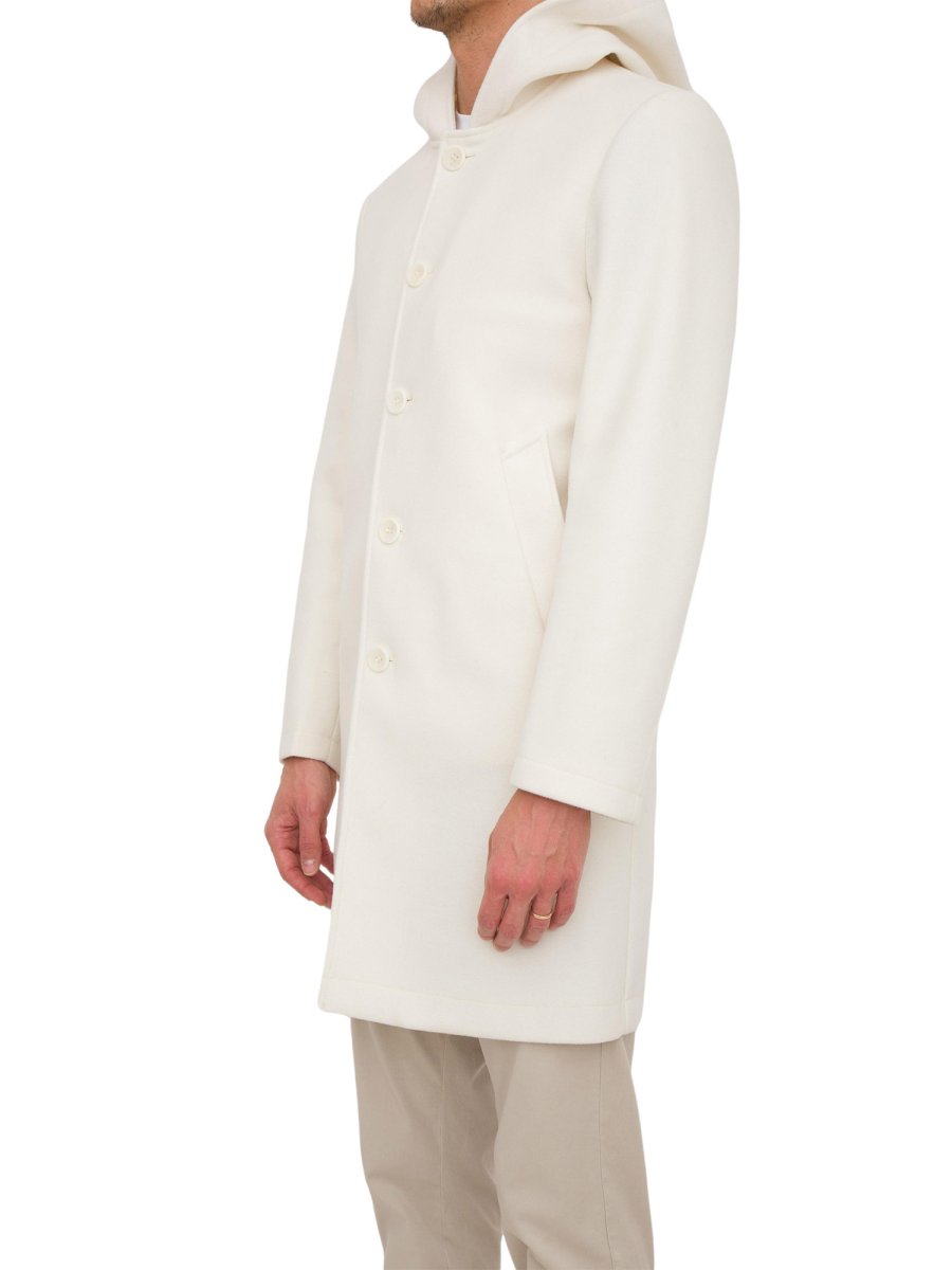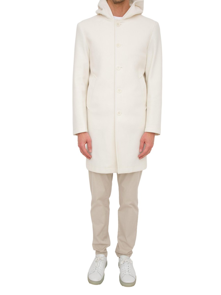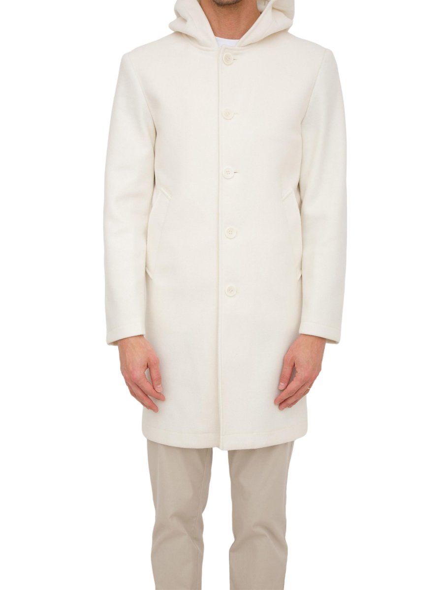 Cappotto da uomo Daniele Alessandrini con cappuccio, tasche laterali e chiusura con bottoni.
