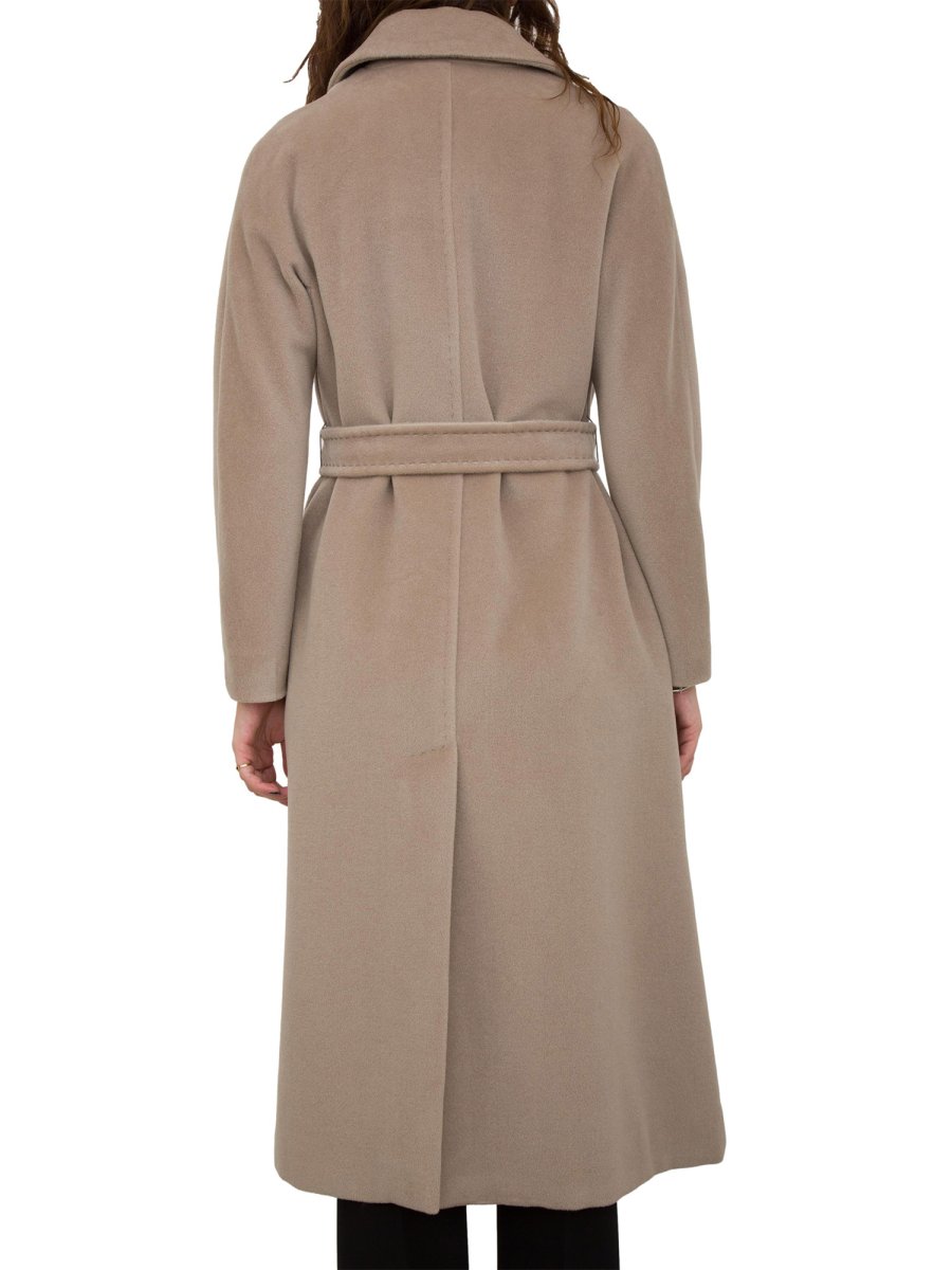 Довге жіноче пальто із запахом Max Mara із натуральної вовни бобра, на підкладці із жакардової тканини. Модель із сорочковим коміром, довгими рукавами-кімоно, потайною застібкою на гудзики спереду та помітною на комірі. Кишені в бокових швах, центральний розріз ззаду, пояс із тканини в тон, який можна зав'язати на талії.