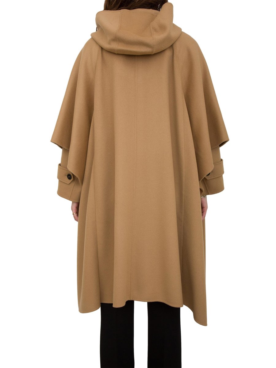 Жіноче пальто оверсайз Max Mara з капюшоном, зшите вручну з тонкої подвійної вовняної тканини. Модель відрізняється двошаровою конструкцією, що створює ефект накидки. Довгі рукави з вирізом реглан ззаду та манжетами на застібці-блискавці. Застібка спереду зі шкіряними та роговими фіксаторами.