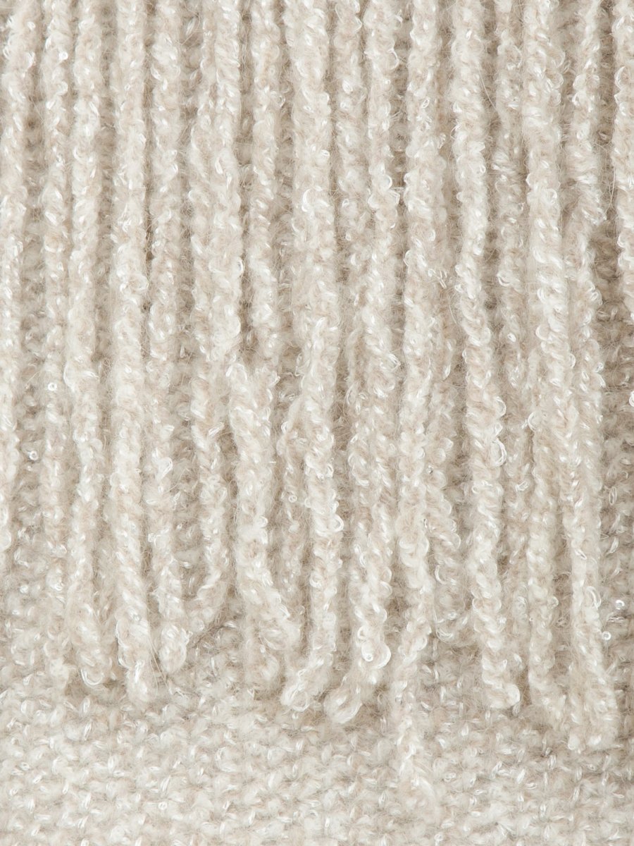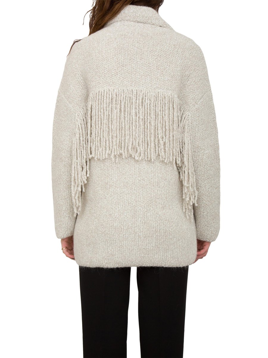 Жіночий двобортний жакет Emme Marella, укорочена модель «кабан», прикрашена мікропаєтками та бахромою, вплетеною на спинці, що надає образу динамічного та яскравого штриху. Виготовлена з мохерового трикотажу, що містить не менше 50% перероблених волокон, модель має вільний крій, комір з лацканами, накладні кишені та двобортну застібку на фірмові гудзики. Застосування бахроми на спинці надає виробу нотки неповторної оригінальності та вишуканості.