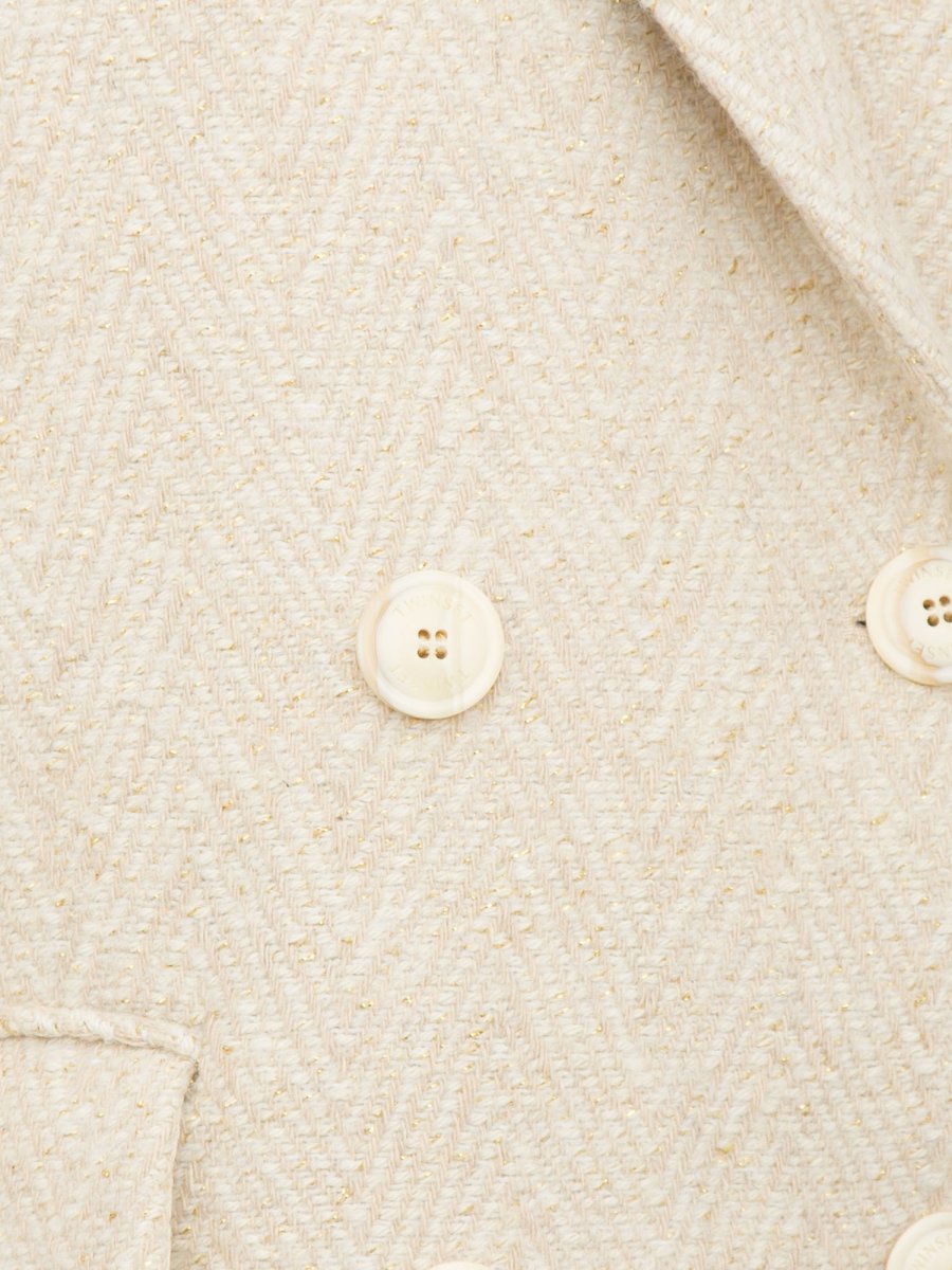 Італійська елегантність із пальто з ламе Twinset. У світло-бежевому кольорі, має візерунок «ялинка» з деталями з люрексу, які створюють легкий відтінок. Дизайн включає двобортну планку на ґудзиках, загострені лацкани, довгі рукави зі спущеними плечима та повну підкладку. Ідеально підходить для вишуканого та сучасного стилю.
