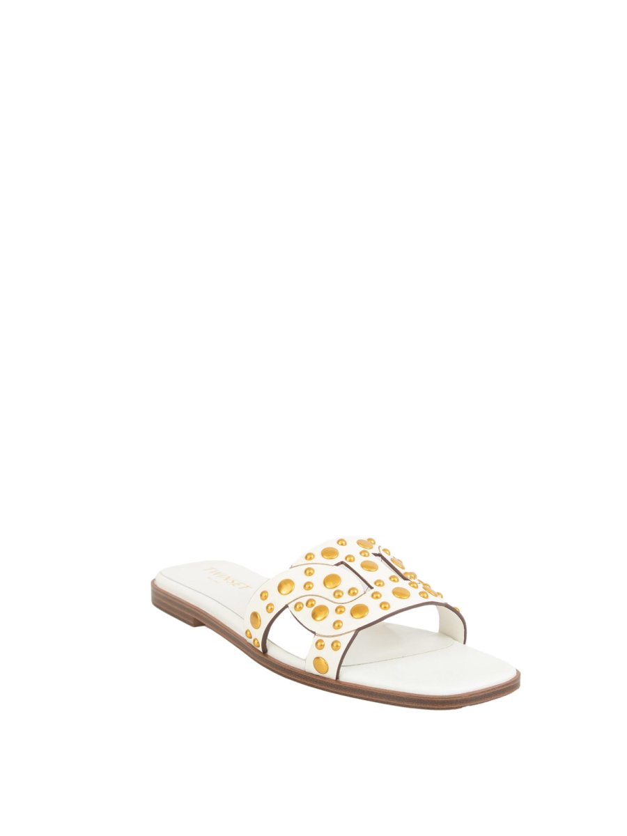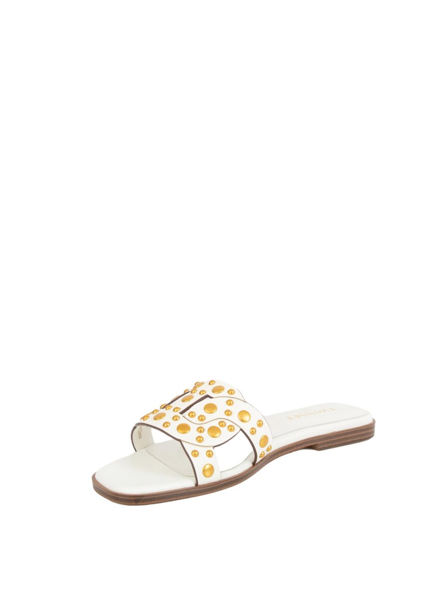 Шкіряні сандалії-слайди з овальною смугою у формі літери Т та мотивом із заклепок. Висота підошви 1,5 см.