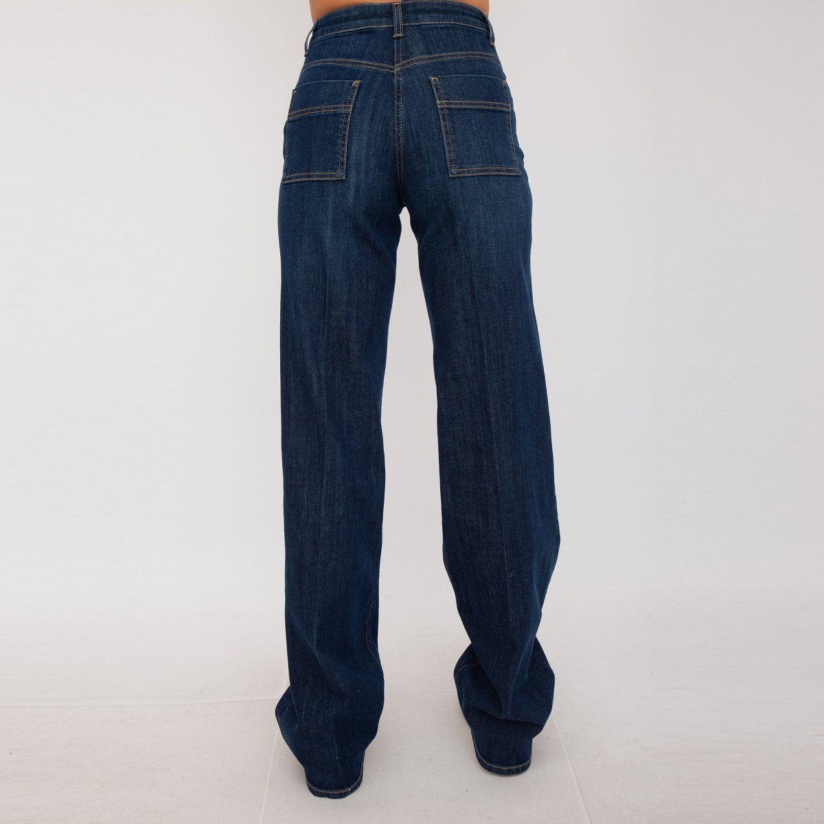 Denim Elisabetta Franchi, gamba palazzo, vita alta e tasche sagomate applicate sopra con con patta e chiusura con girelli lucchetto oro.