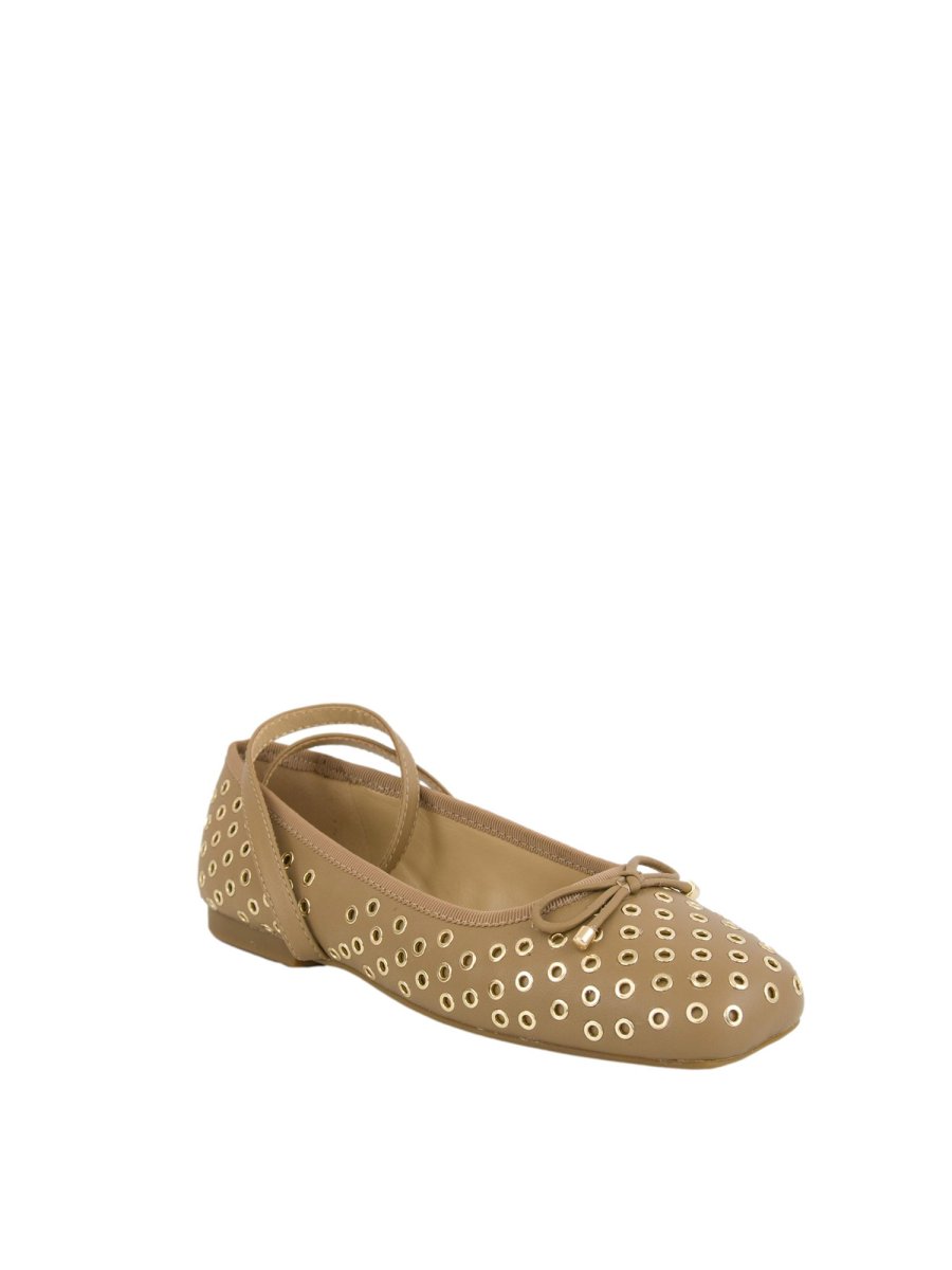 Ці балетки, виготовлені зі шкіри, відрізняються вишуканим квадратним носком та регульованою застібкою-пряжкою на щиколотці, що забезпечує комфорт та стійкість. Дизайн прикрашений декоративними люверсами, які надають виробу нотки індивідуальності та сучасності.