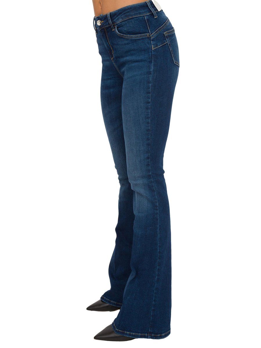 Jeans da donna Liu-Jo realizzati in denim di cotone stretch, lavaggio used, vita regolare, tagli bottom up, modello cinque tasche, gamba flare con piega stirata, elastico in vita sul retro, chiusura con zip nascosta e bottone e logo sul retro.