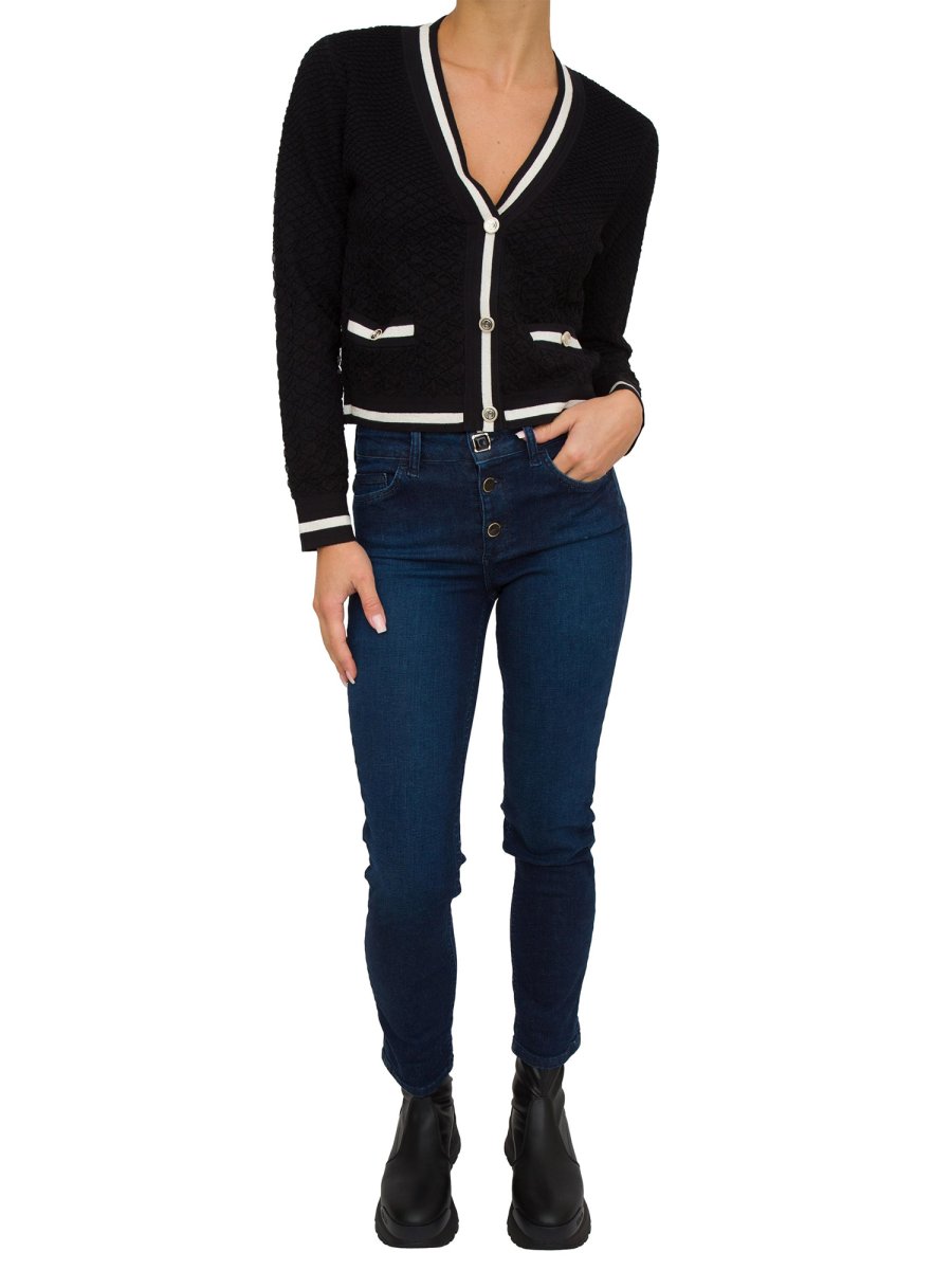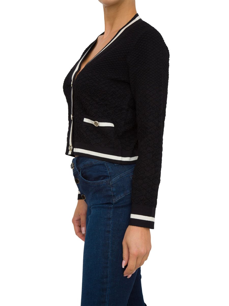 Cardigan da donna LIU-JO in maglia di misto viscosa, motivo jacquard, scollo a V, maniche lunghe, tasche con bottone sui lati e chiusura con bottoni.