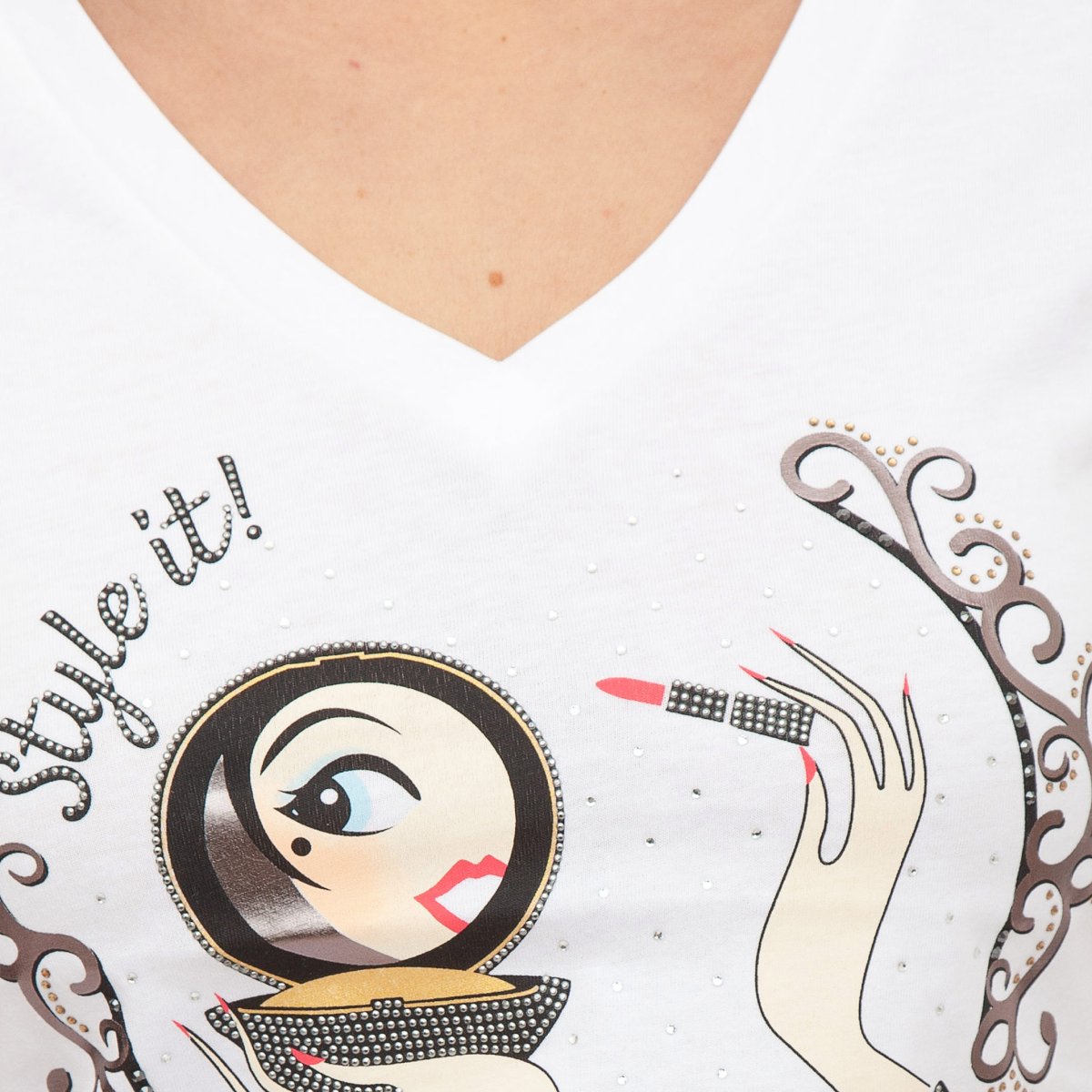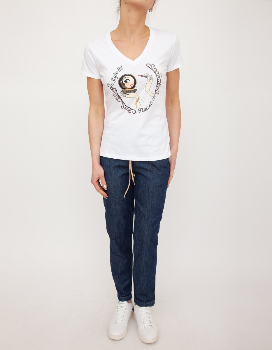 T-shirt ecosostenibile in jersey di cotone, stampa grafica con strass, scollo a V e maniche corte. Prodotto sostenibile "Liu Jo Better"