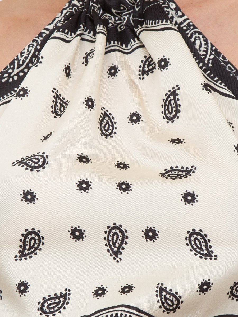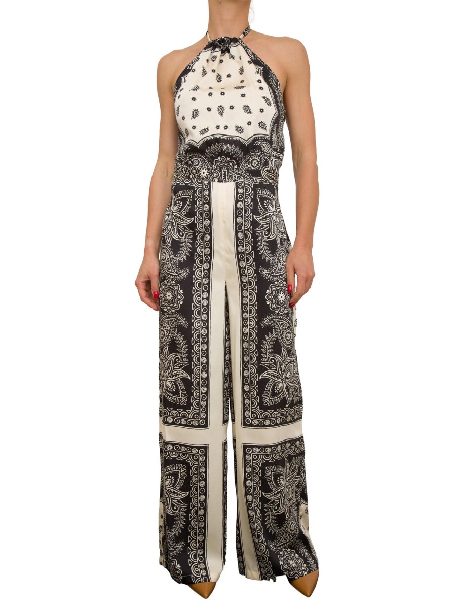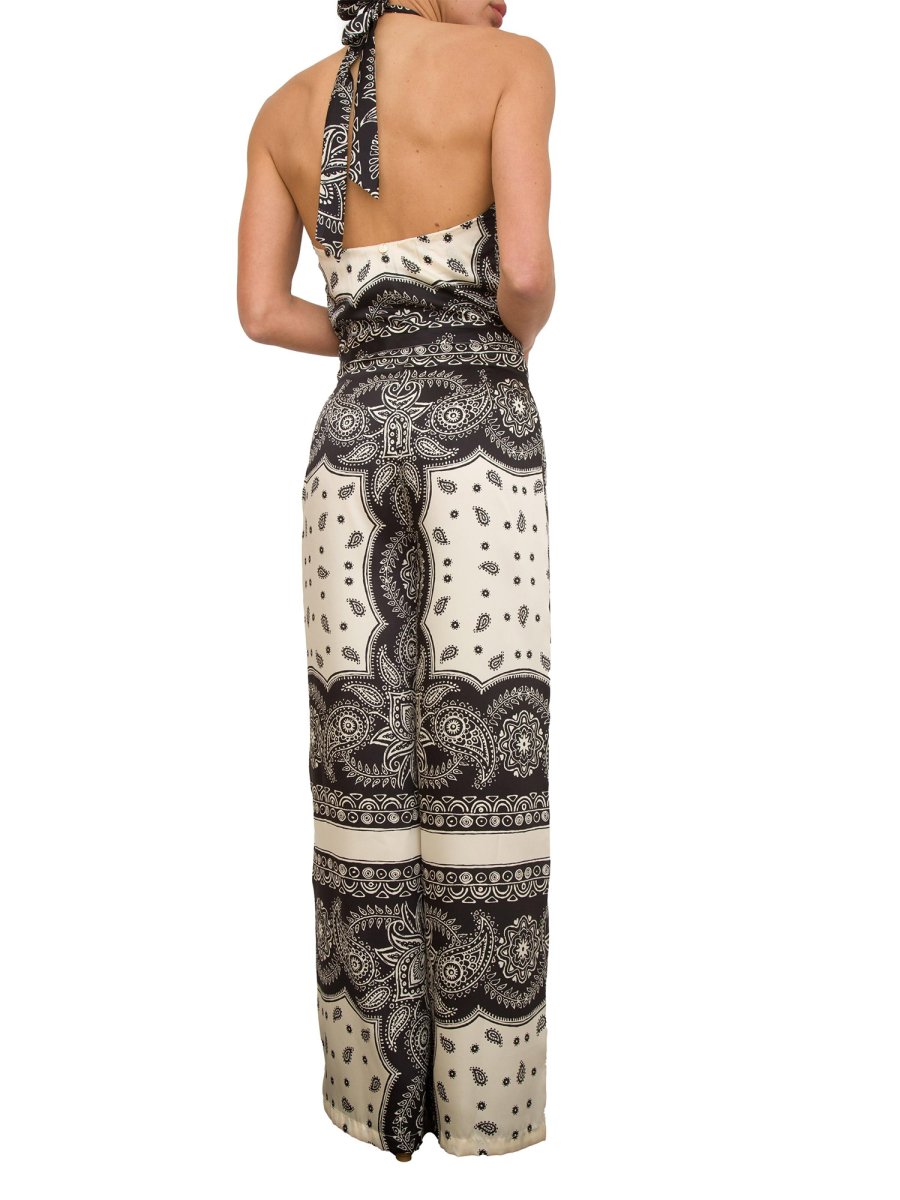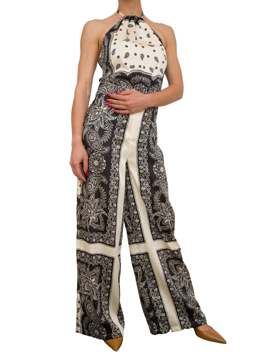 Tuta in raso Liu-jo, stampa bandana all over, scollo all'americana con fiocco che si annoda sul retro e logo in metallo sul retro.