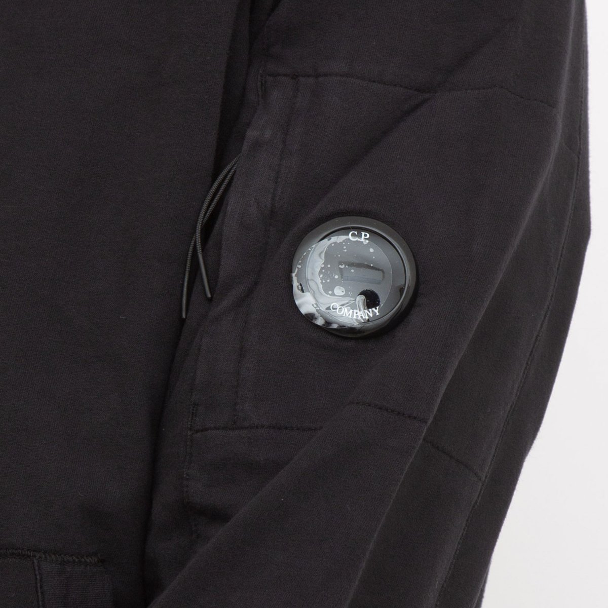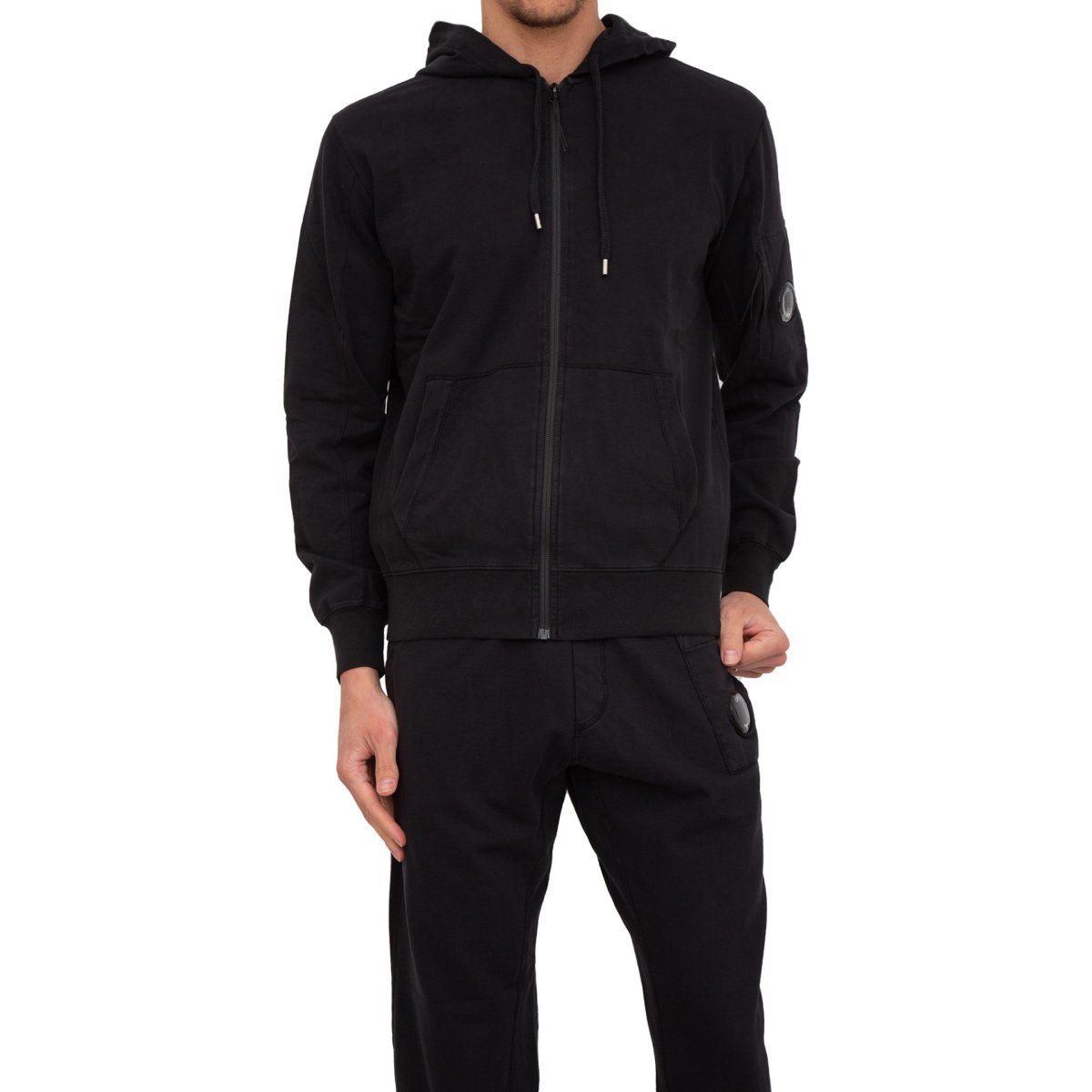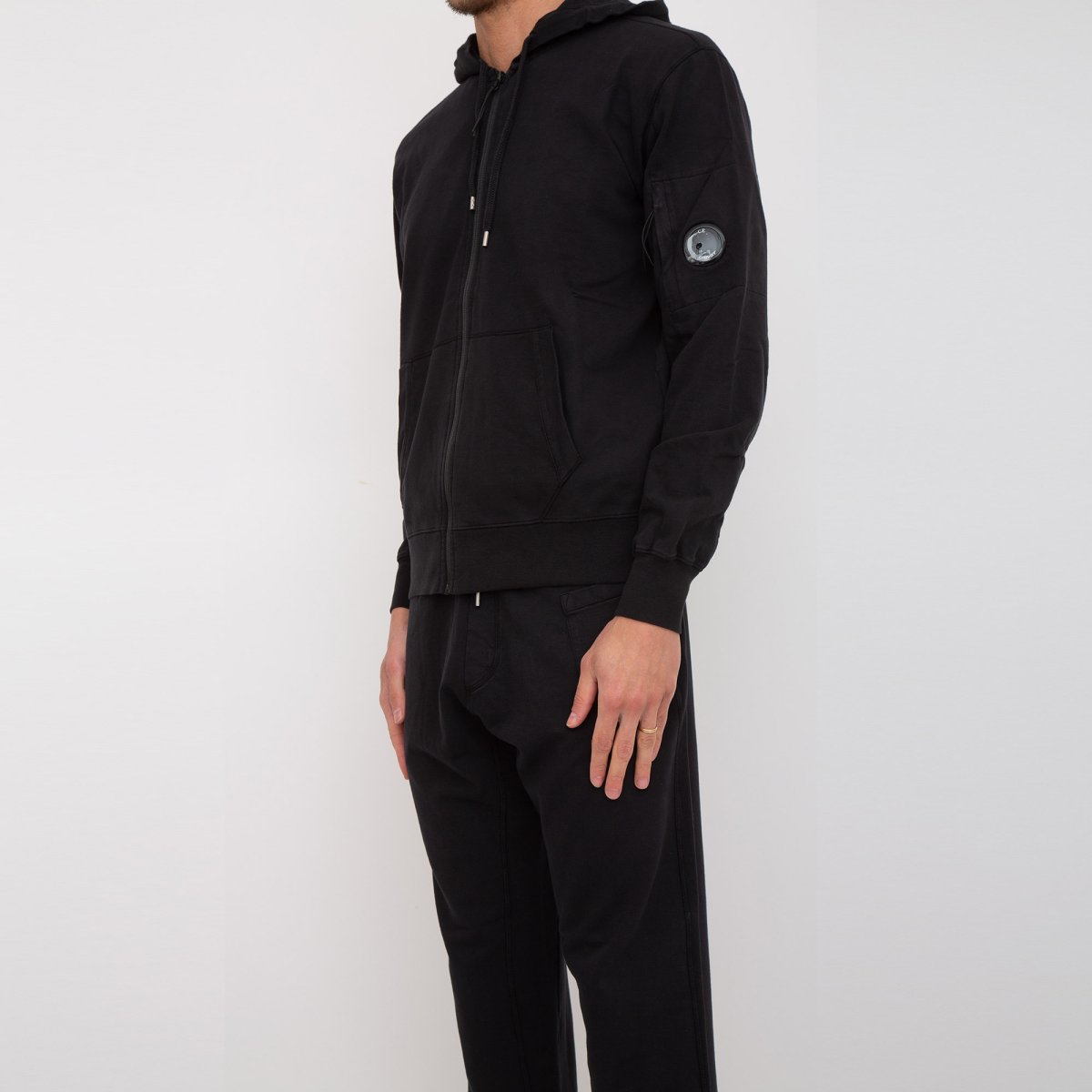 Felpa con cappuccio con coulisse regolabile e logo, chiusura con full zip, tasca a marsupio, polsini e fondo a costine, e lente C.P. Company sul taschino della manica. È realizzata in cotone felpato leggero e tinta in capo, per donare profondità e intensità cromatiche maggiori.