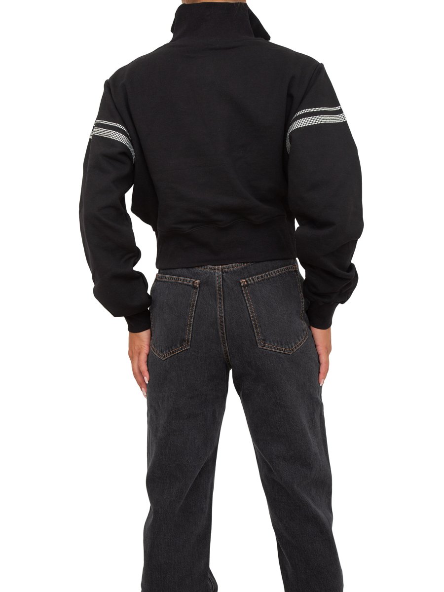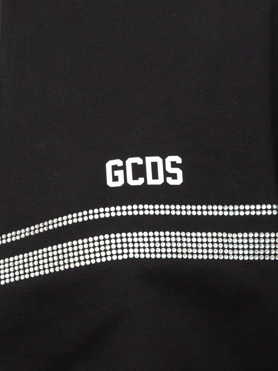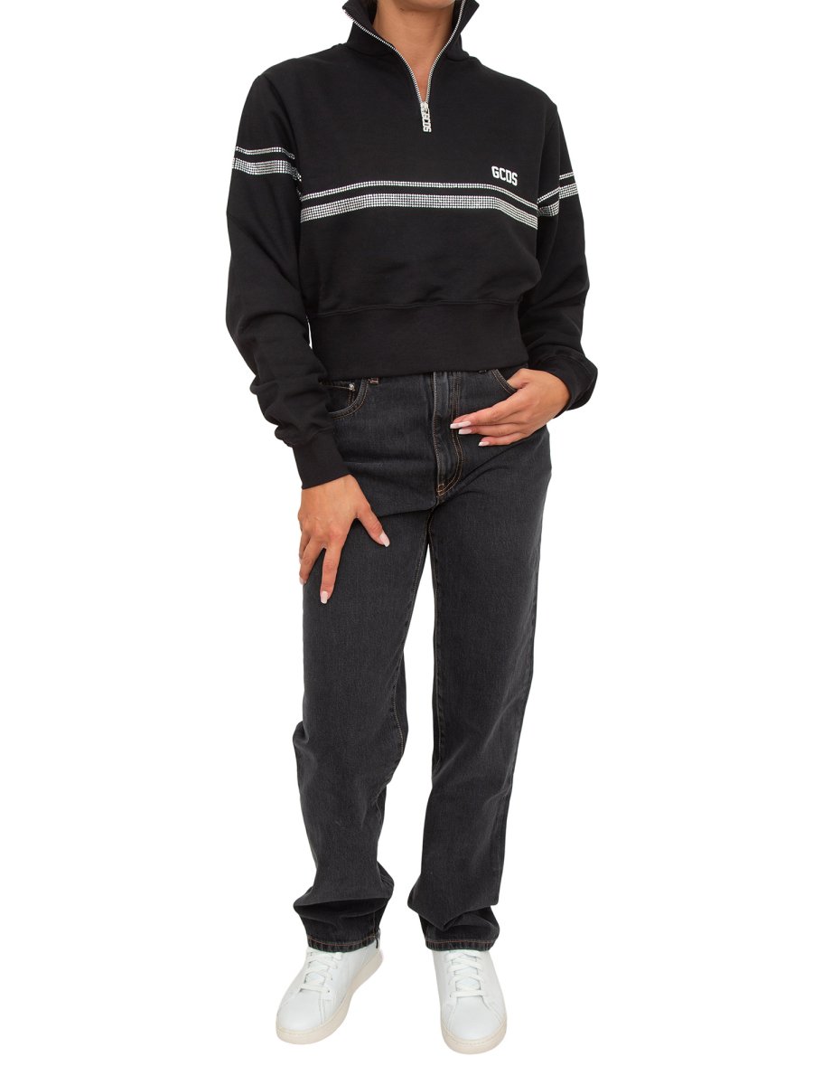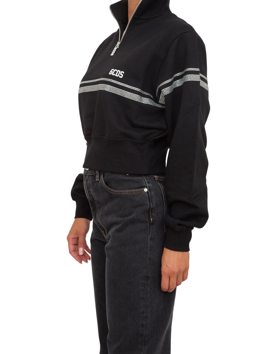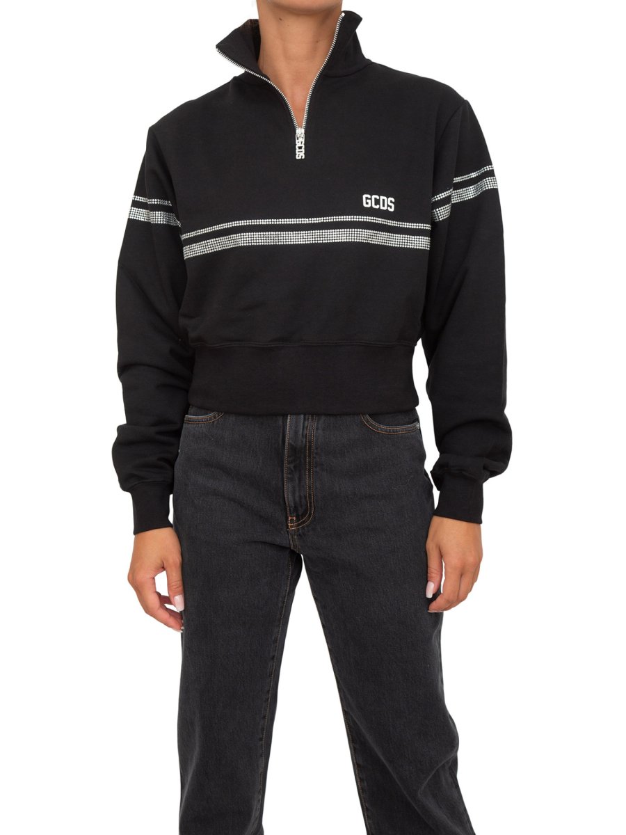 Felpa GCDS Half zip in cotone a collo alto. Taglio crop. Grafica "GCDS Stripes" con termostrass stampata su davanti, dietro e maniche. Logo GCDS e "GCDS Bliss" stampa transfer spessorata sul davanti.