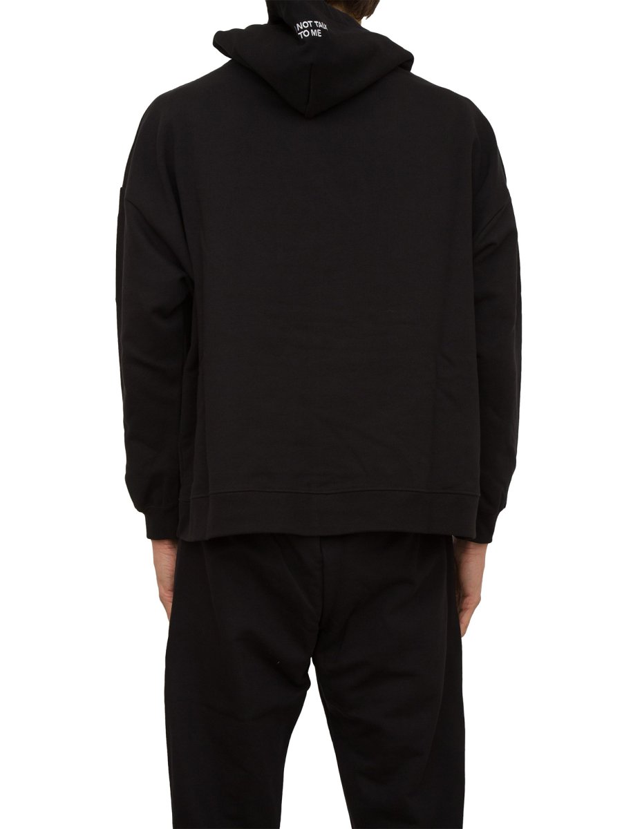 Felpa oversize realizzata in jersey di cotone. Cappuccio regolabile con lacci e finecorda logati. Maniche lunghe con polsino e tasca a marsupio.