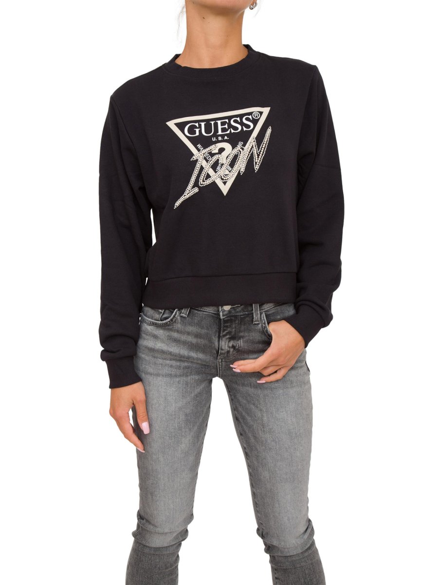 Felpa da donna Guess Jeans realizzata in misto cotone, girocollo, manica lunga, vestibilità regular e logo triangolo Icon con dettaglio di strass.