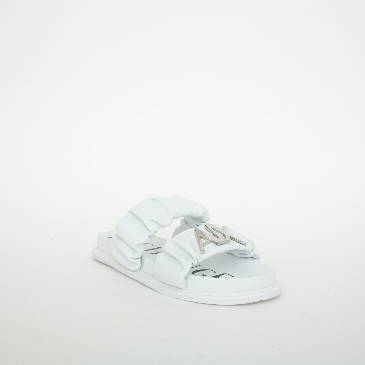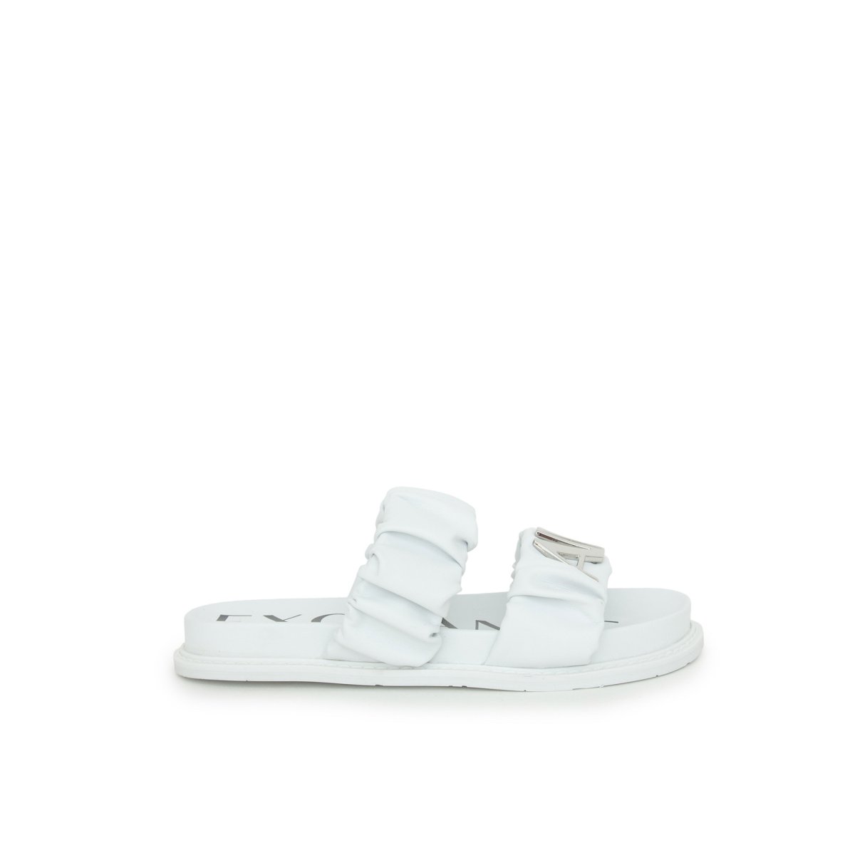 Doppia fascia elasticizzata in eco-nappa, punta squadrata e suola in gomma per i sandali ad alto tasso di femminilità. Impreziosite dall'applicazione logo in metallo, queste calzature doneranno un tocco di grinta a ogni look.