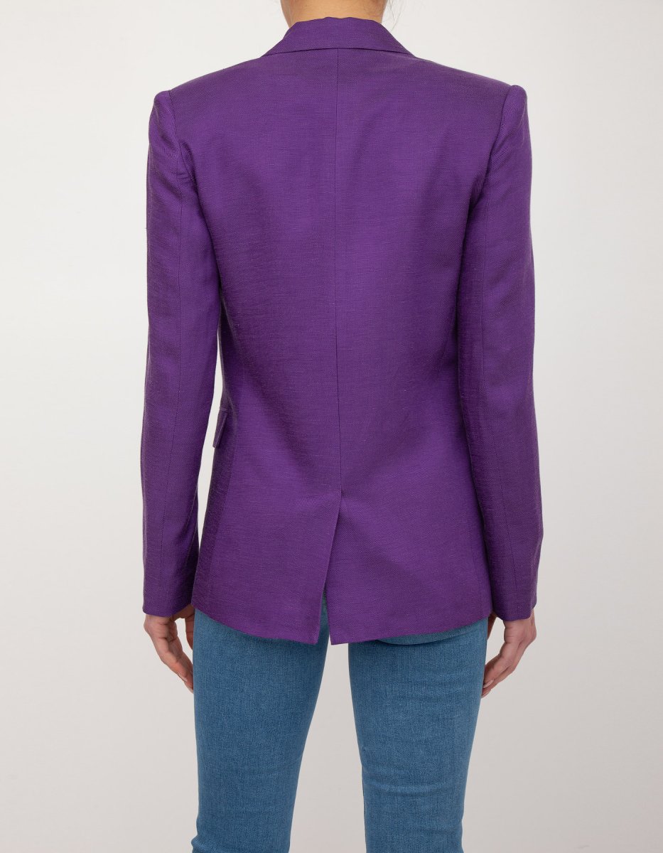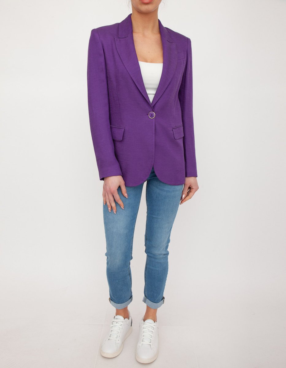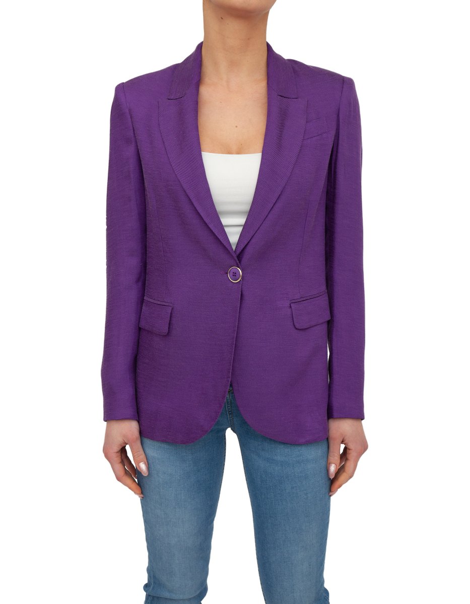 Blazer in misto lino, revers a lancia, tasca a filetto sul petto, tasche con patta sui lati, polsi con bottoni, spacco sul dietro e chiusura monopetto.