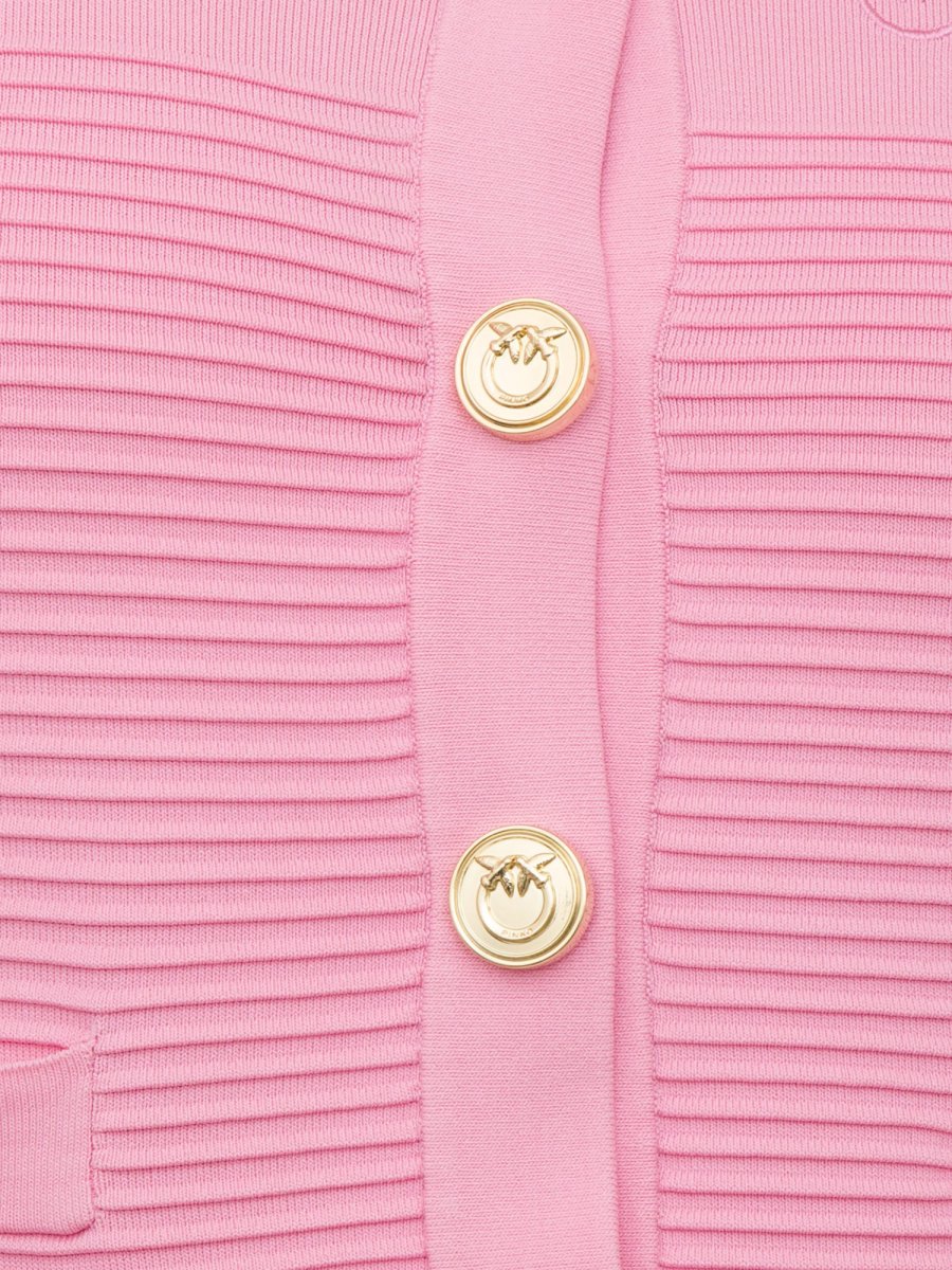 Cardigan corto in maglia di misto viscosa jacquard lavorata a piccole bande, con parte superiore personalizzata da ricamo logo Love Birds, sia davanti che sul retro. Scollo tondo, maniche lunghe e applicazioni effetto taschini sui fianchi. Chiusura con bottoni in metallo davanti.