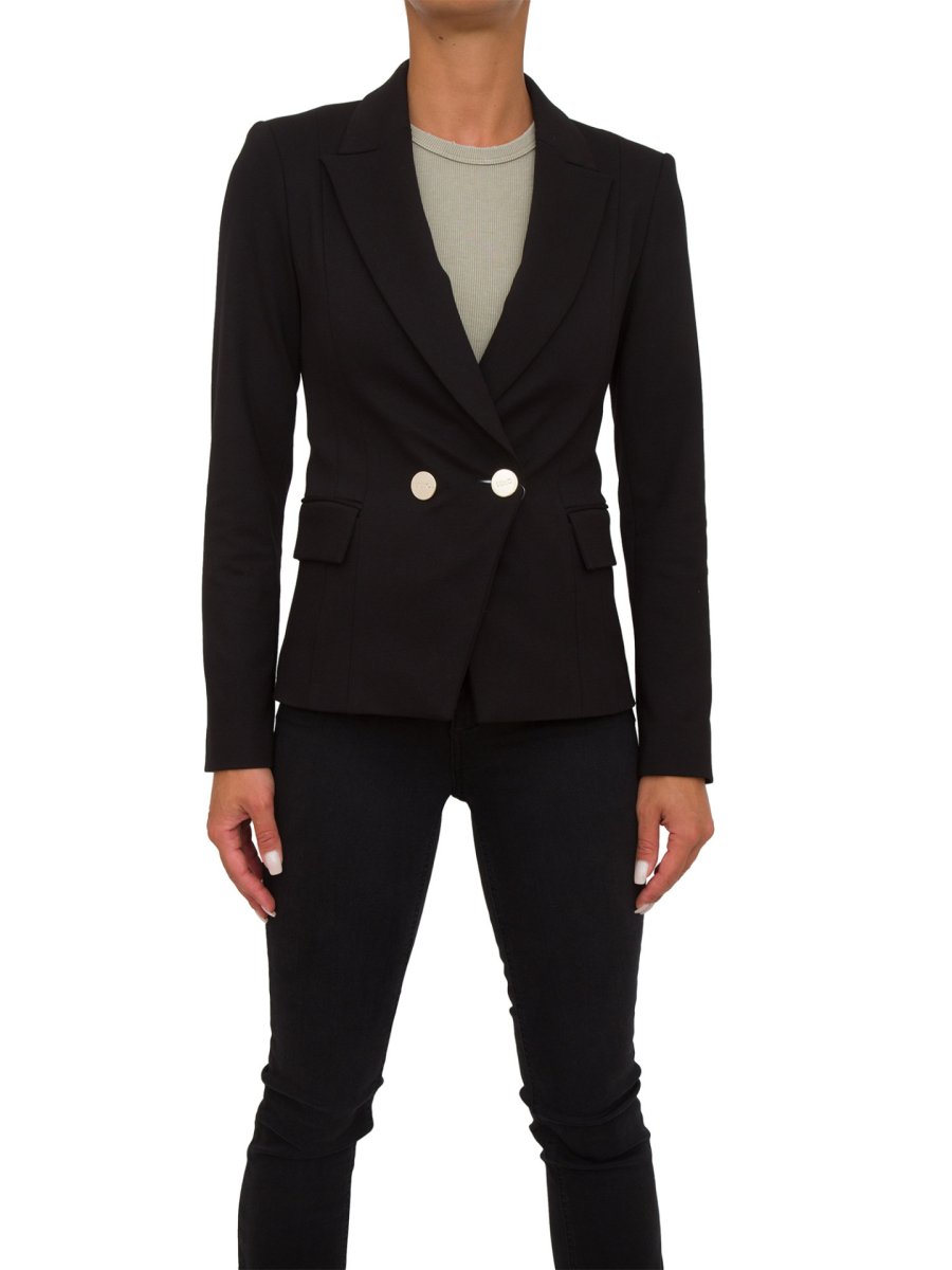 Giacca da donna doppiopetto LIU-JO realizzata in misto viscosa stretch, lavorazione punto Milano, revers a lancia, tasche con patta sui lati e chiusura con bottoni logati.