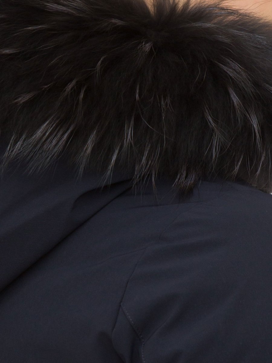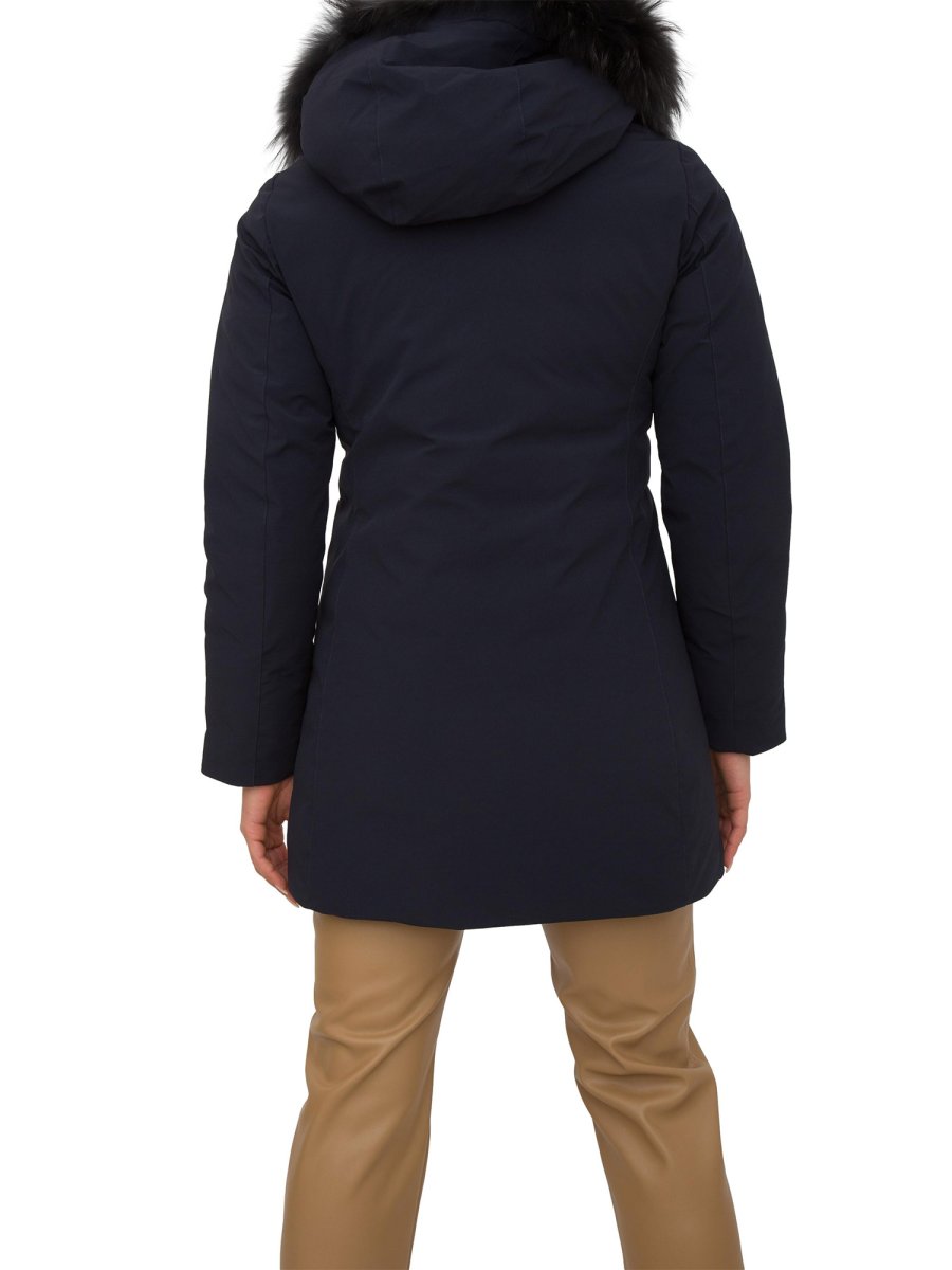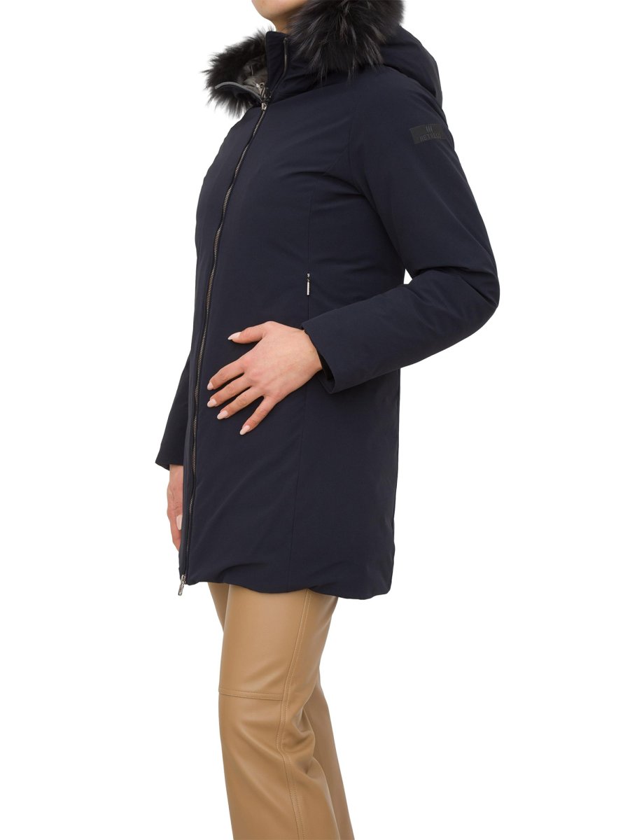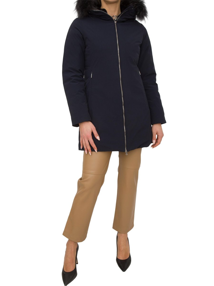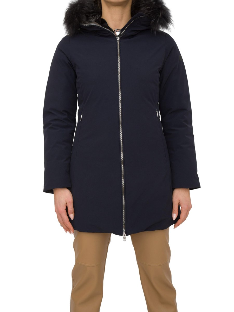 Giaccone da donna Hetregò realizzato in tessuto tecnico ed imbottito in piumino, chiusura centrale con zip, pratiche tasche laterali e cappuccio fisso bordato con pelliccia in murmasky. Elasticizzato, idrorepellente ed antivento.