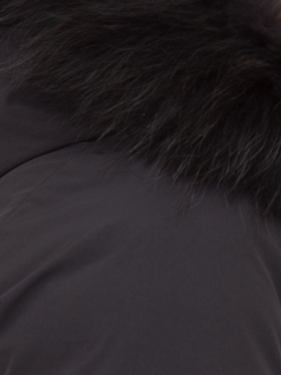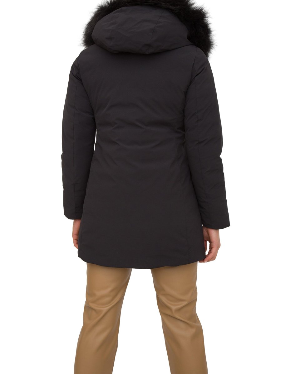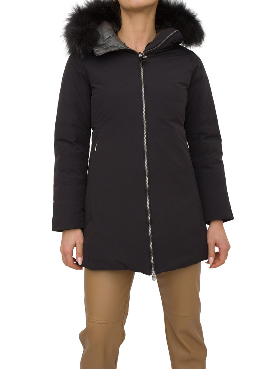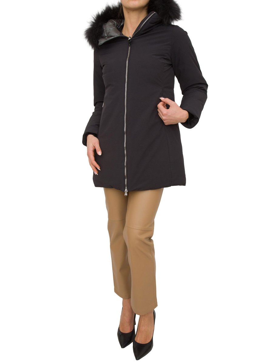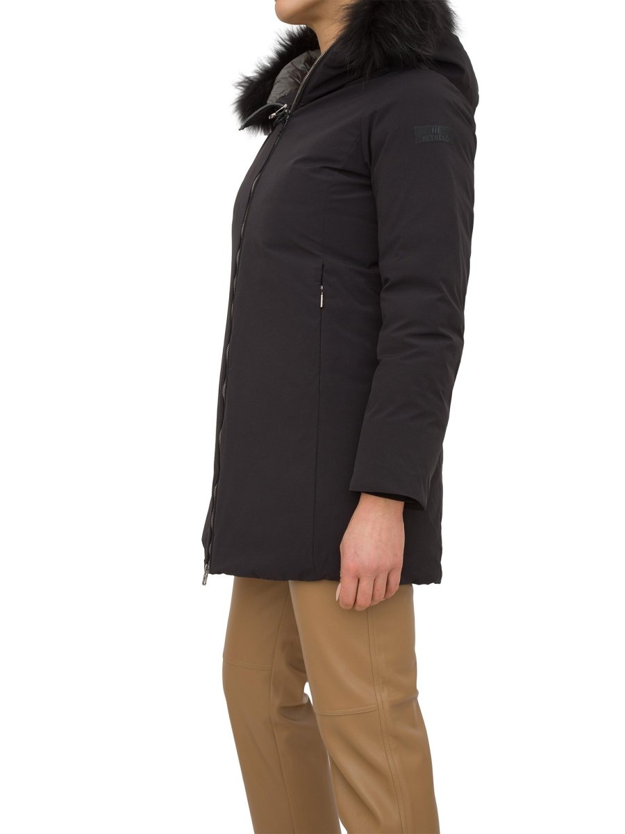 Giaccone da donna Hetregò realizzato in tessuto tecnico ed imbottito in piumino, chiusura centrale con zip, pratiche tasche laterali e cappuccio fisso bordato con pelliccia in murmasky. Elasticizzato, idrorepellente ed antivento.