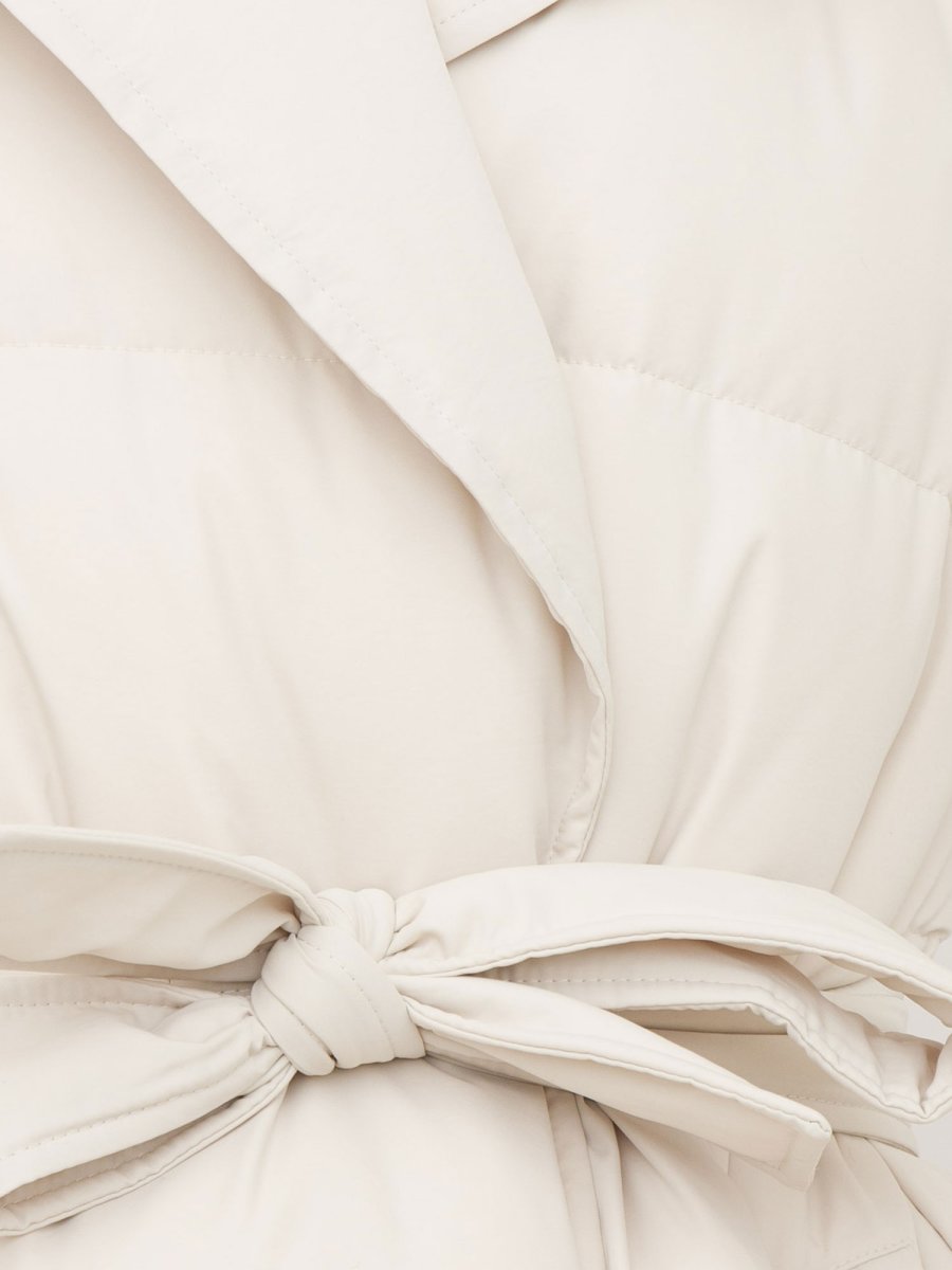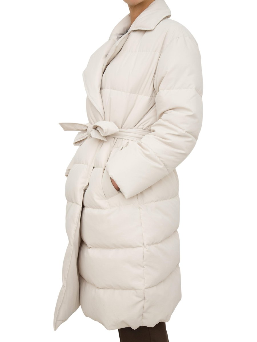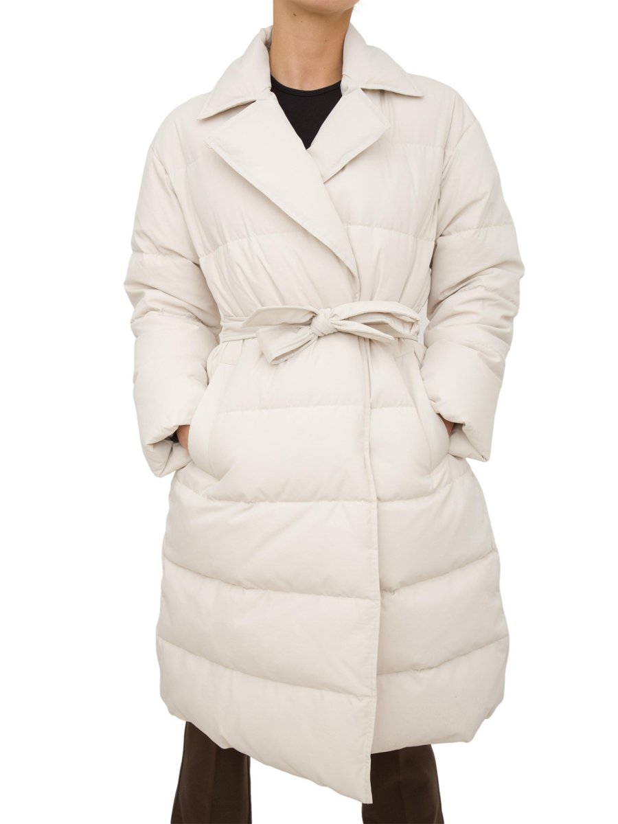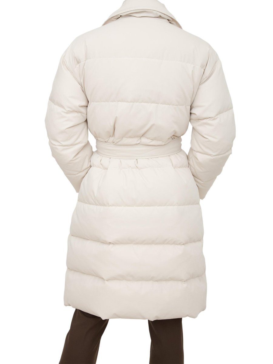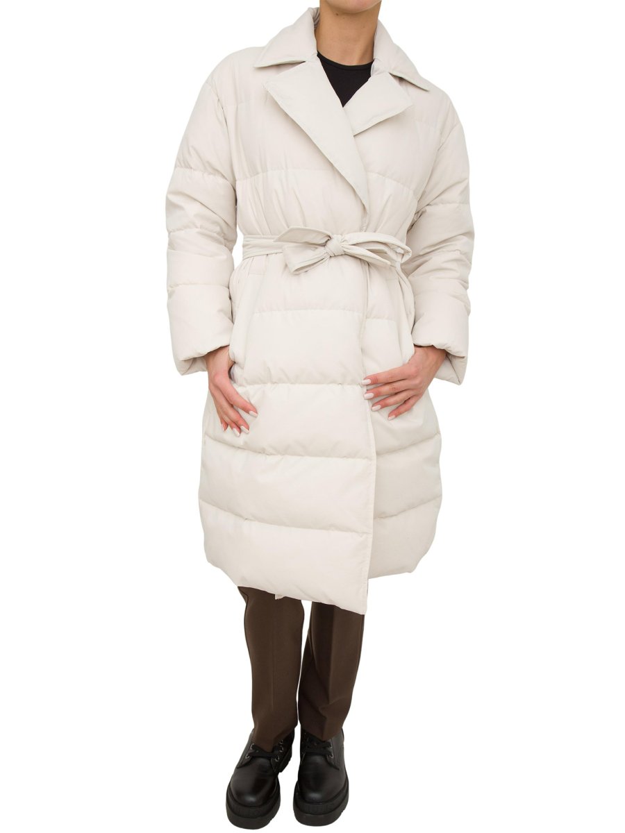 Piumino lungo in tela antigoccia, linea dritta. Collo a rever, maniche lunghe con giro sceso. Chiusura a doppiopetto con automatici nascosti, tasche a filetto. Cintura coordinata.