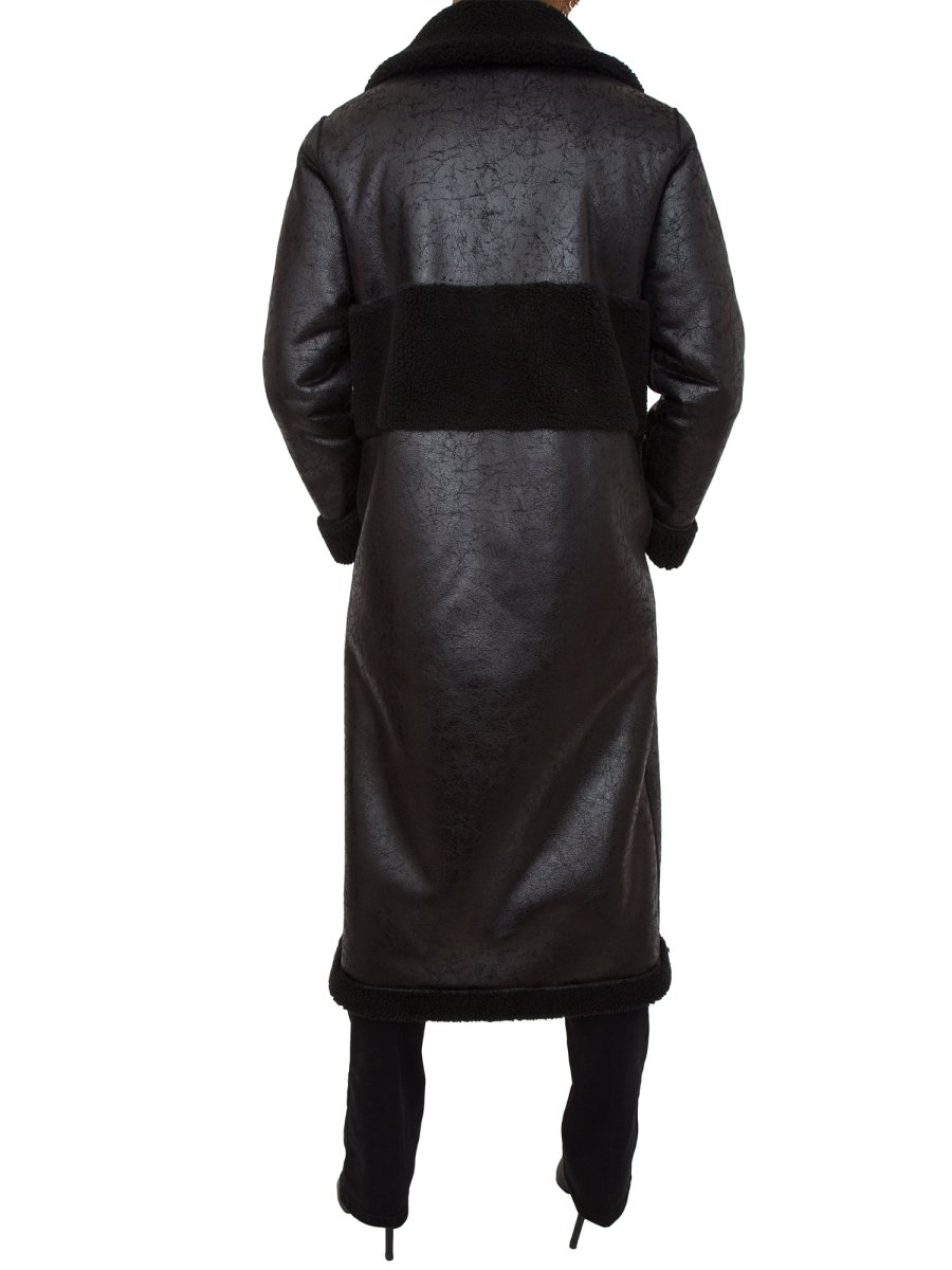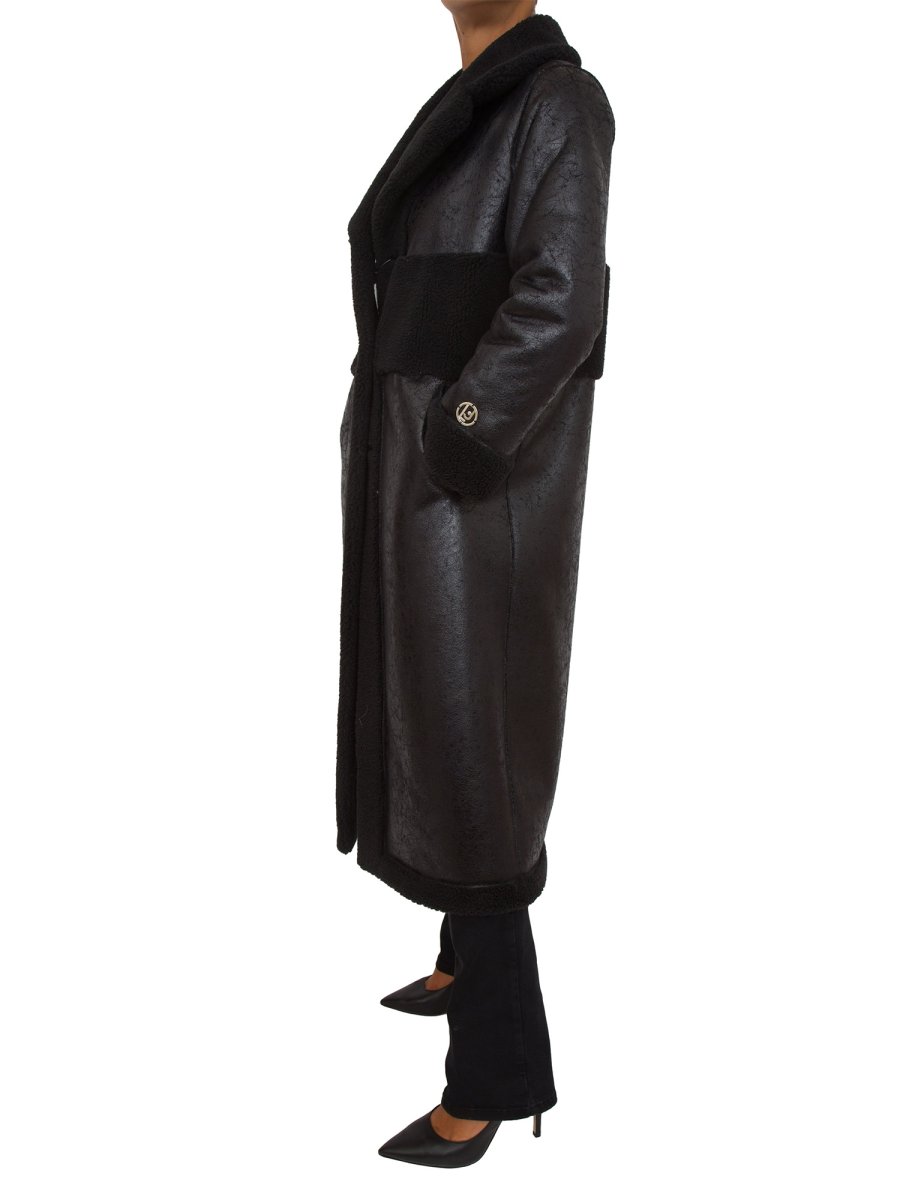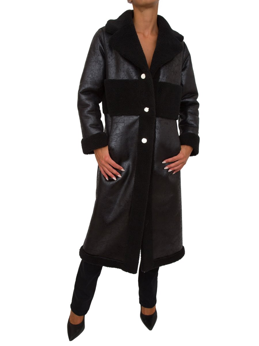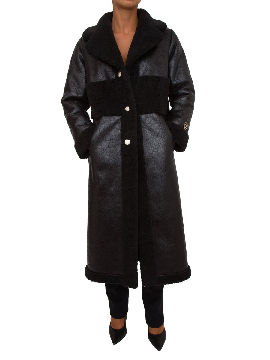 Cappotto donna LIU-JO reversibile in teddy e tessuto spalmato, scollo a V con revers, tasche sui lati, logo in metallo sul polso e chiusura con bottoni gioiello.