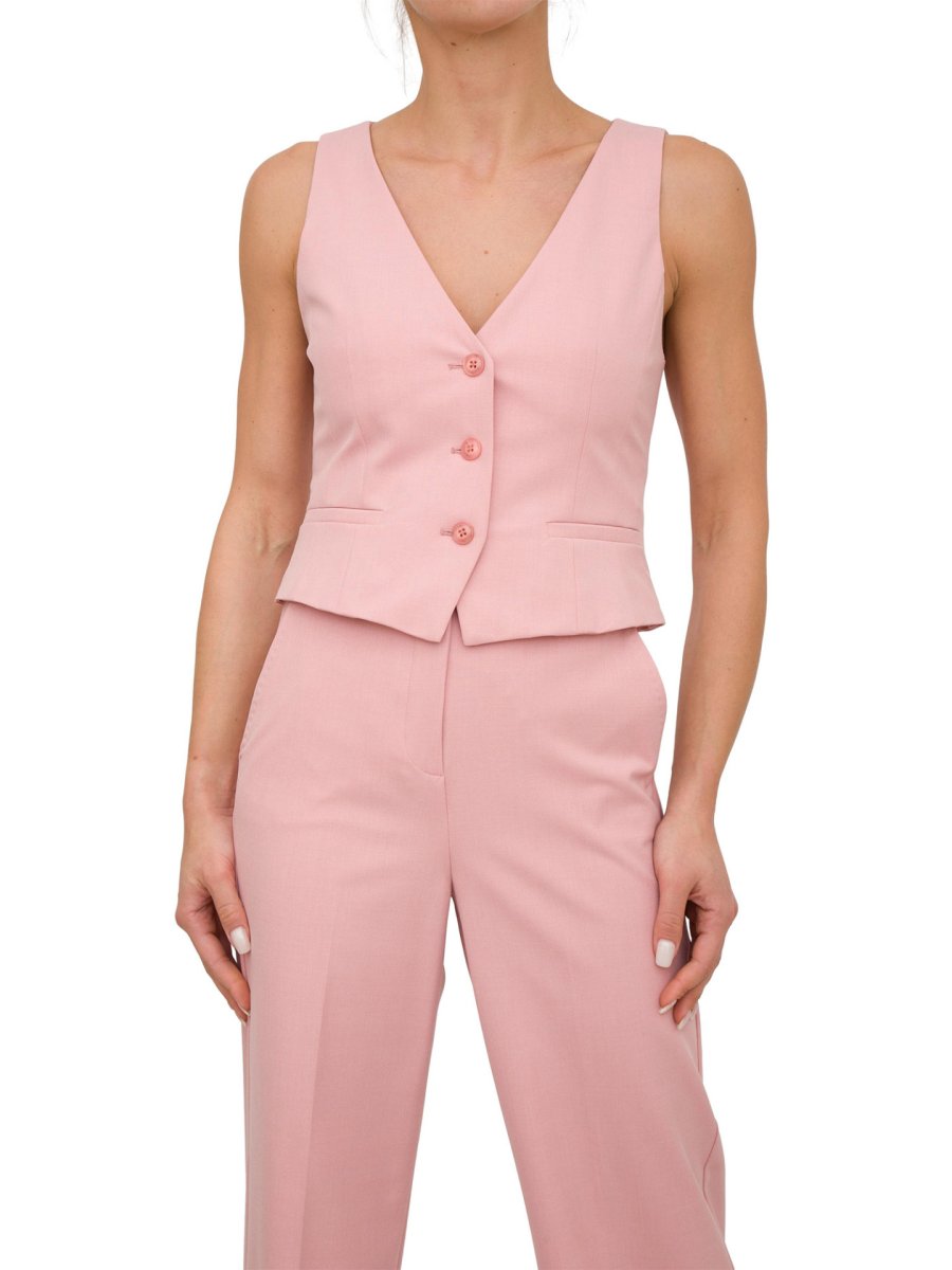 Gilet in tela stretch, linea semiaderente. Scollo a V, senza maniche. Chiusura con bottoni, tasche a filetto. Foderato.