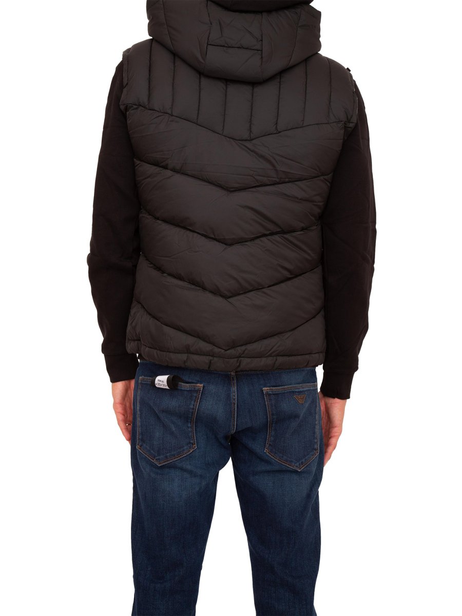 Gilet da uomo stile piumino Guess Jeans in tessuto sintetico, girocollo con cappuccio, senza maniche, vestibilità regular e chiusura con cerniera.