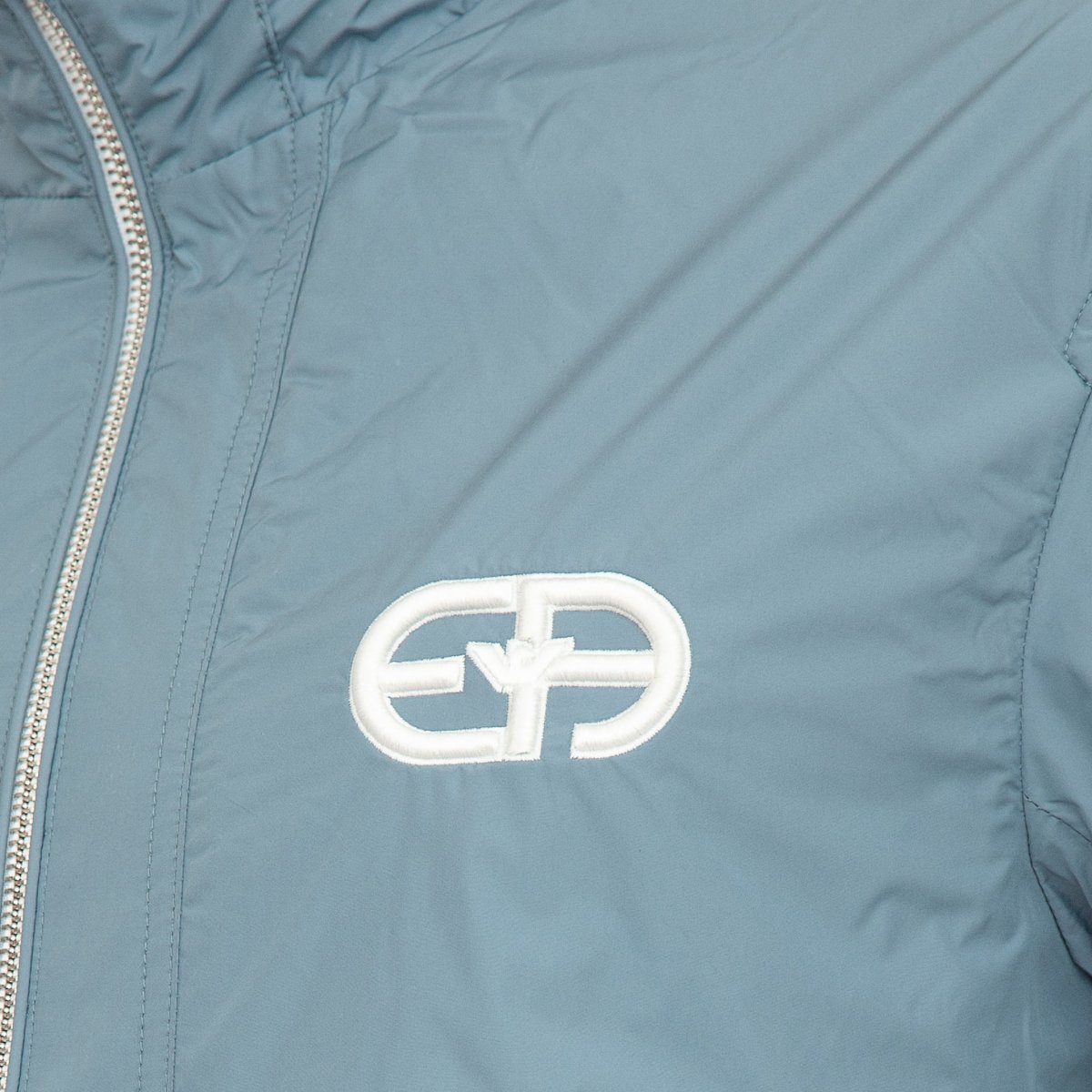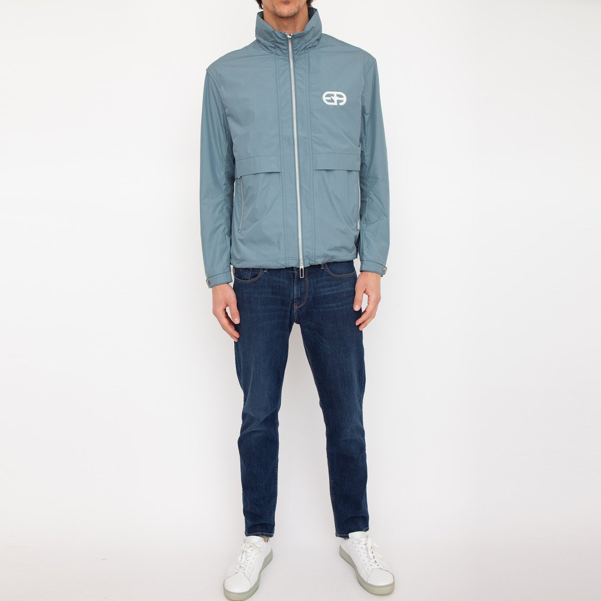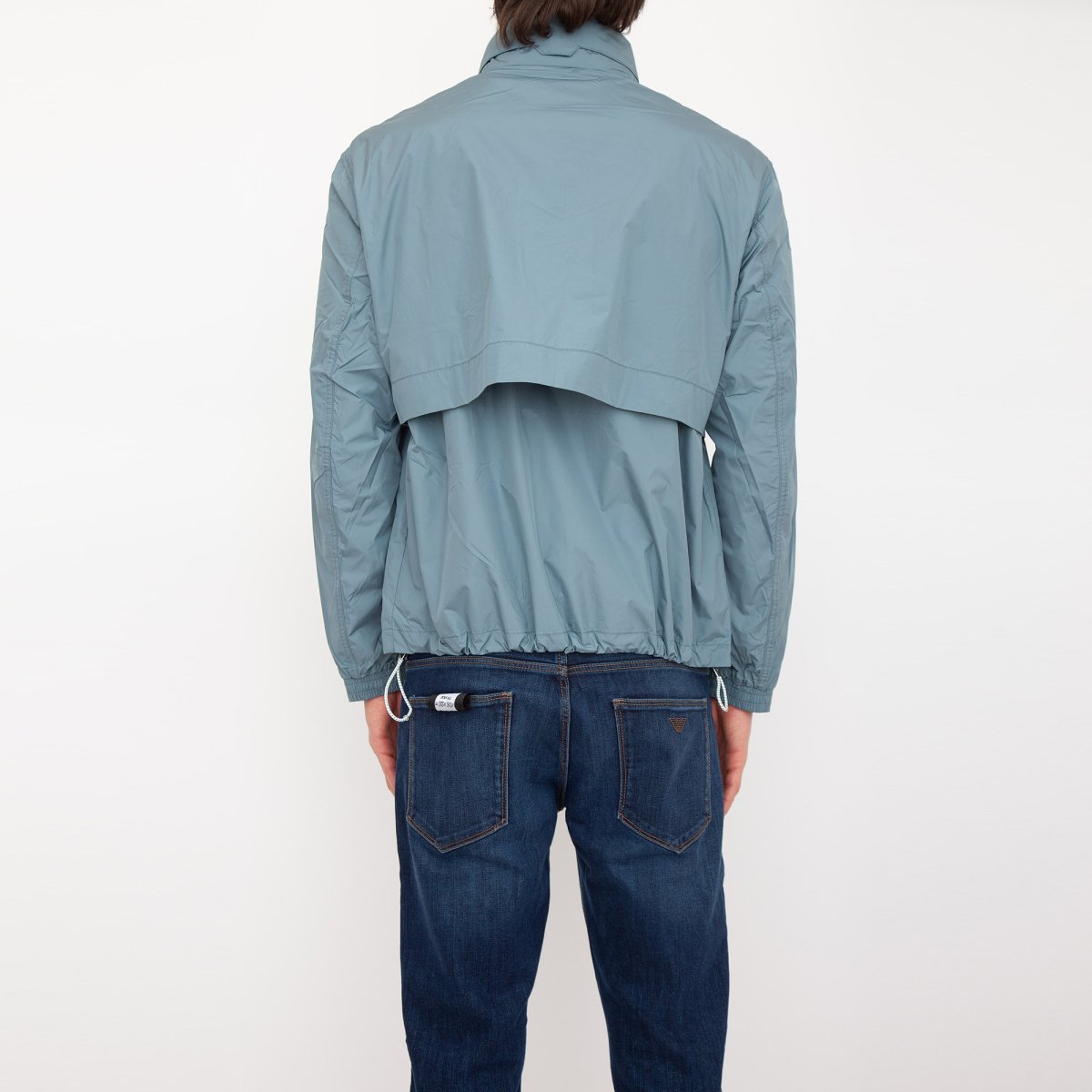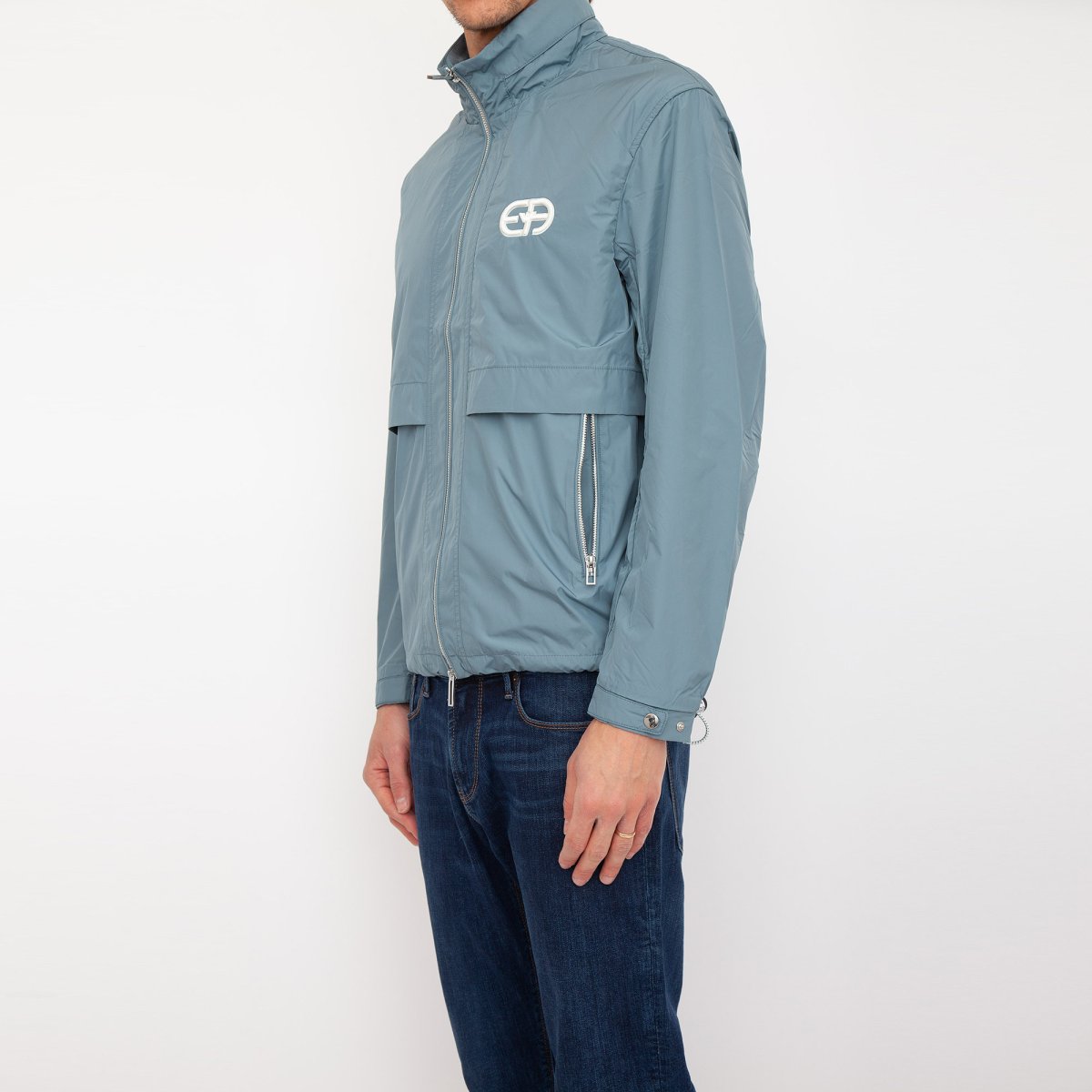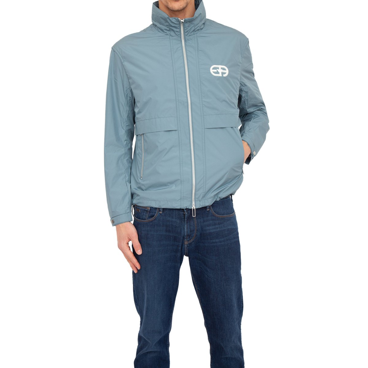 Giacca a strati Emporio Armani, toppa con logo sul petto, cappuccio a scomparsa, colletto rialzato, chiusura frontale con zip a doppio cursore e due tasche laterali chiuse da zip.