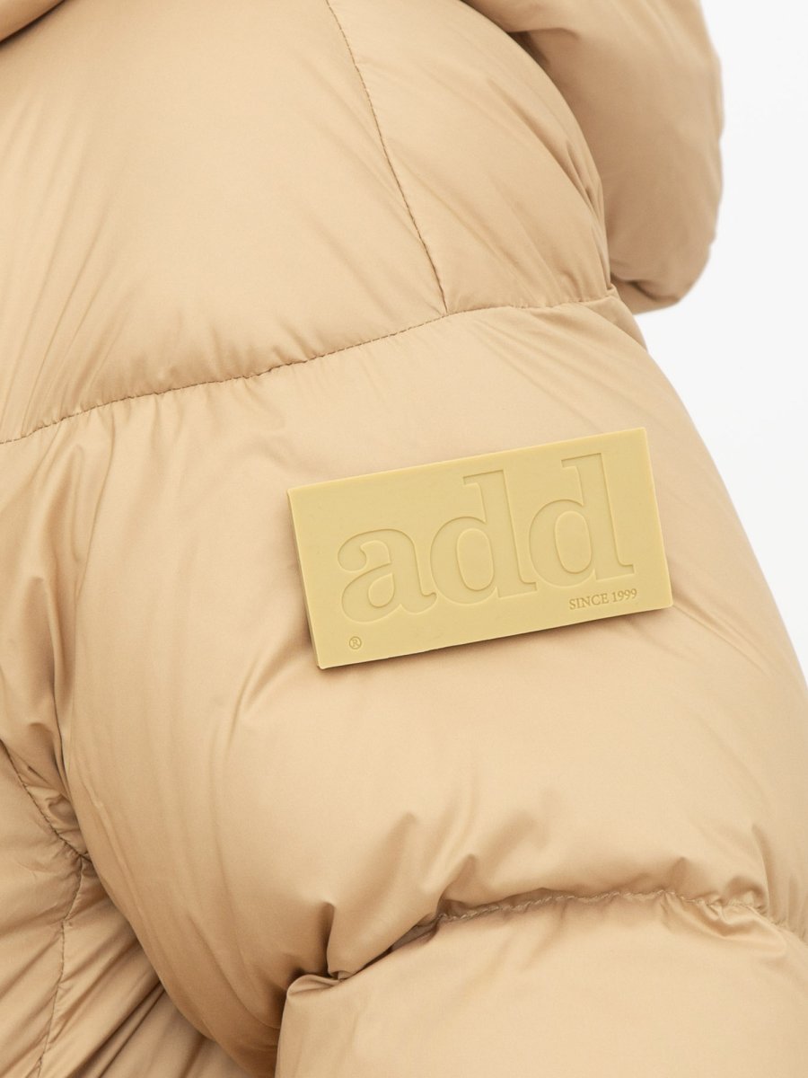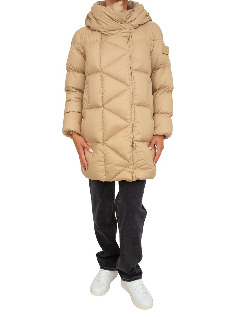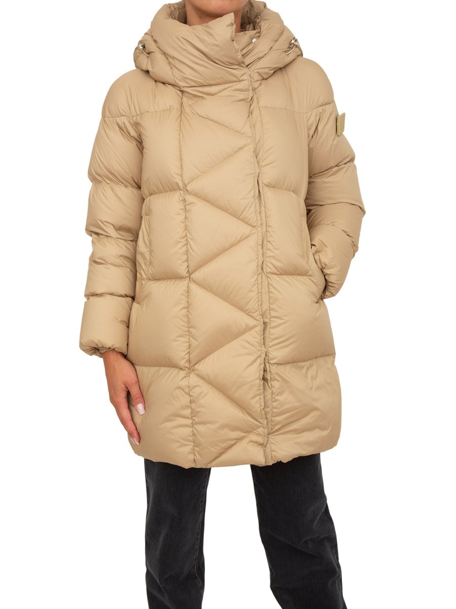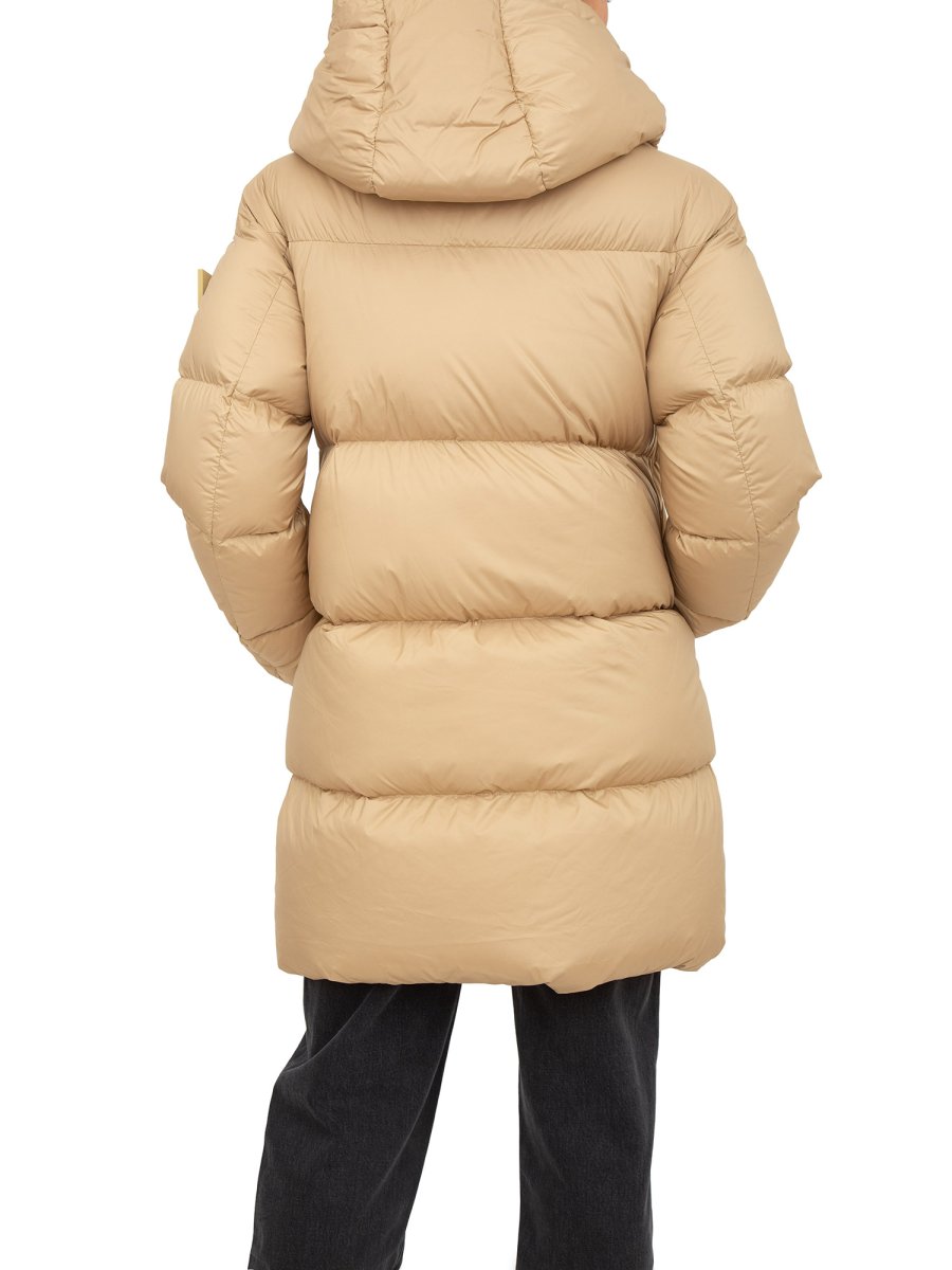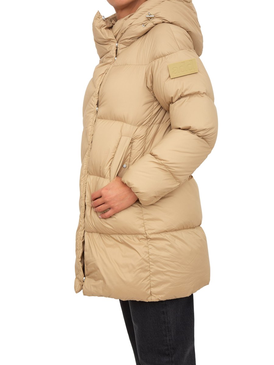 Piumino lungo ADD con cappuccio chiusura frontale con patta coprizip e bottoni automatici a scomparsa, zip in metallo a doppio cursore.