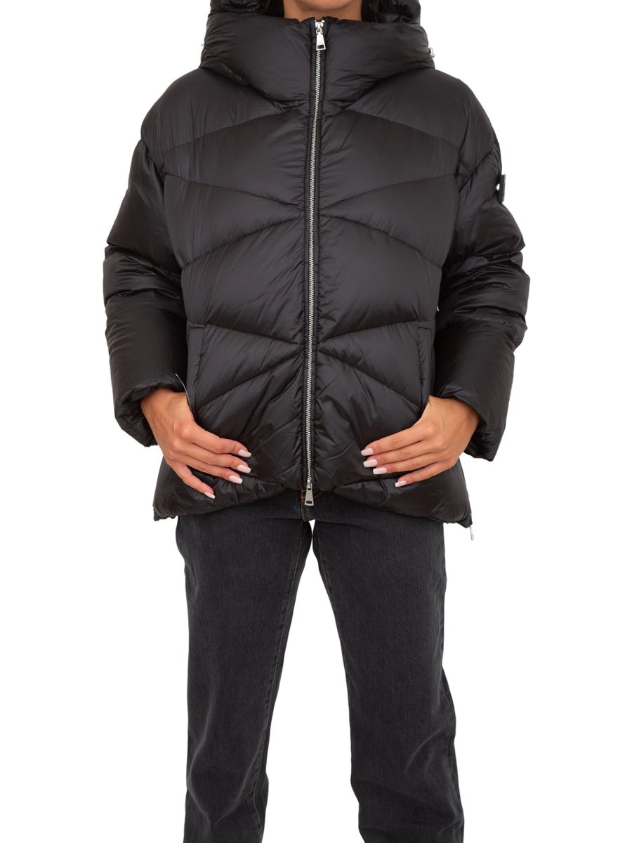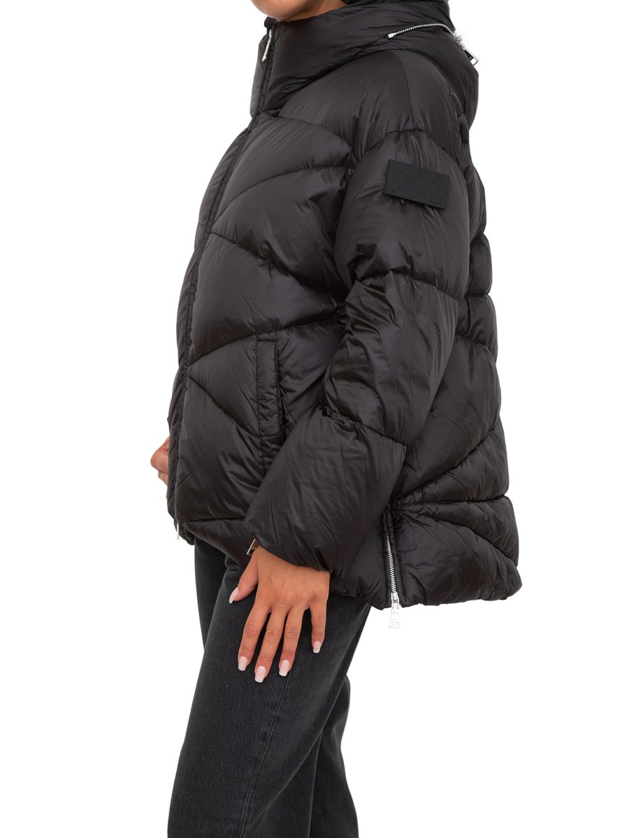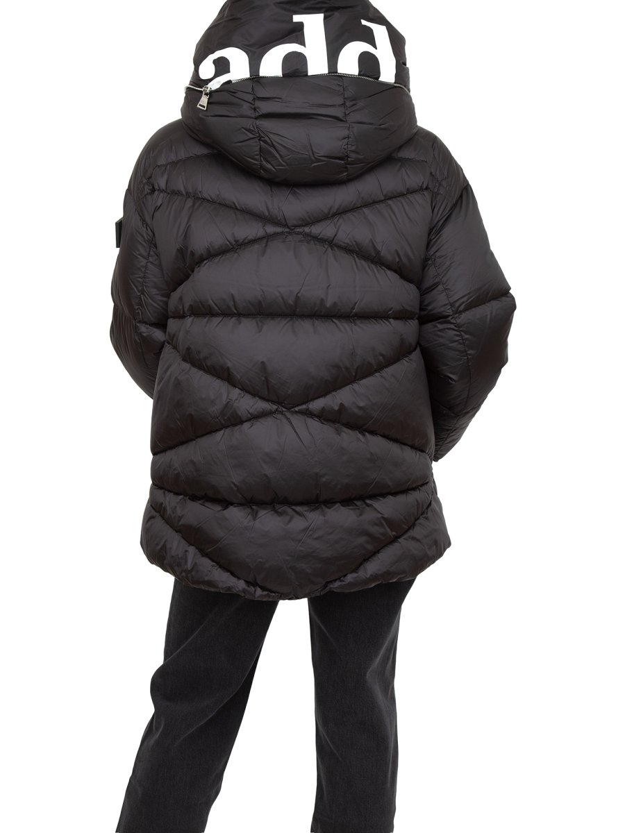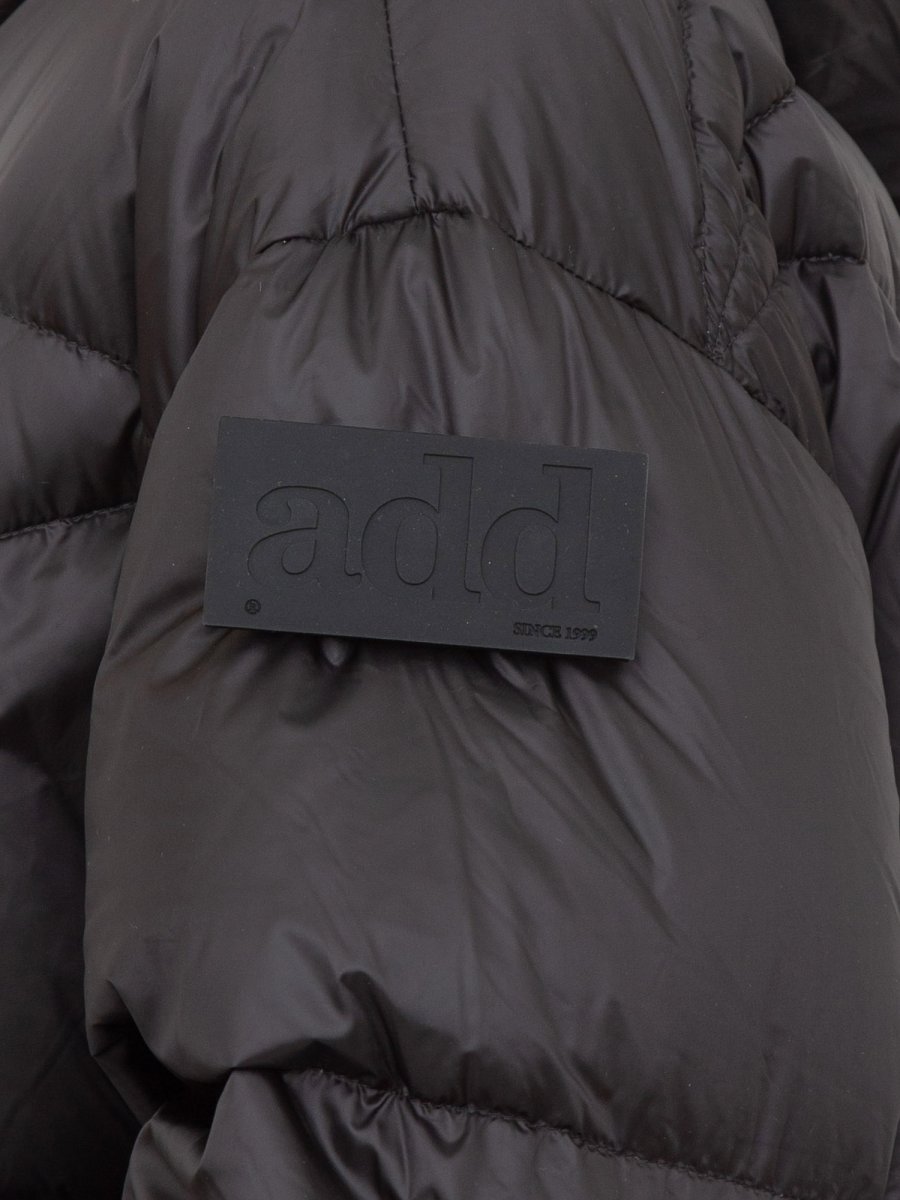 Piumino ADD con collo alto e cappuccio, due tasche laterali con pattina e bottone automatico a scomparsa e chiusura frontale con zip in metallo a doppio cursore.