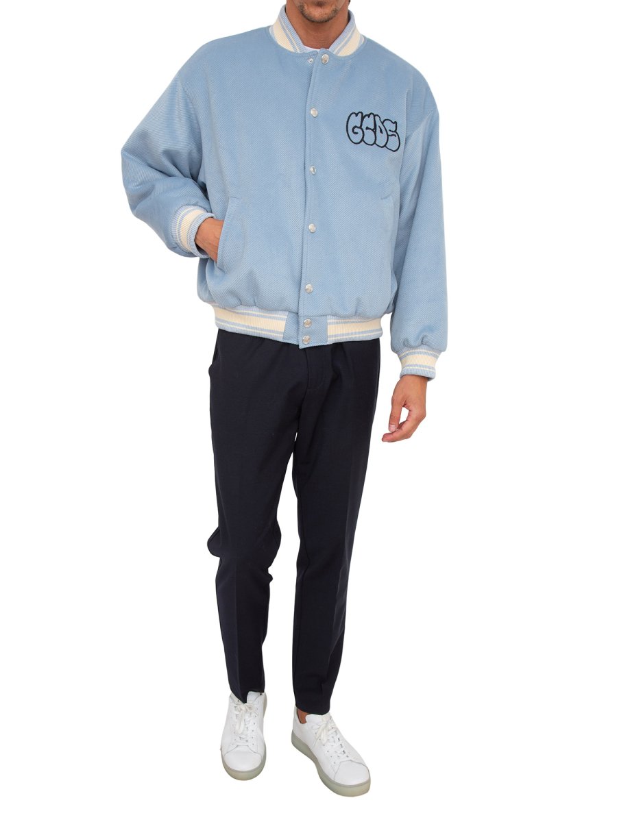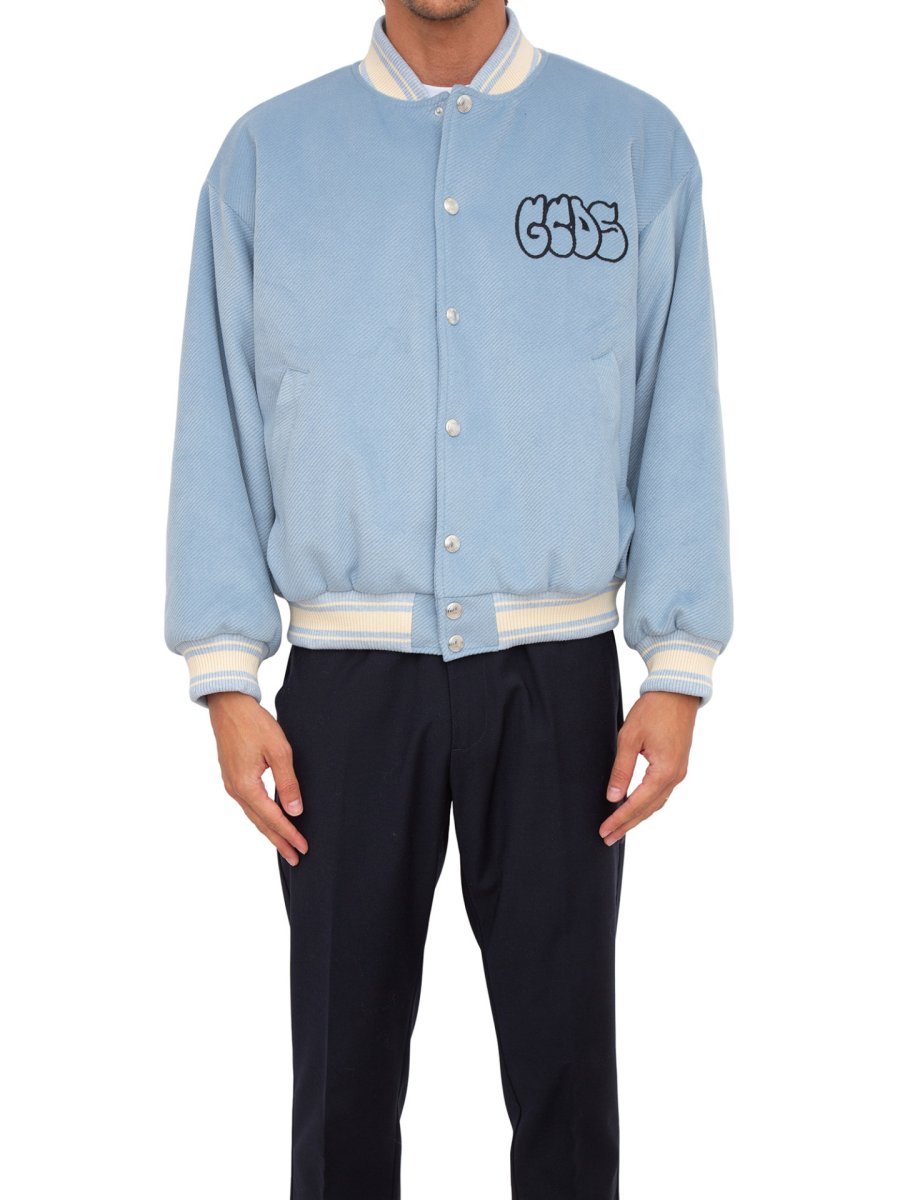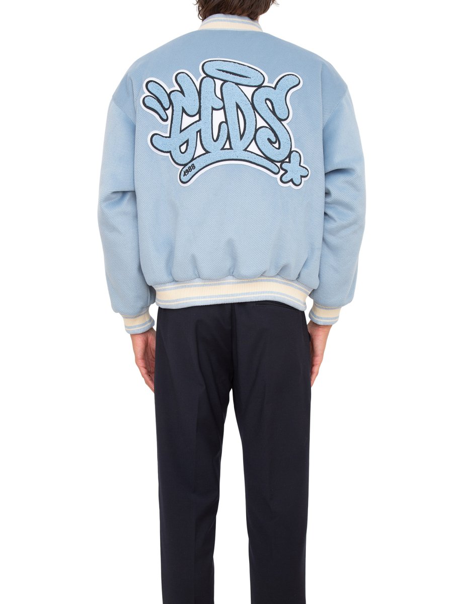 Bomber GCDS con collo rotondo e maniche lunghe. Orli a coste con dettaglio di striscia a contrasto. Tasche laterali a filetto e chiusura frontale con bottoni metallici a pressione. Il capo è completato dal logo GCDS ricamato sulla parte anteriore e da una maxi patch "GCDS Graffiti" sul retro.