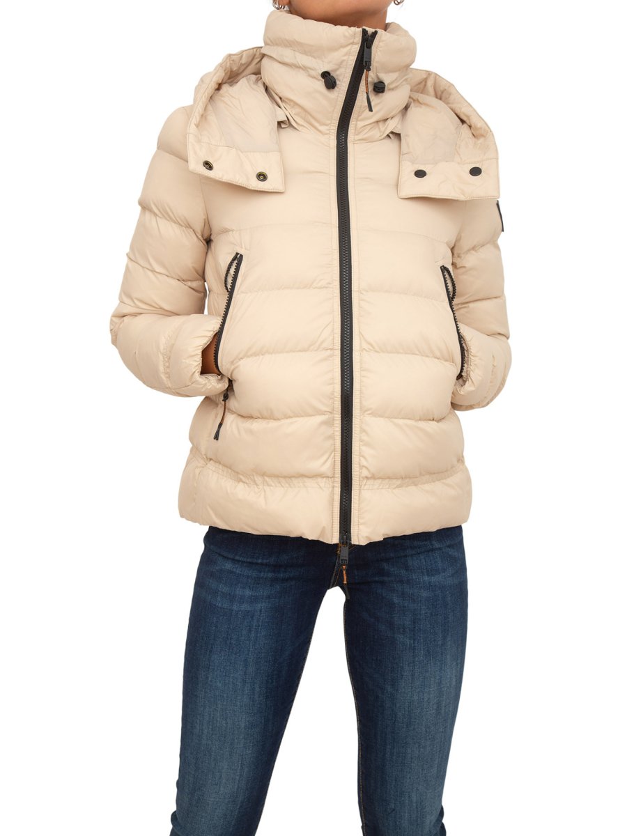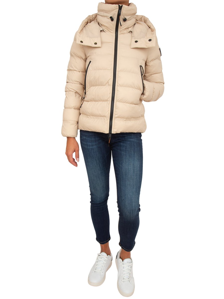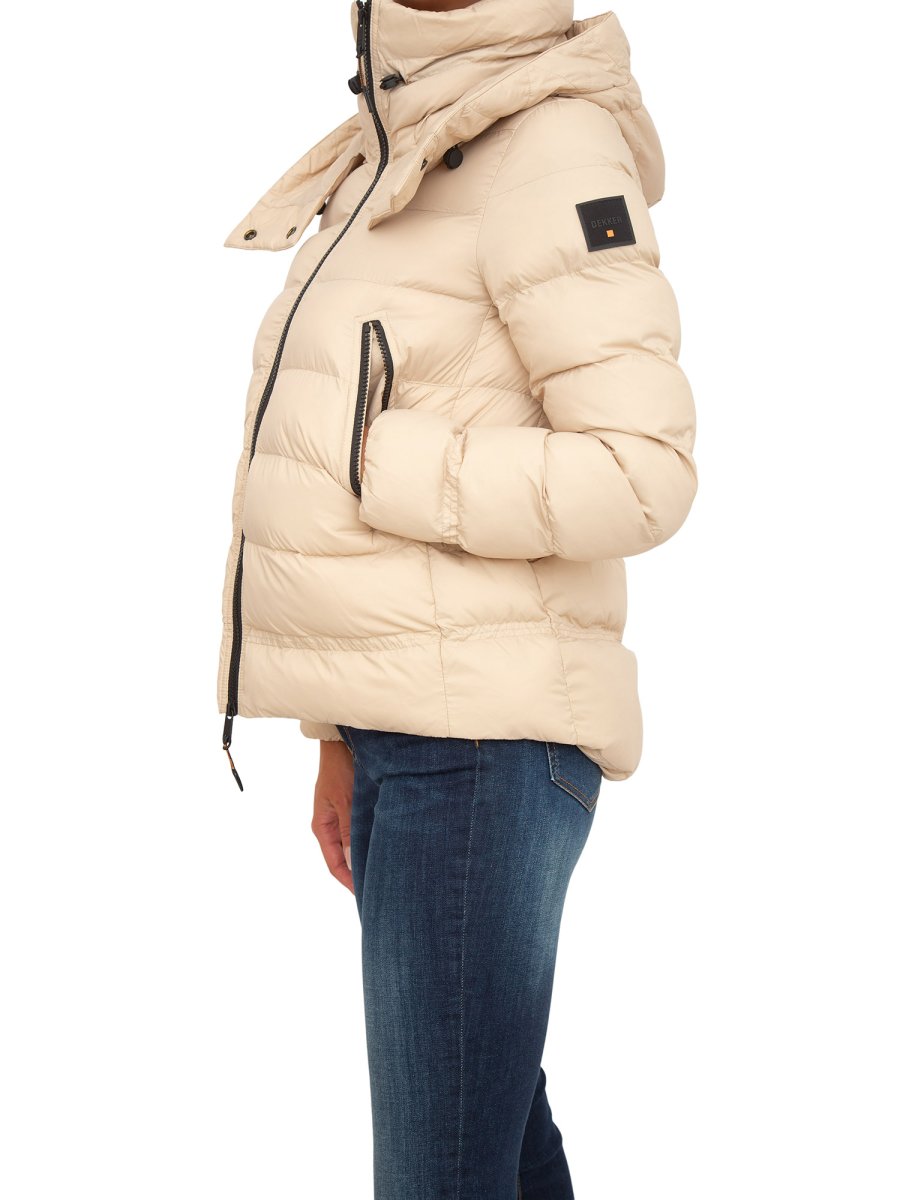 Piumino corto Dekker dalla linea leggermente svasata e semi opaco realizzato in nylon semi-opaco superleggero 20 denari, dal peso di soli 40 grammi. Ampio collo in piedi, cappuccio staccabile.