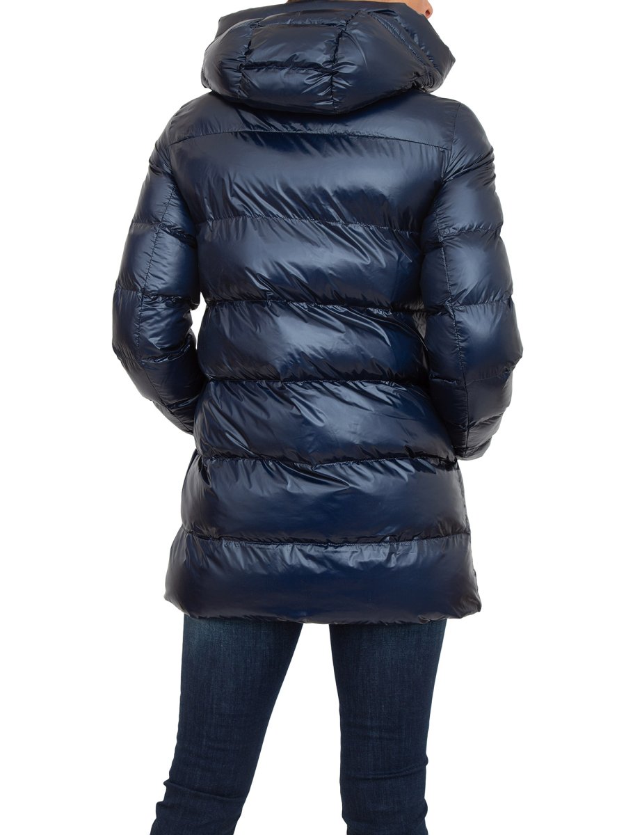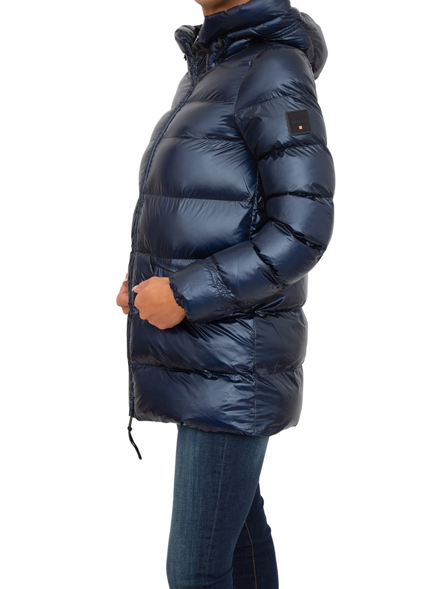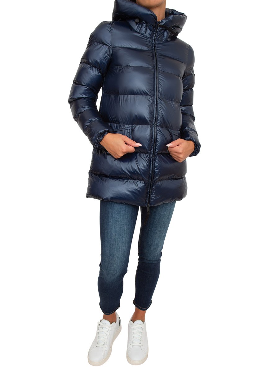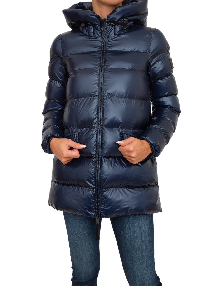 Piumino Dekker trapuntato a canali di media lunghezza dalla linea diritta, in nylon laqué ottenuto per calandratura. Cappuccio fisso con regolazione con coulisse, tasche con patta e bottoni automatici. Tessuto water repellent.