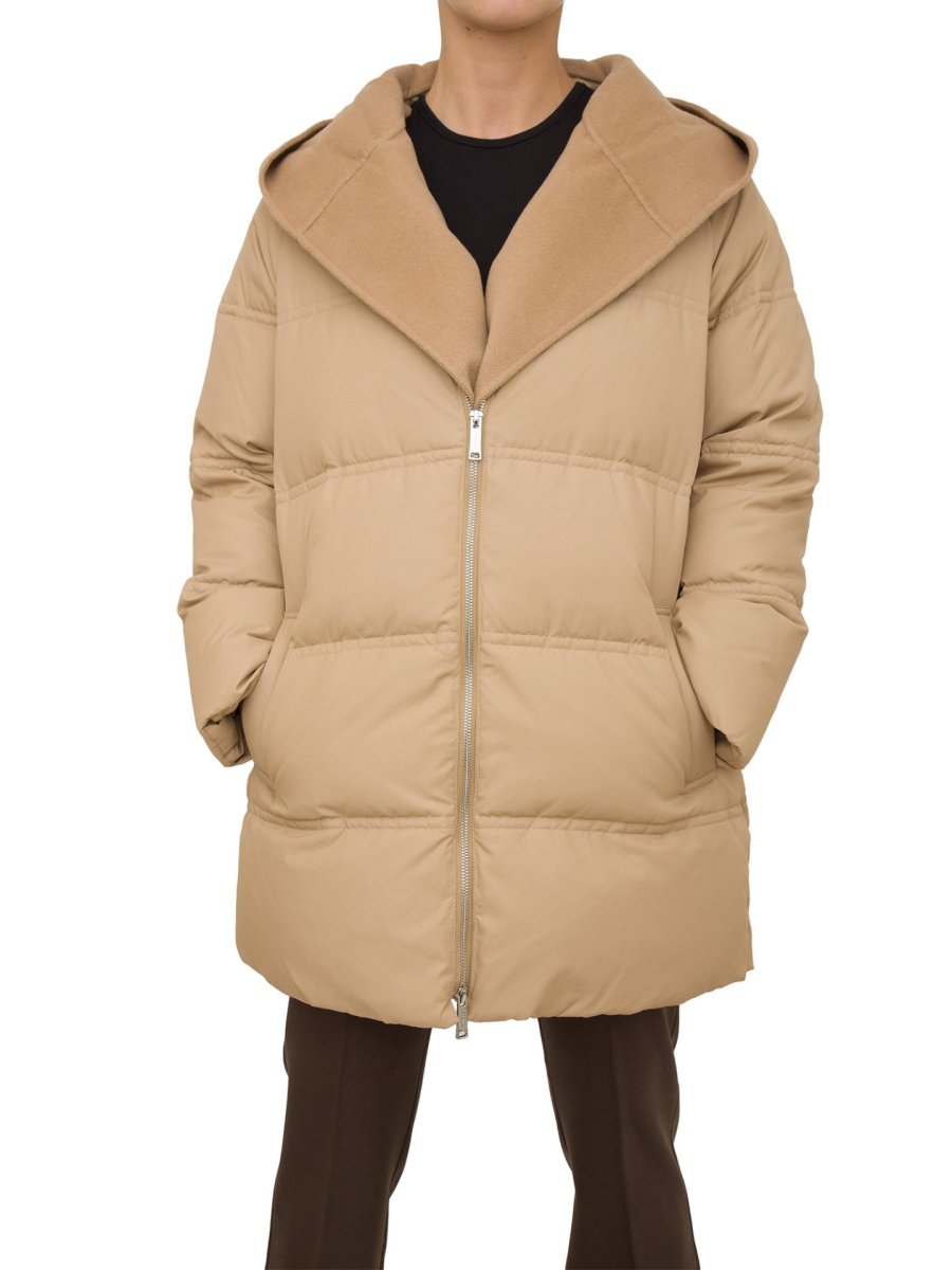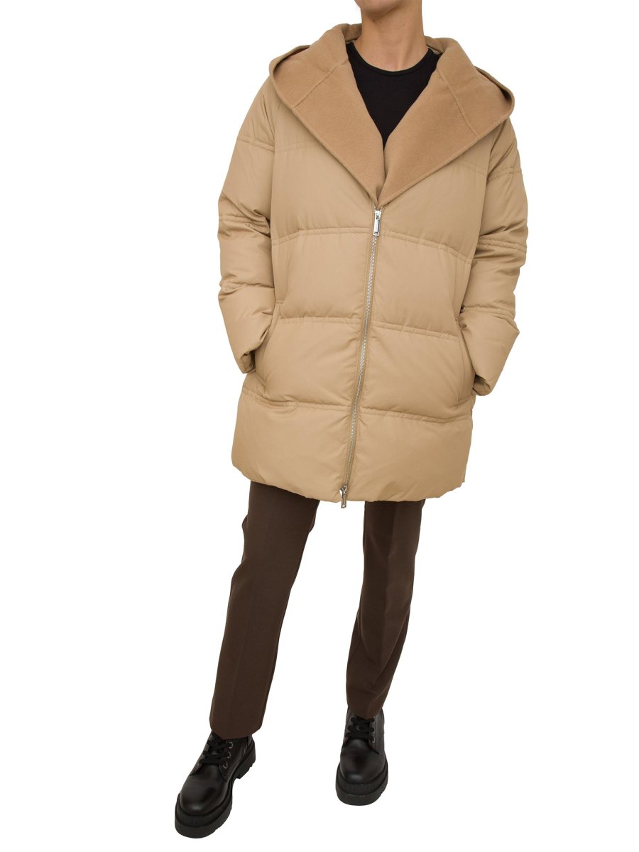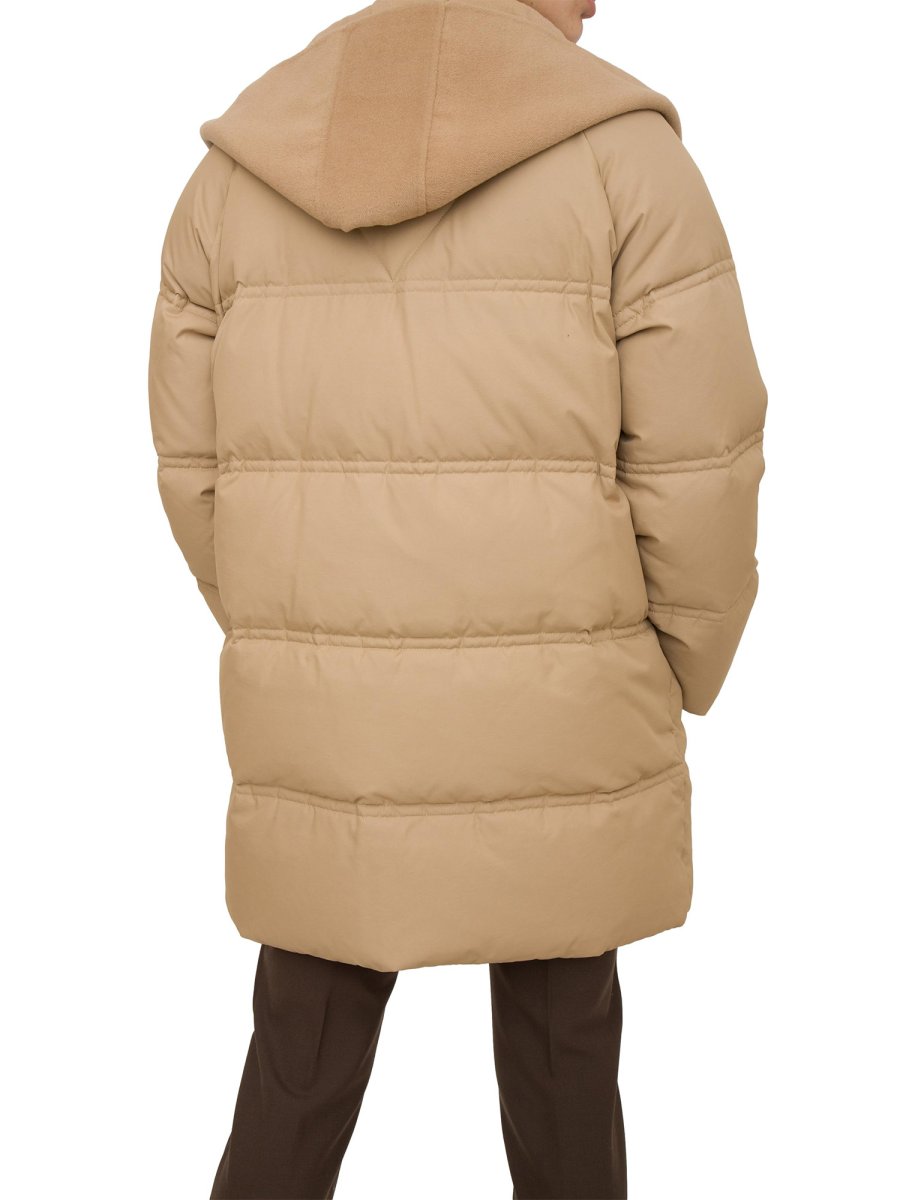 Piumino in tessuto antigoccia, linea cocoon. Collo alto con cappuccio a pettorina amovibile, maniche raglan lunghe. Chiusura con zip a doppio cursore, tasche a filetto.