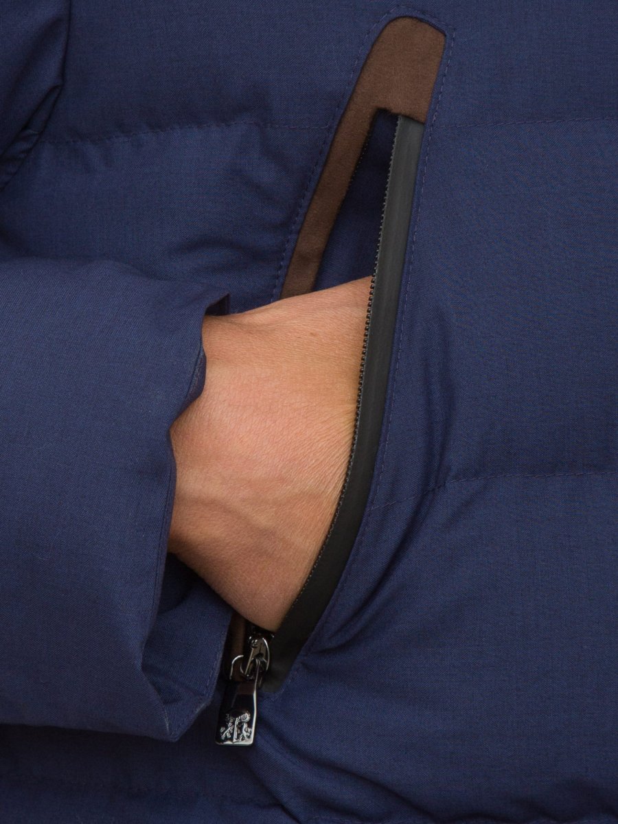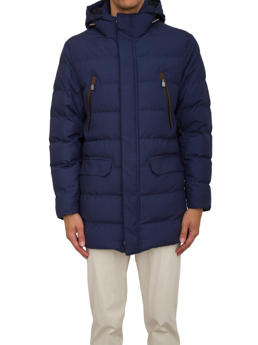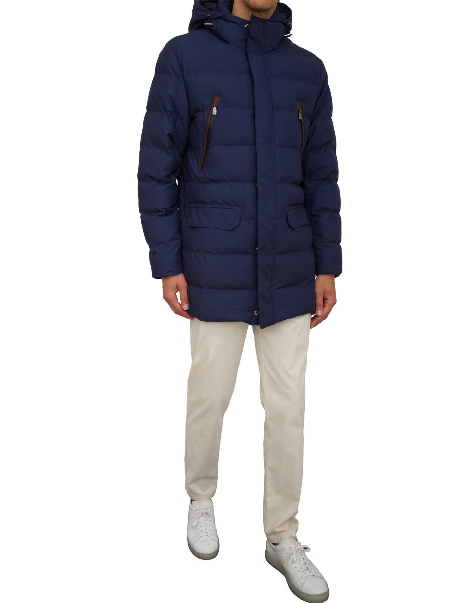 Парка з капюшоном з водовідштовхувального технічного попліну, наповненого справжнім гусячим пухом Corneliani. Одяг має стьобання в горизонтальну смужку, передню застібку-блискавку з подвійним ковзунком і прихованими кнопками, дві передні похилі прорізні кишені, дві кишені з клапанами, нижню частину рукава з трикотажним внутрішнім зап’ястям і контрастну внутрішню підкладку з легкого нейлону.