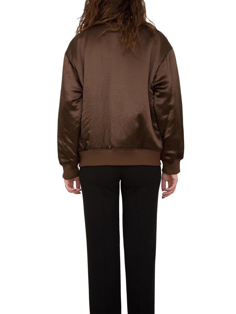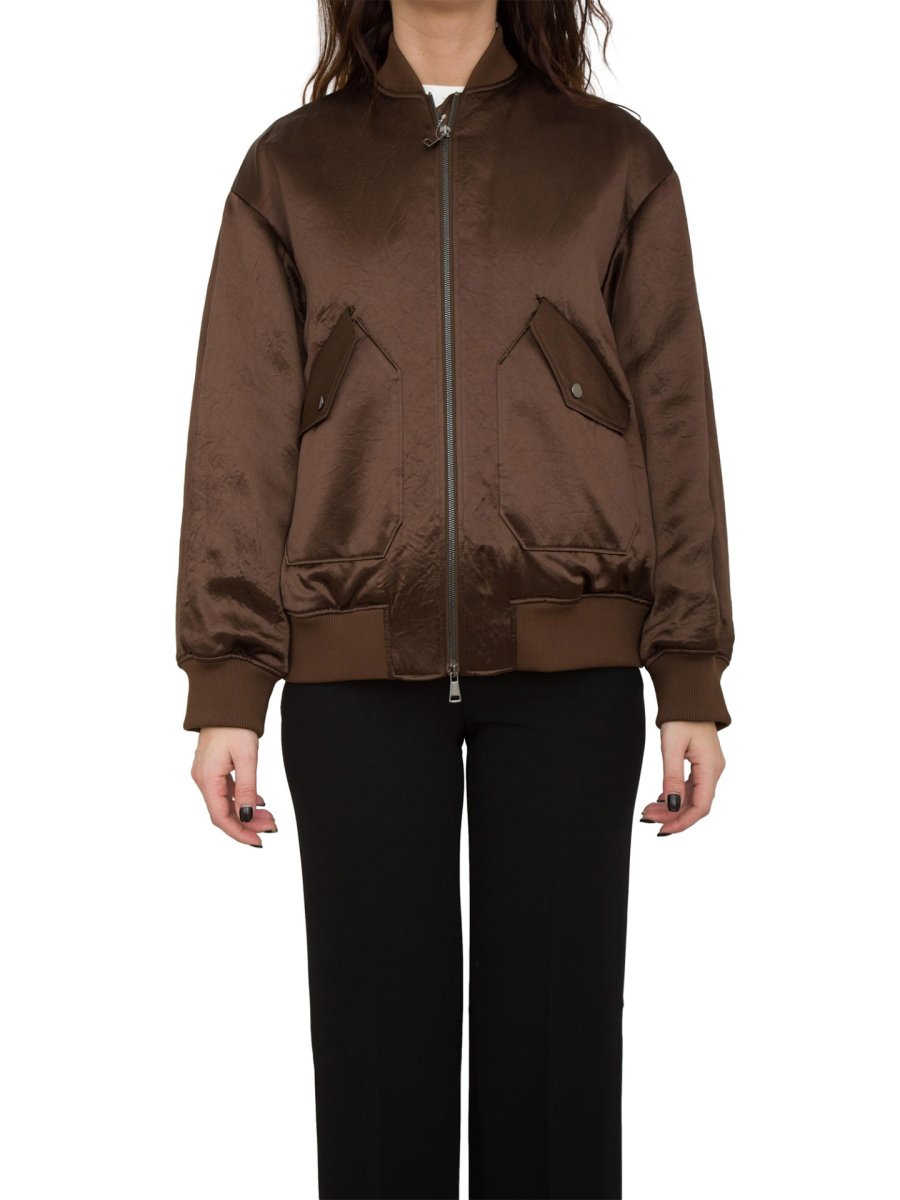 Куртка-бомбер вільного крою з ацетатного атласу з довгими заниженими рукавами, накладними кишенями з косим клапаном та кнопкою. Доповнено класичною резинкою на комірі, манжетах та подолі. Внутрішня підкладка із надтонкої ізолюючої тканини Luxepad щільністю 80 г призначена для збереження та оптимізації тепла тіла навіть за низьких температур. Застібка-блискавка спереду.