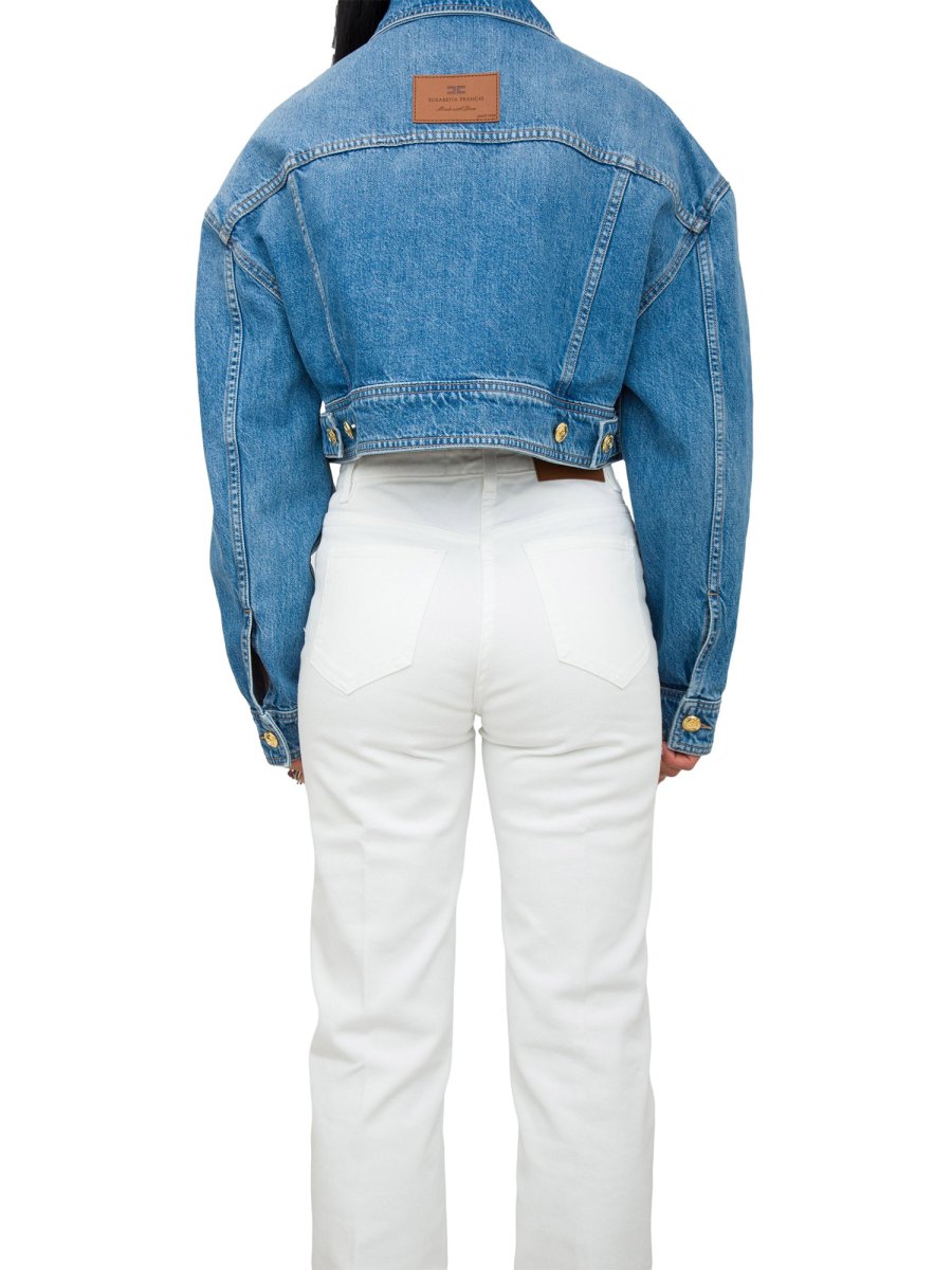 Укорочена джинсова куртка з приспущеними плечима та об'ємними рукавами. Інтерпретація класичної куртки далекобійника, виконана зі стираного деніму зі строчками тютюнового кольору та золотистими металевими гудзиками з логотипом. Прикрашена квіткою з тієї ж тканини.