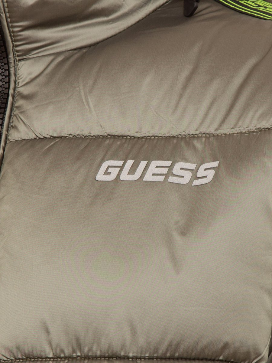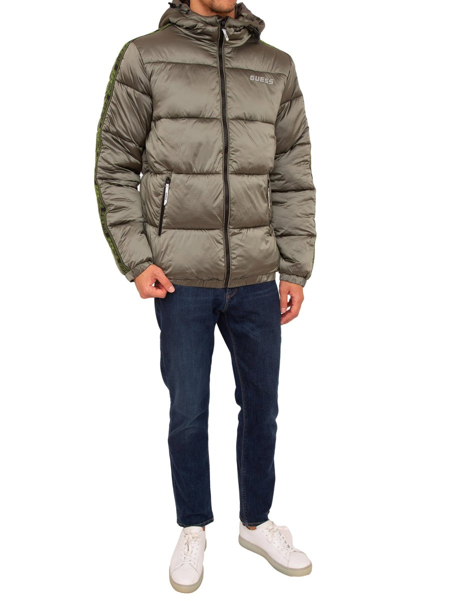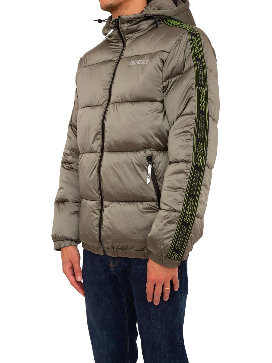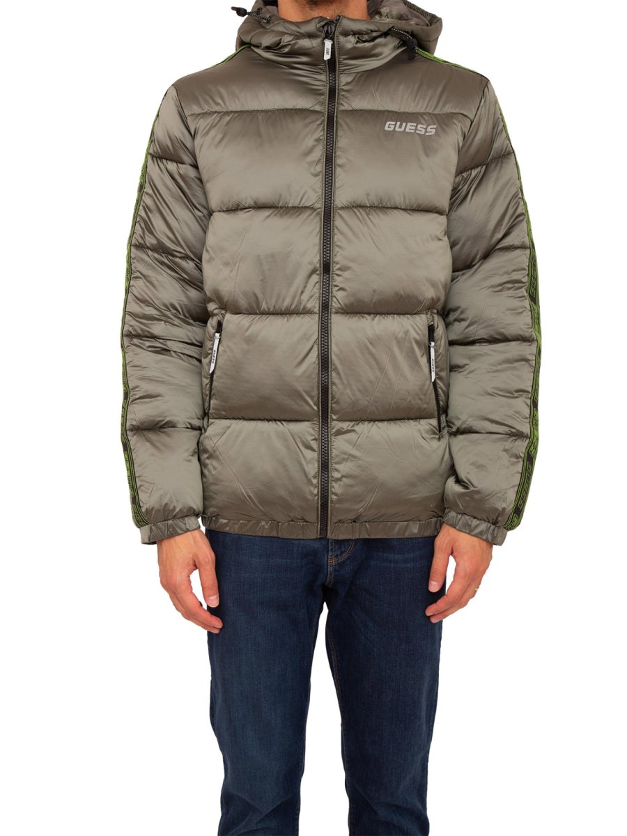 Piumino da uomo Guess Jeans con banda logata laterale, tessuto sintetico, scollo tondo con cappuccio, maniche lunghe, vestibilità regular e chiusura con cerniera lampo frontale.