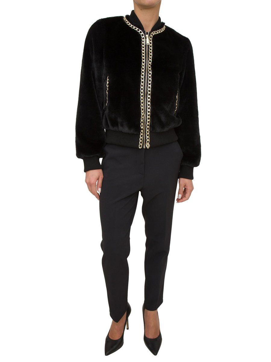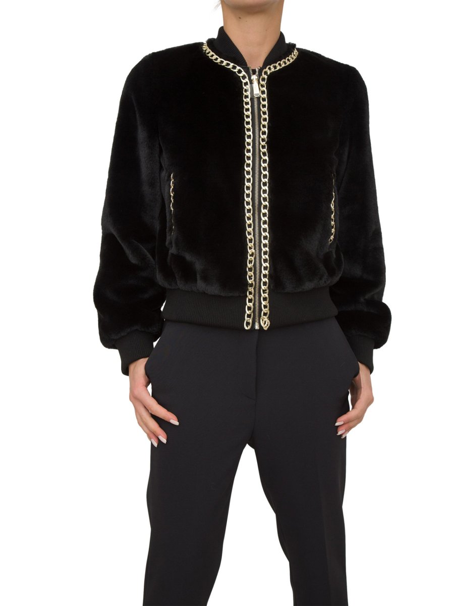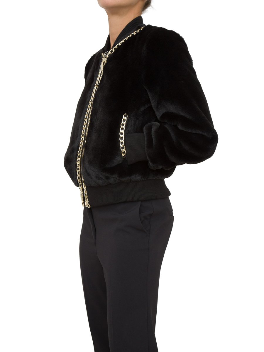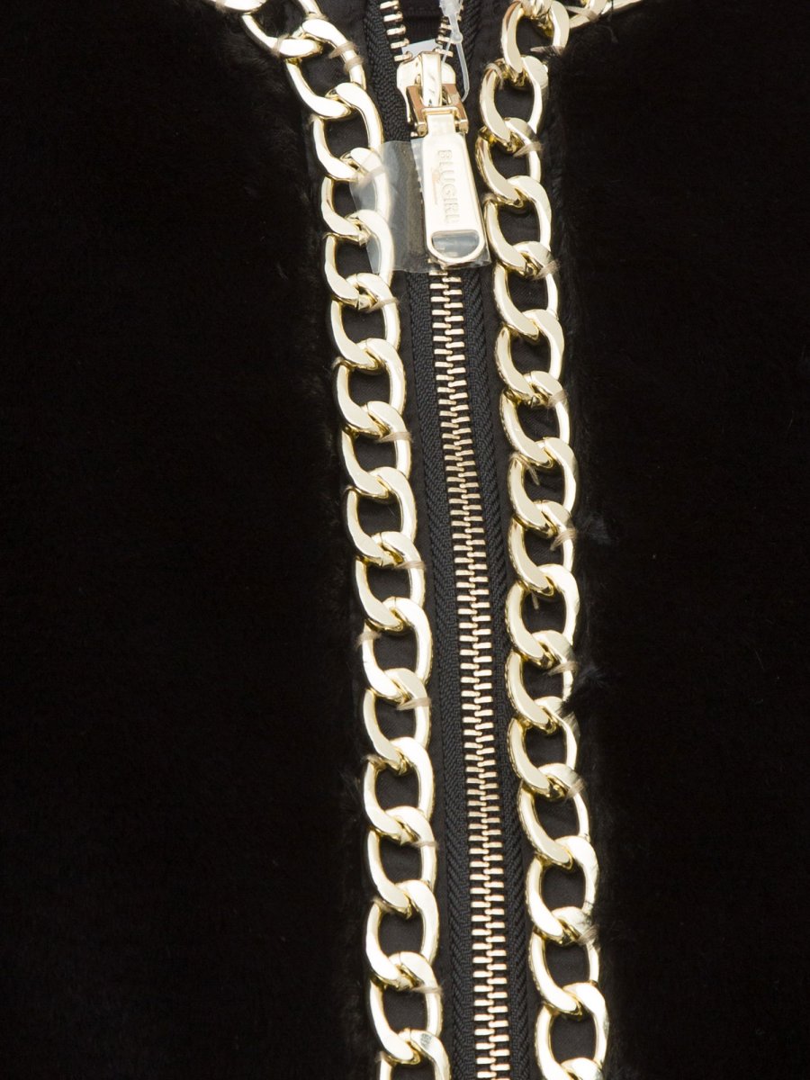 Giubbino BLUGIRL in eco pelliccia. Bordi rifiniti con catenella color oro. Due tasche sui lati. Maniche lunghe con polsi e coste. Chiusura con zip.