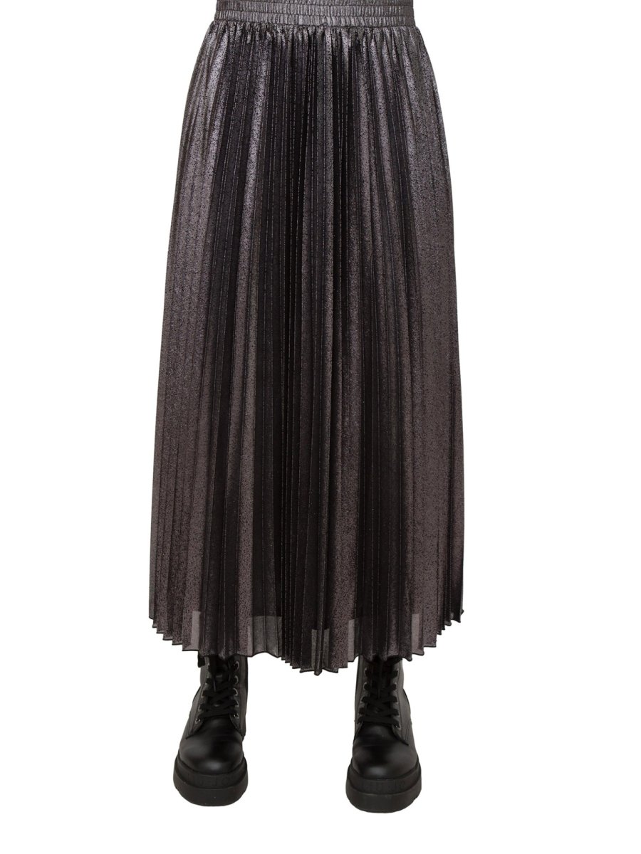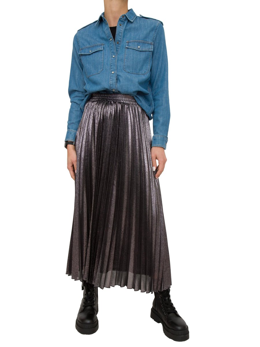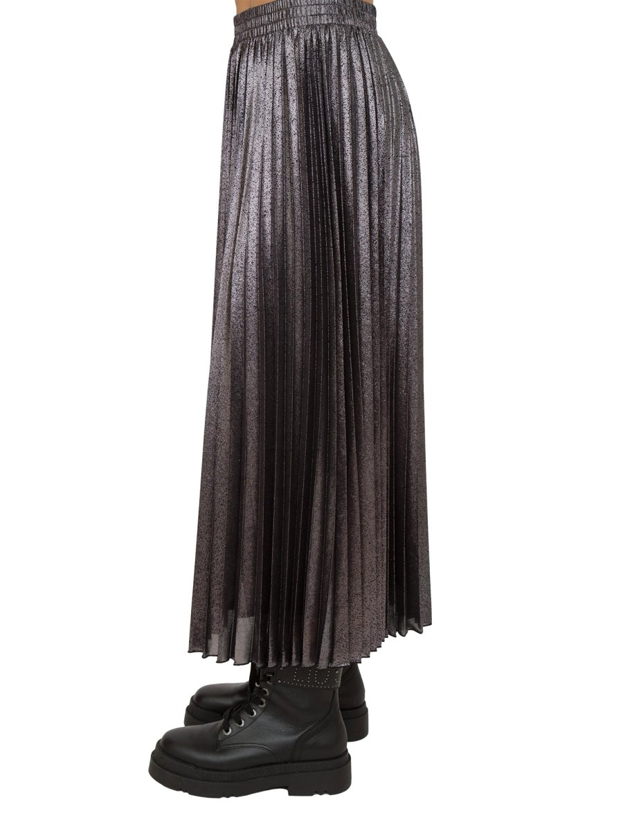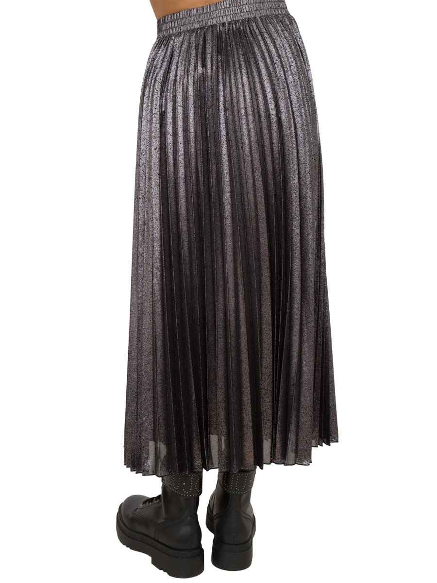 Gonna lunga in georgette laminata, linea leggermente svasata plissettata. Vita elastica. Foderata.
