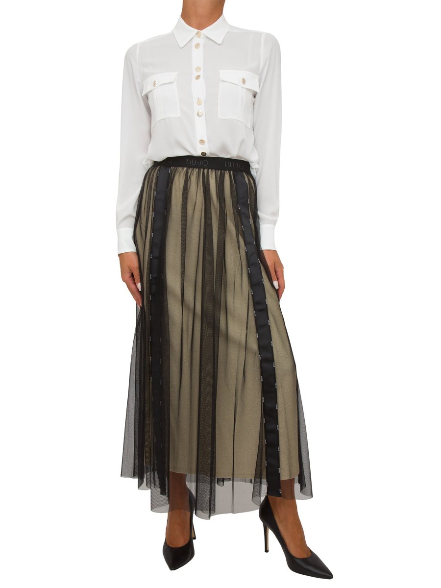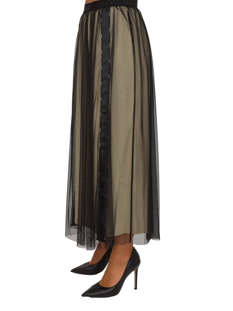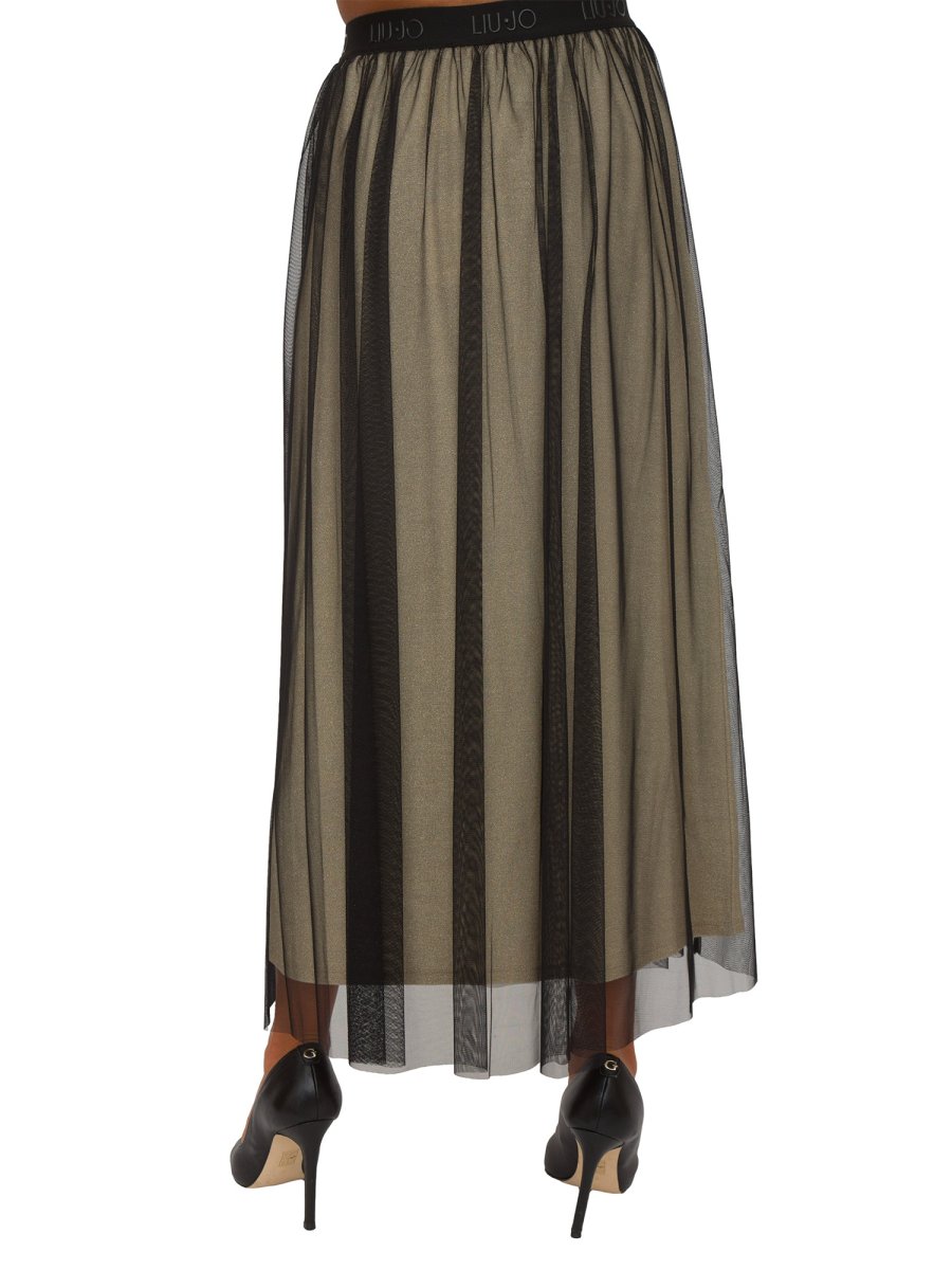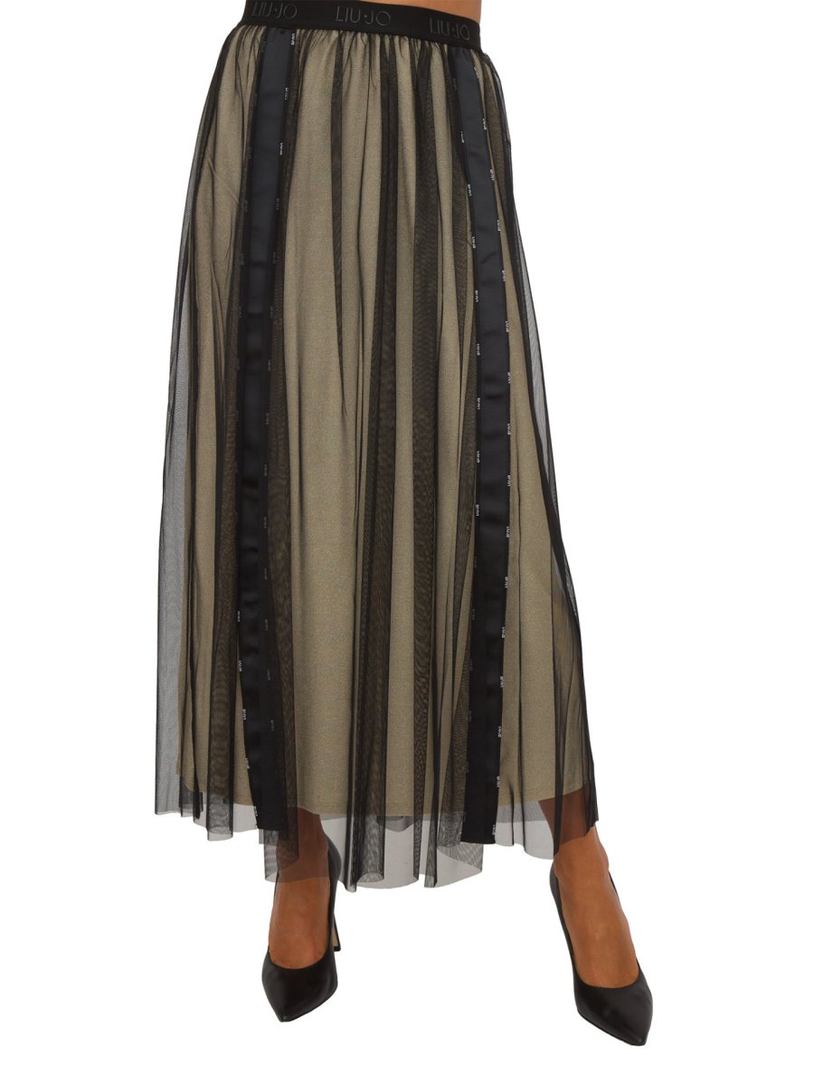 Gonna lunga LIU-JO in tulle, Fodera in jersey, Interventi in lurex®, piping logato e cintone elastico logato in vita.