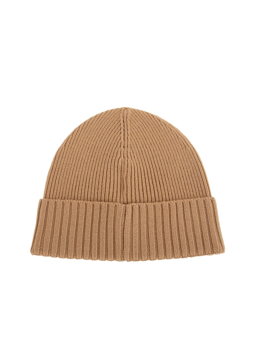 Berretto BOSS in lana con lavorazione a coste all-over e targhetta con logo in similpelle.