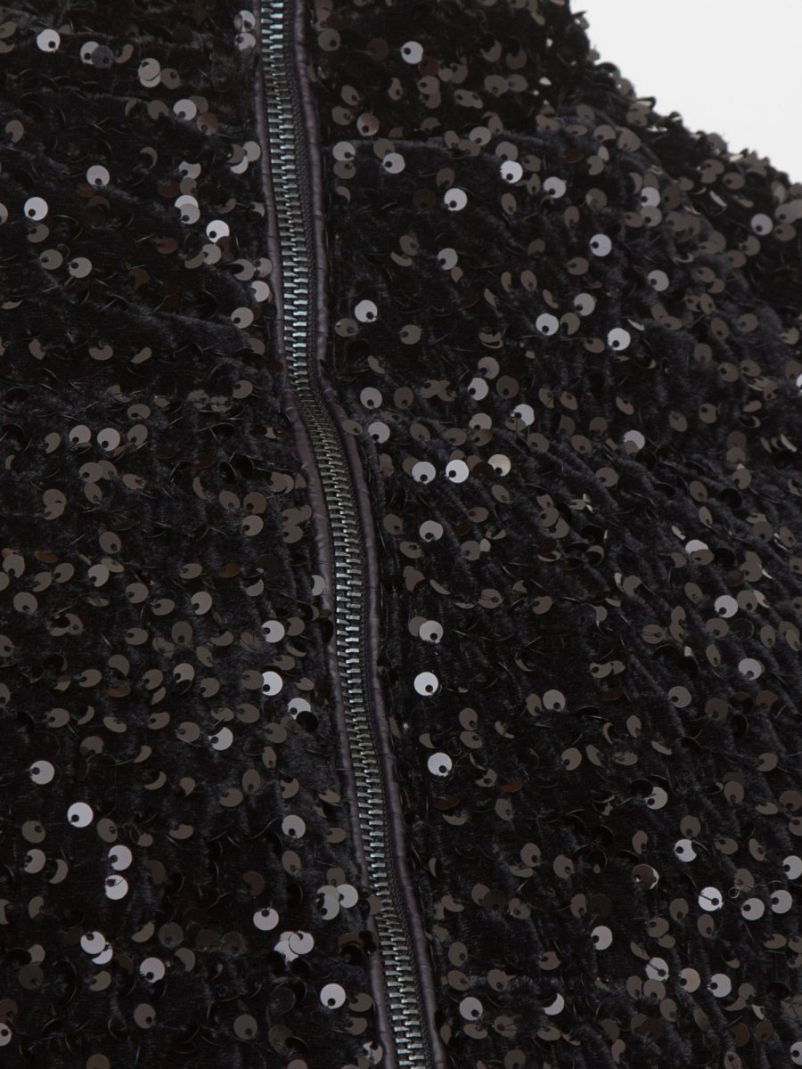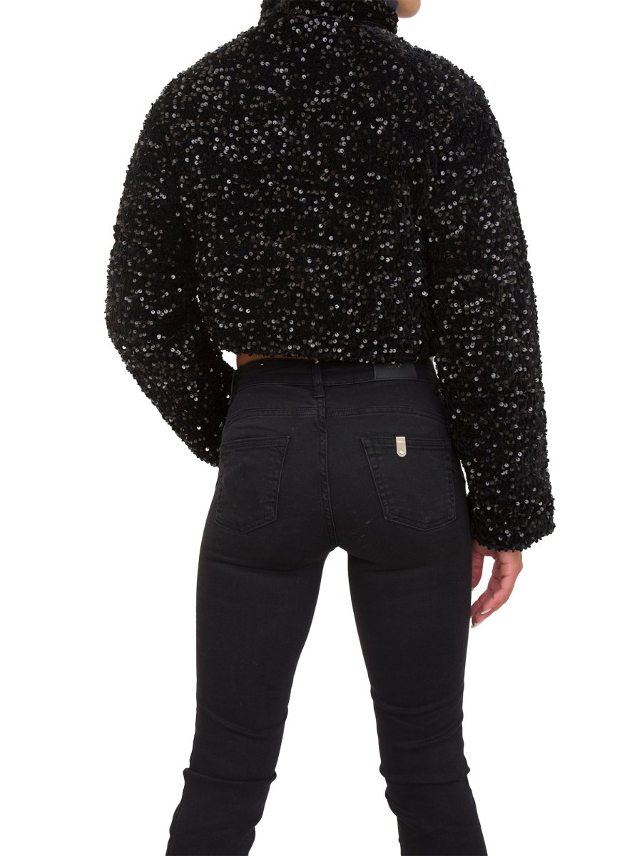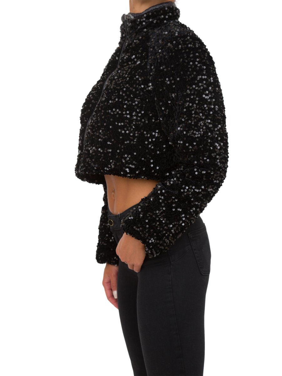Giacca da donna Liu-jo in velluto e paillettes, imbottitura in ovatta, collo alto, logo in metallo sul retro e chiusura con zip.