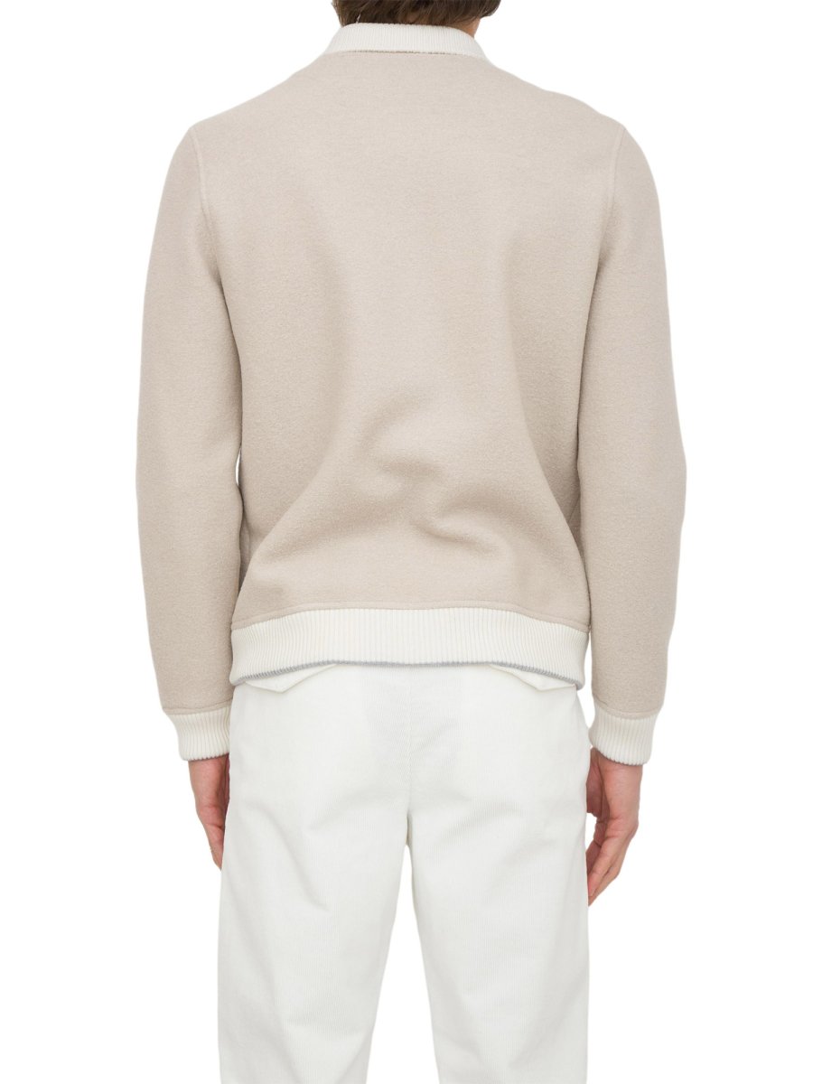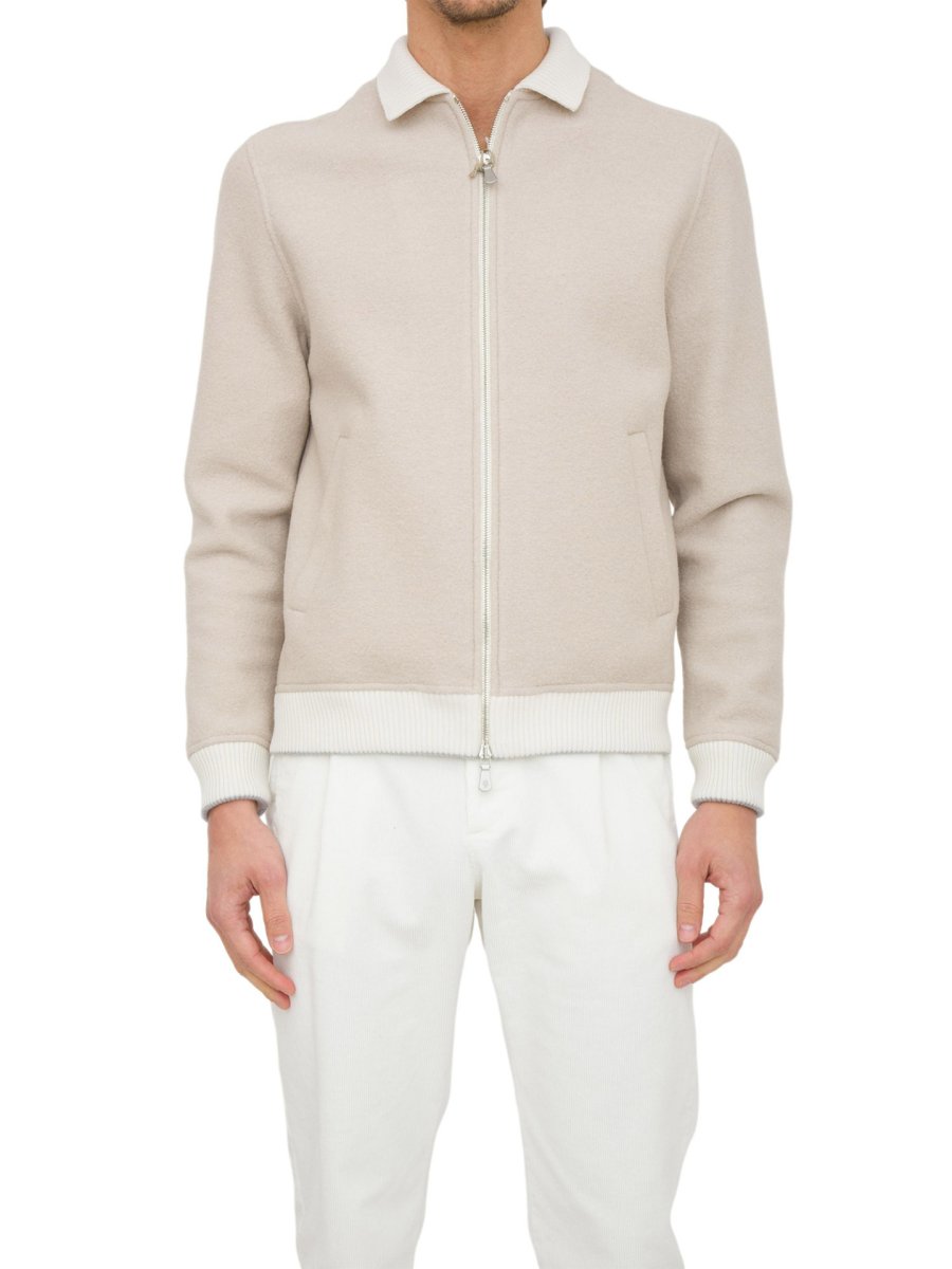 Giubbino da uomo Eleventy full zip collo polo combina il tessuto lana cotta con il filato cashwool 100% lana. L'iconico tipping a contraasto su fondo e polsi evidenzia la cura che Eleventy pone in ogni dettaglio. I tirazip logati in nikel free e i bottoni automatici personalizzati completano il capospalla.