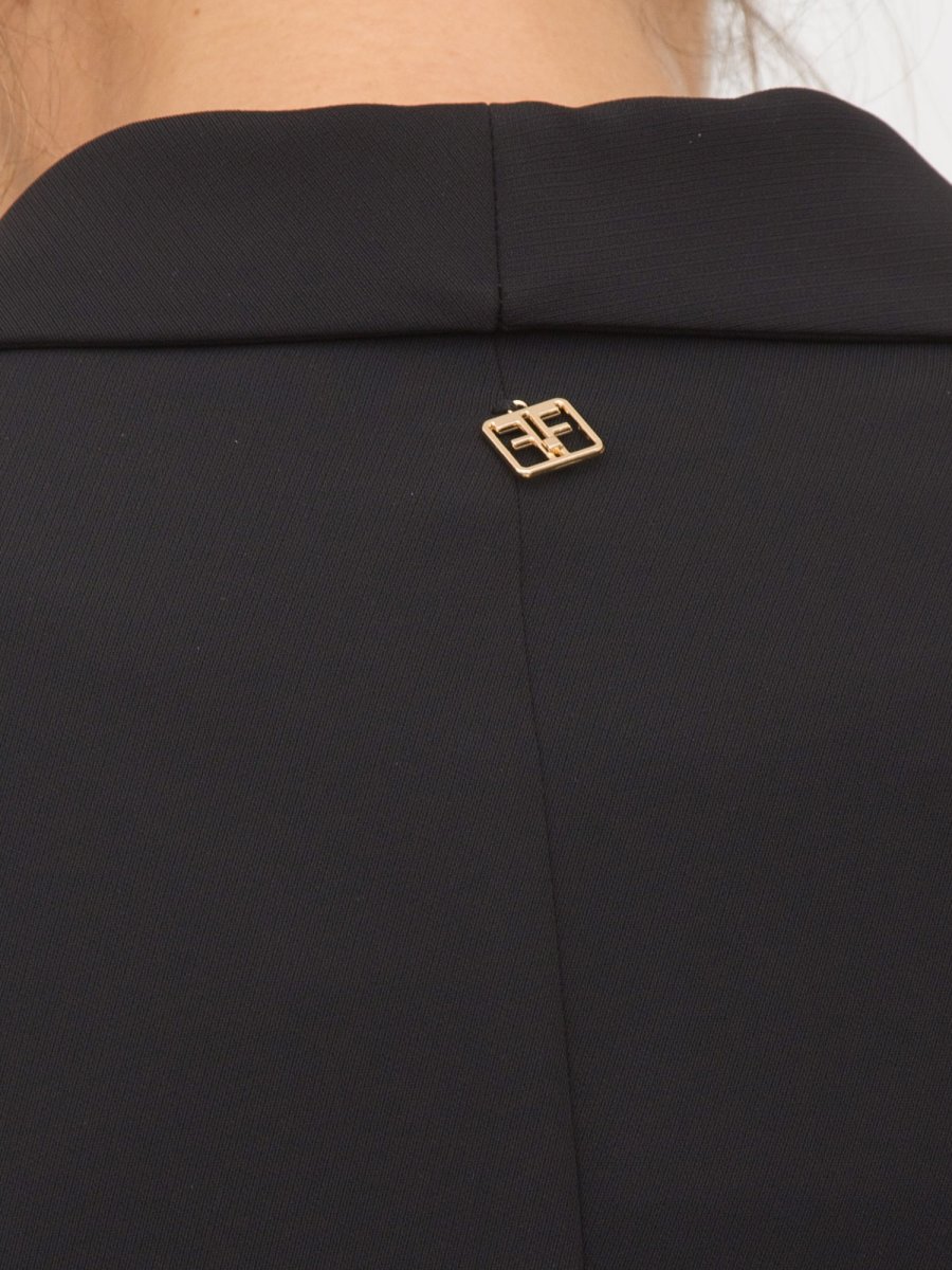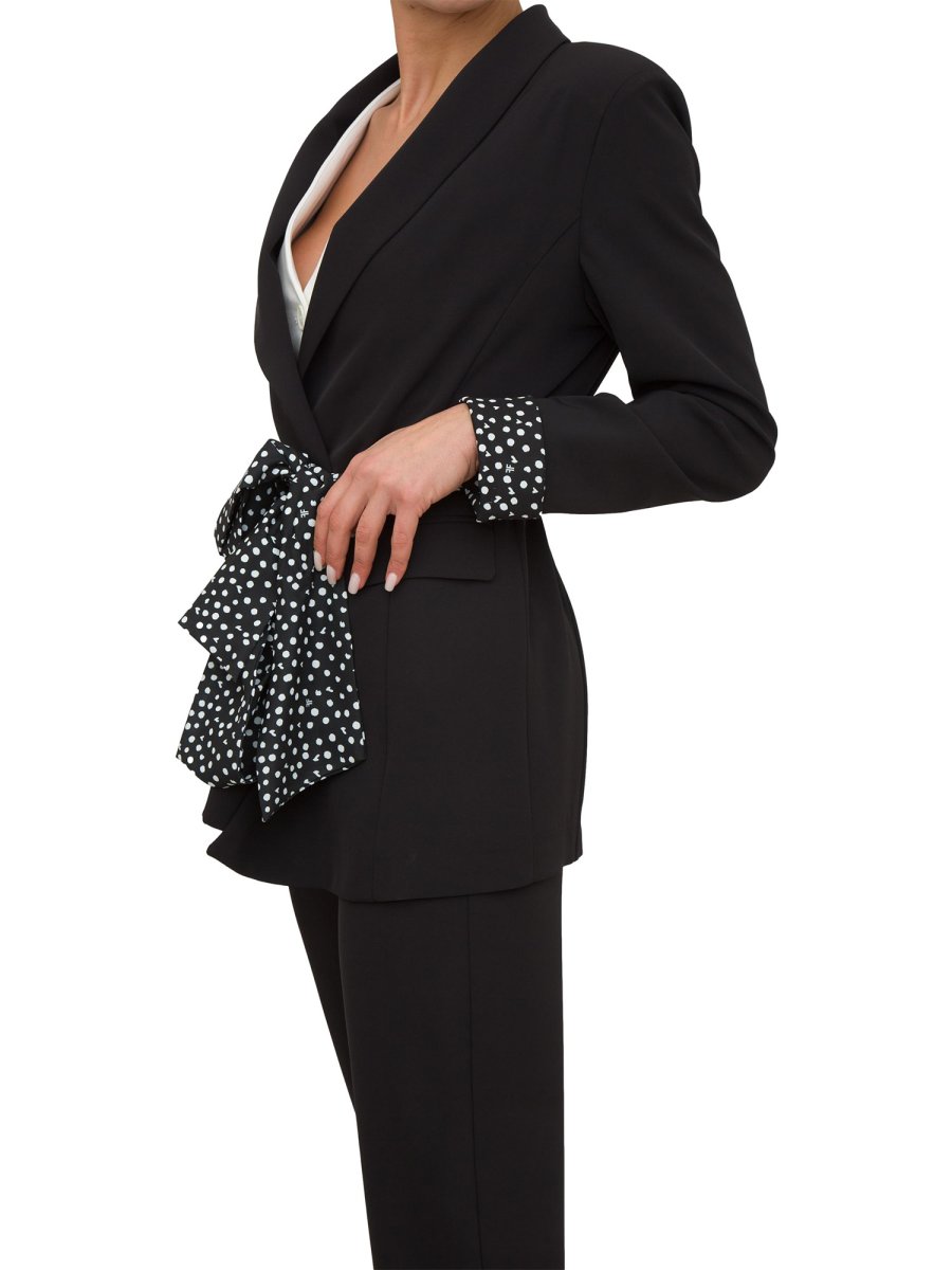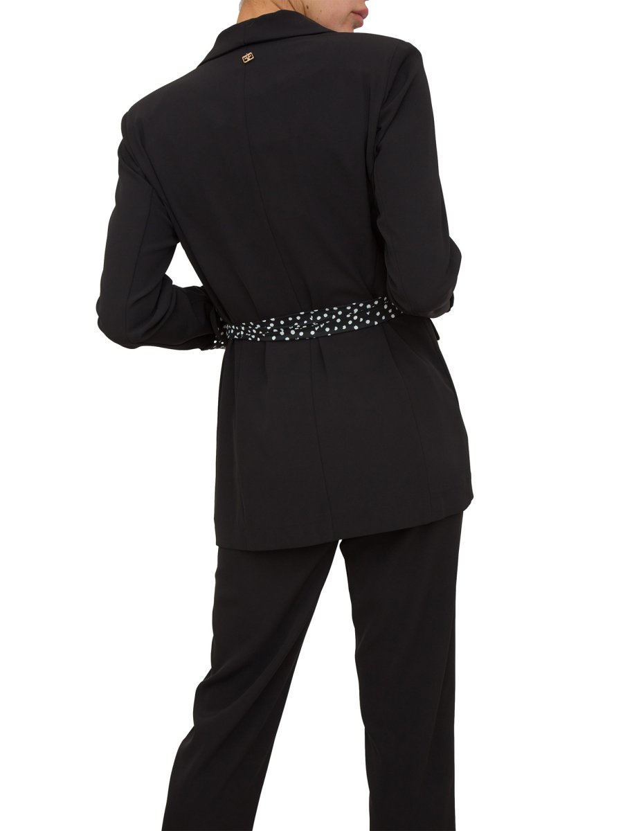 Blazer regular lungo in tessuto tecnico, revers sciallato, fusciacca in vita, tasche applicate, e con maniche lunghe.