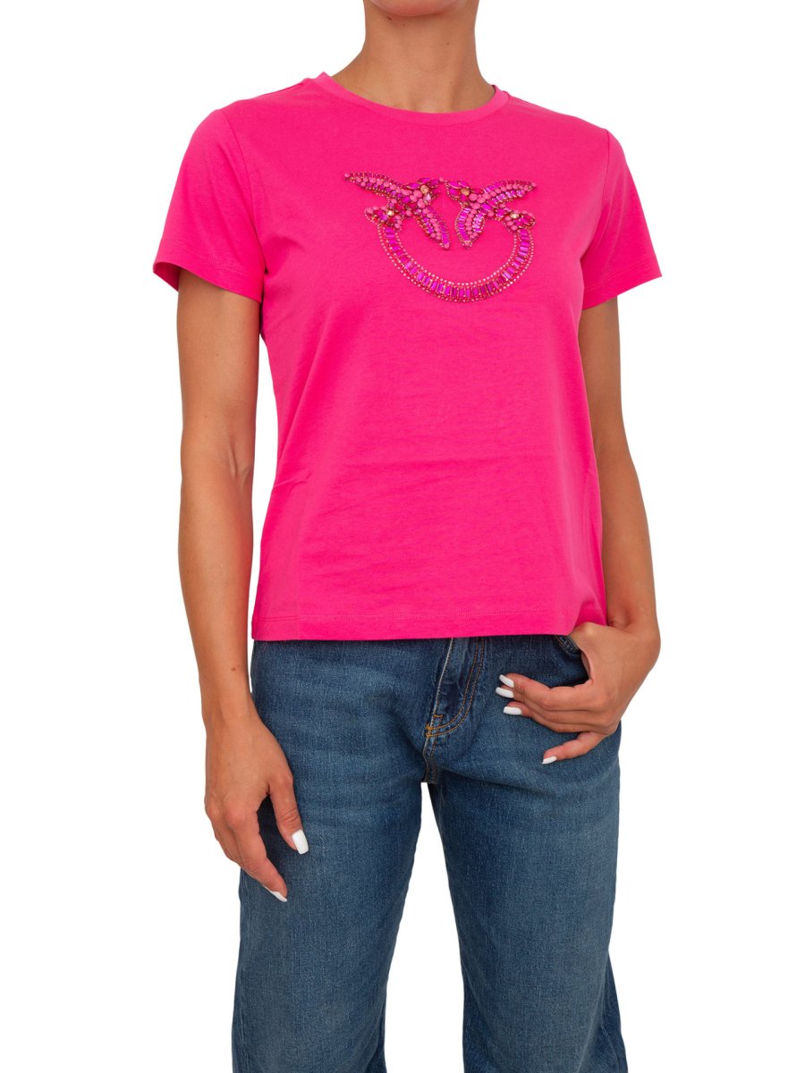 T-shirt Pinko a maniche corte in jersey di cotone con maxi ricamo gioiello Love Birds davanti.
