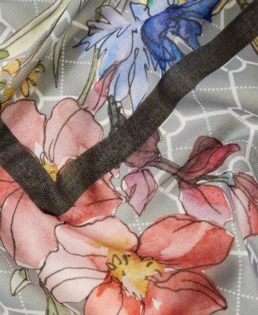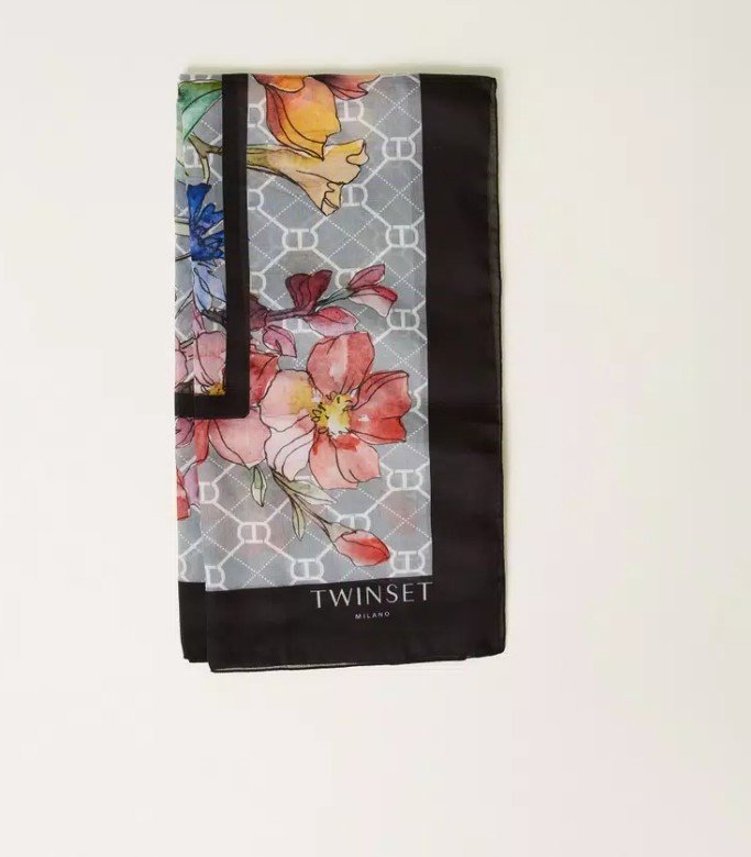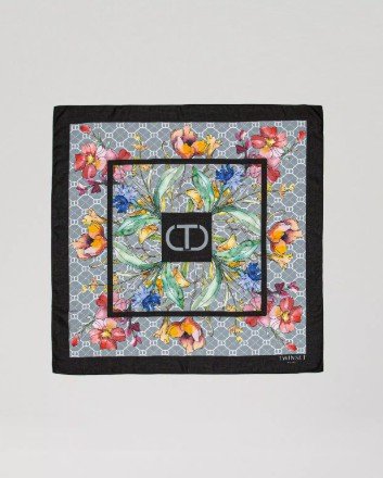 Куфія Twinset з малюнком у вигляді літери «Т» та різнокольоровими кольорами, однотонні профілі з літерами логотипу. Прекрасно виглядає як шаль або шарф. Розміри: 120x120 см.
