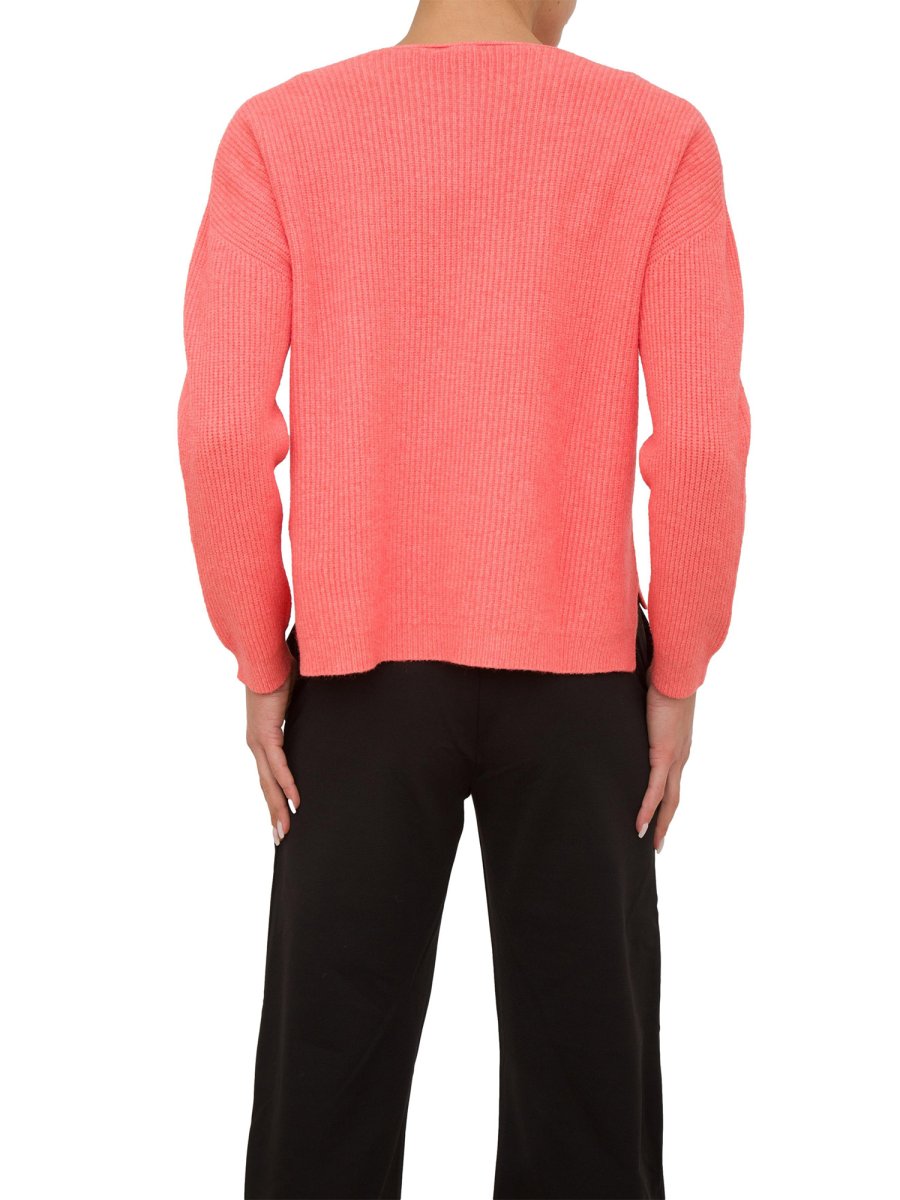 Maglia a punto pannocchia, linea boxy. Scollo rotondo, maniche lunghe con giro sceso e polsino. Spacchi laterali sul fondo, retro più lungo.